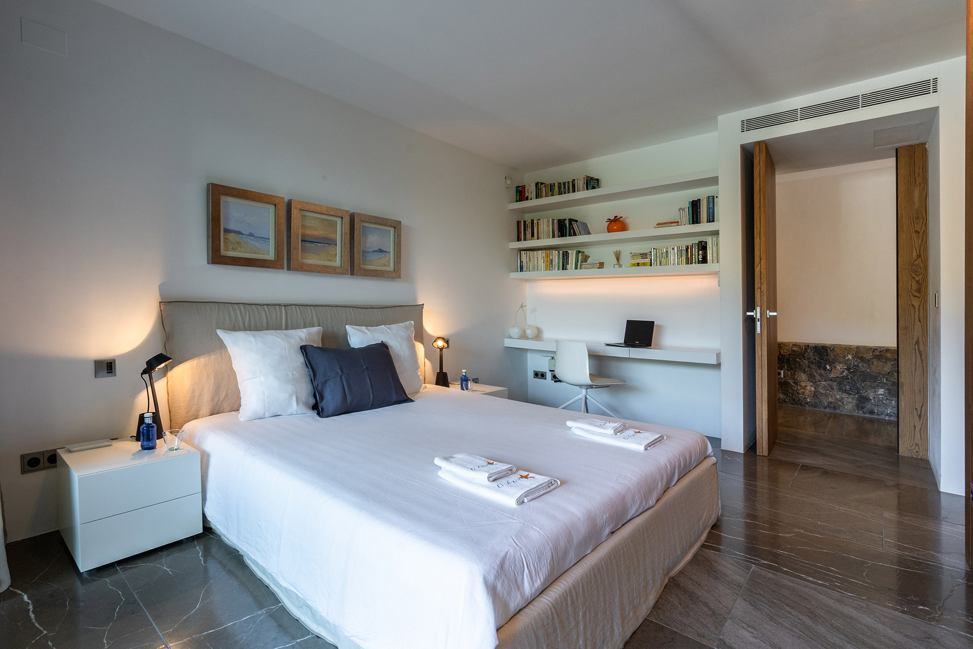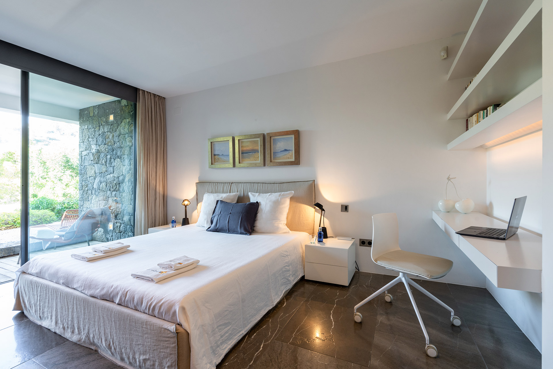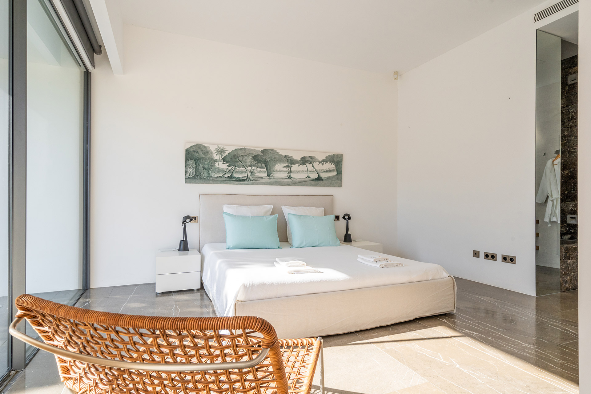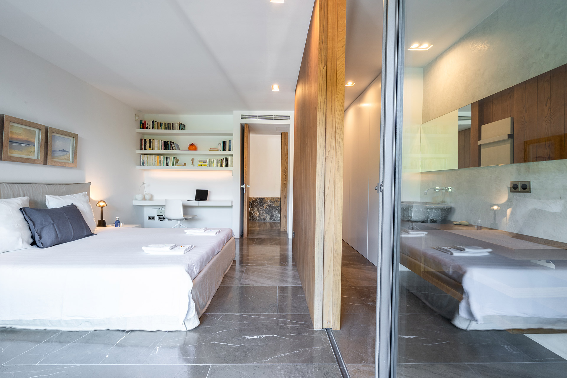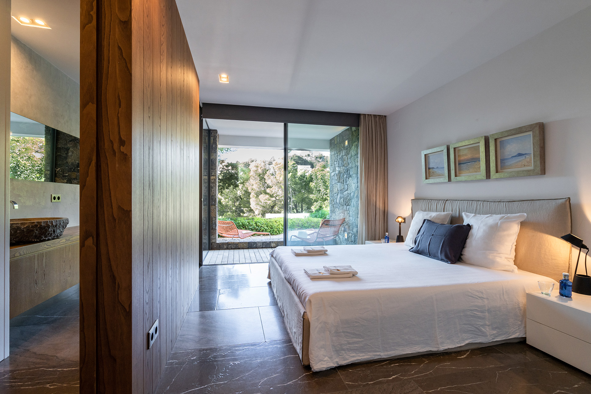 Chambre double avec lit 180, dressing, accès terrasse, coin bureau, climatisation et Salle de bain en suite douche à l’italienne avec douche, wc, lavabo simple
