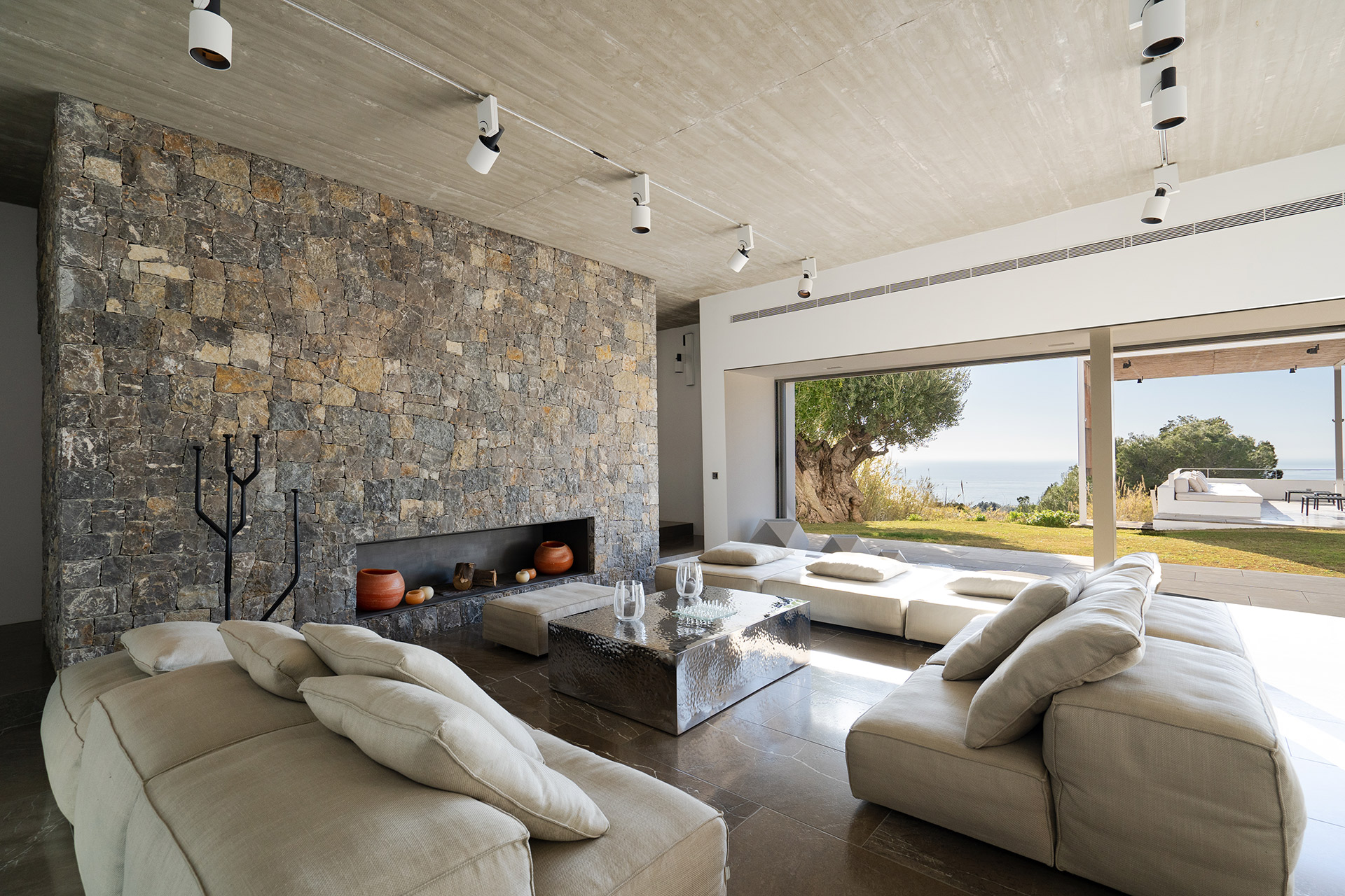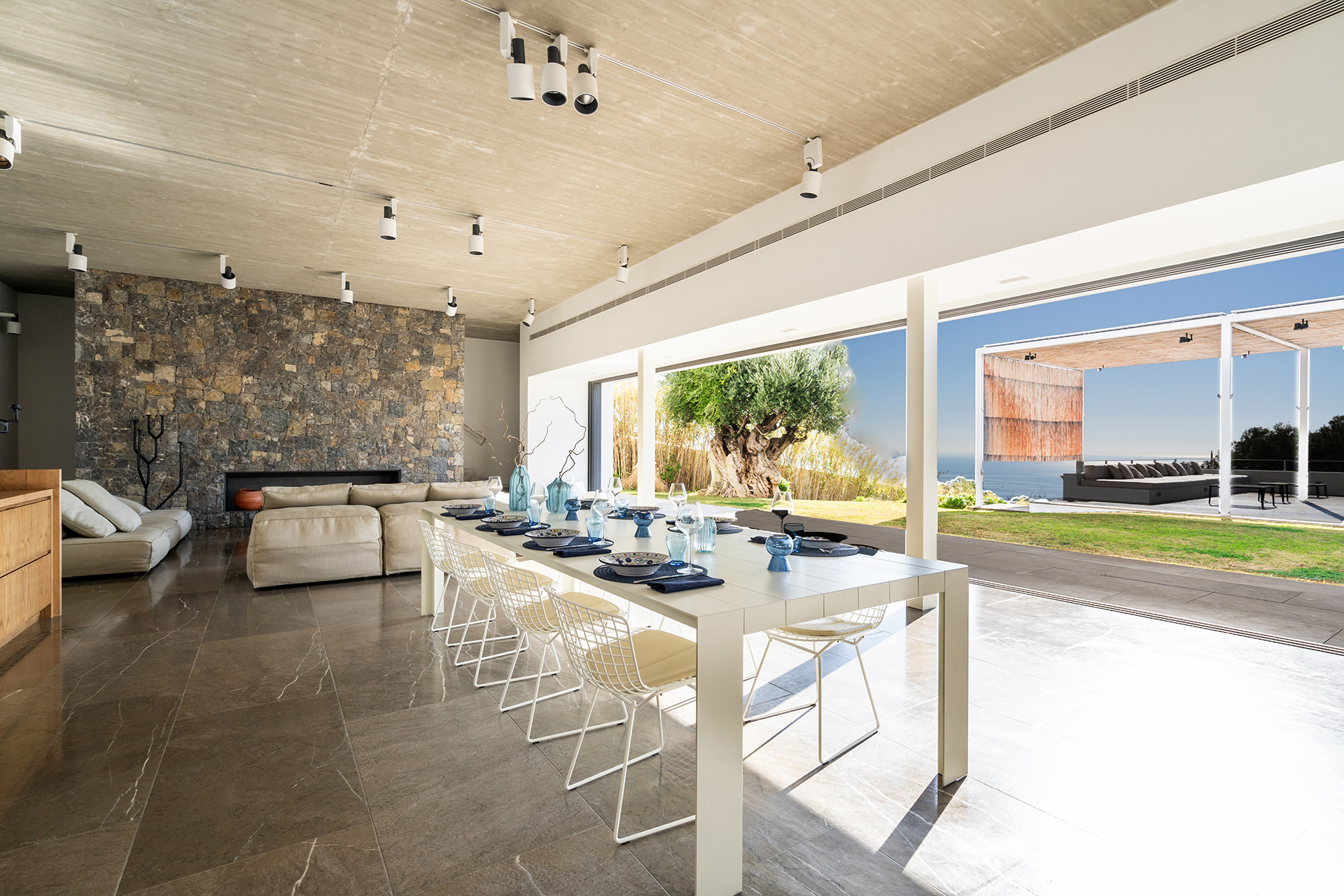 Salon - salle à manger avec cheminée, accès terrasse, climatisation, vue mer et Cuisine américaine