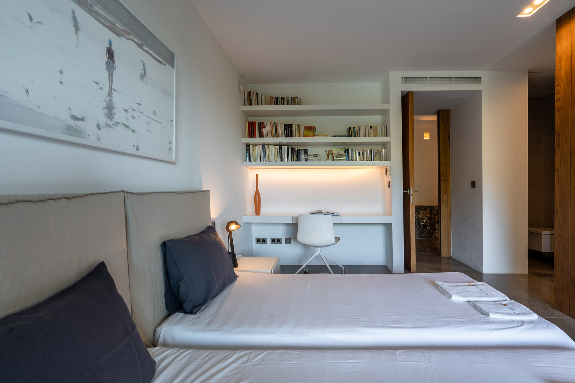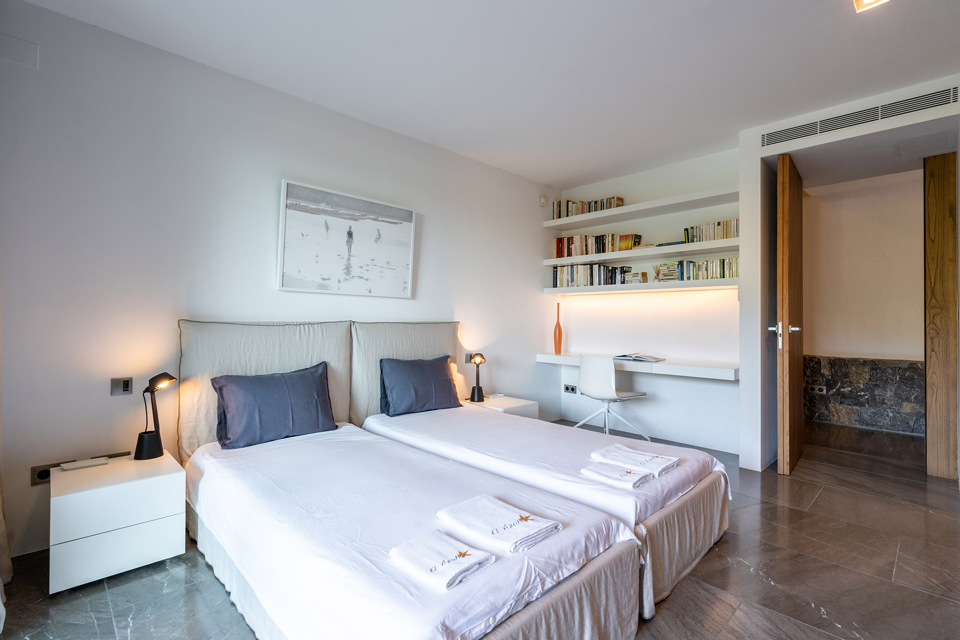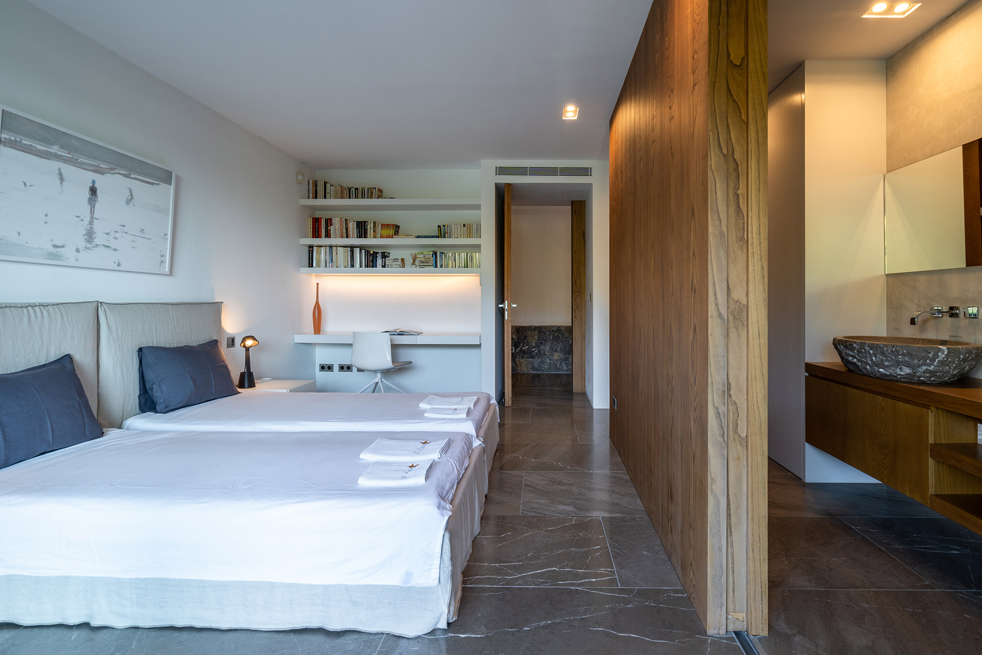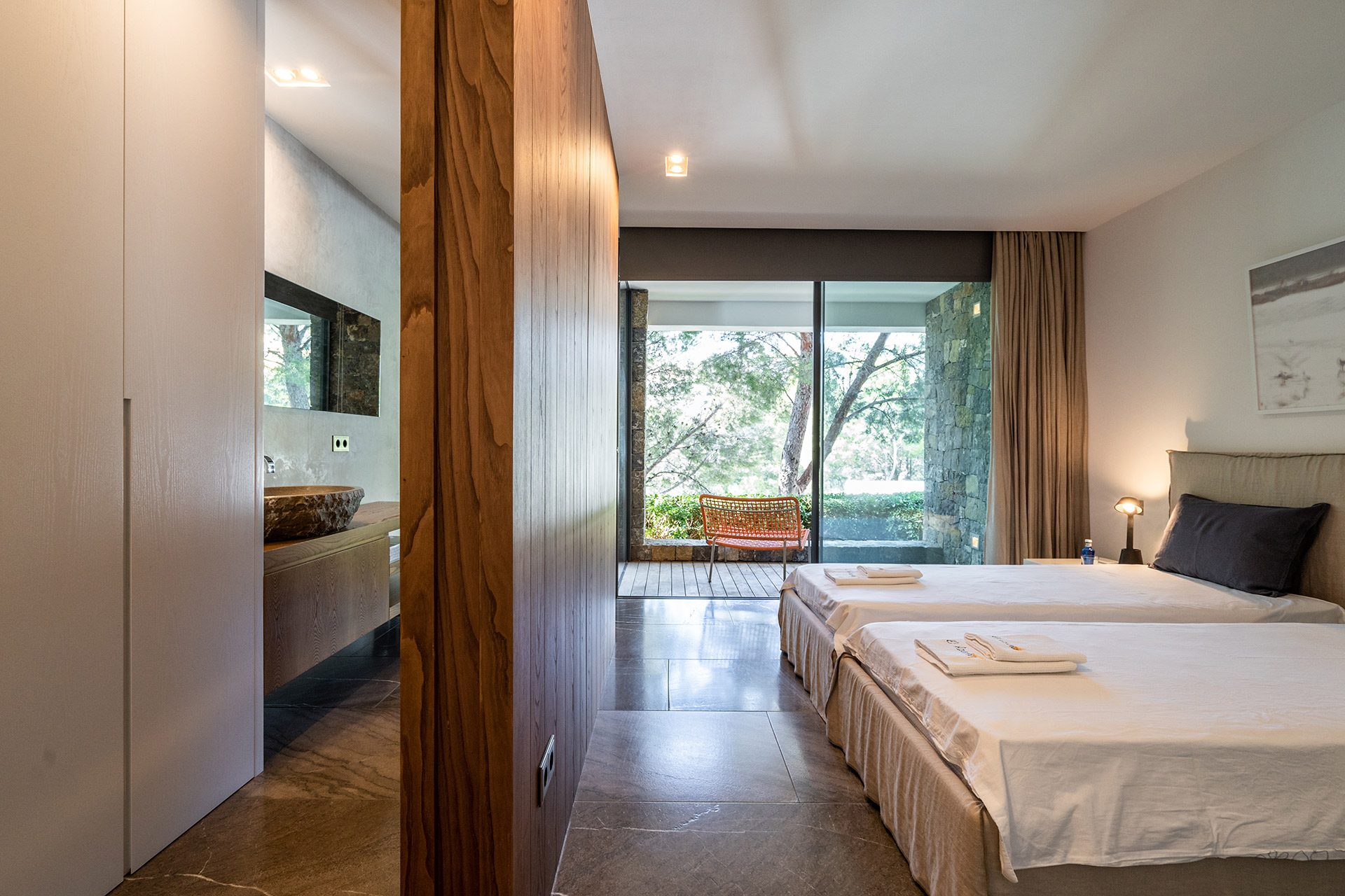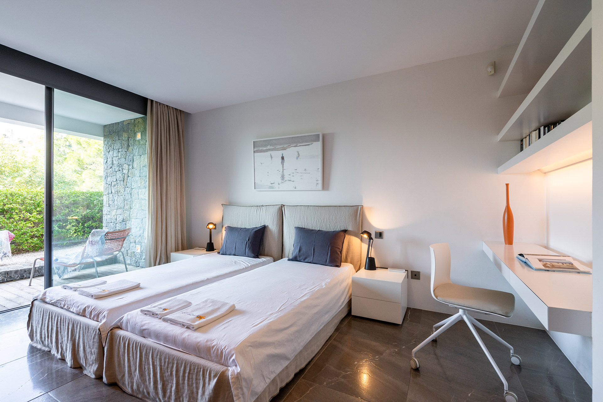 Chambre à lits jumeaux possibilité de rapprocher les lits pour faire un lit de 1m80 avec lit 90, lit 90, accès terrasse, climatisation, dressing et Salle de Bain douche à l’italienne avec wc, douche, lavabo simple