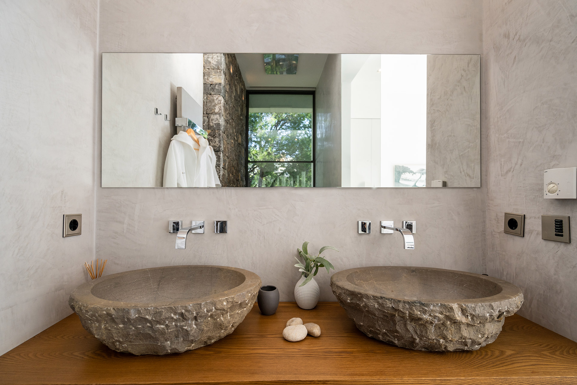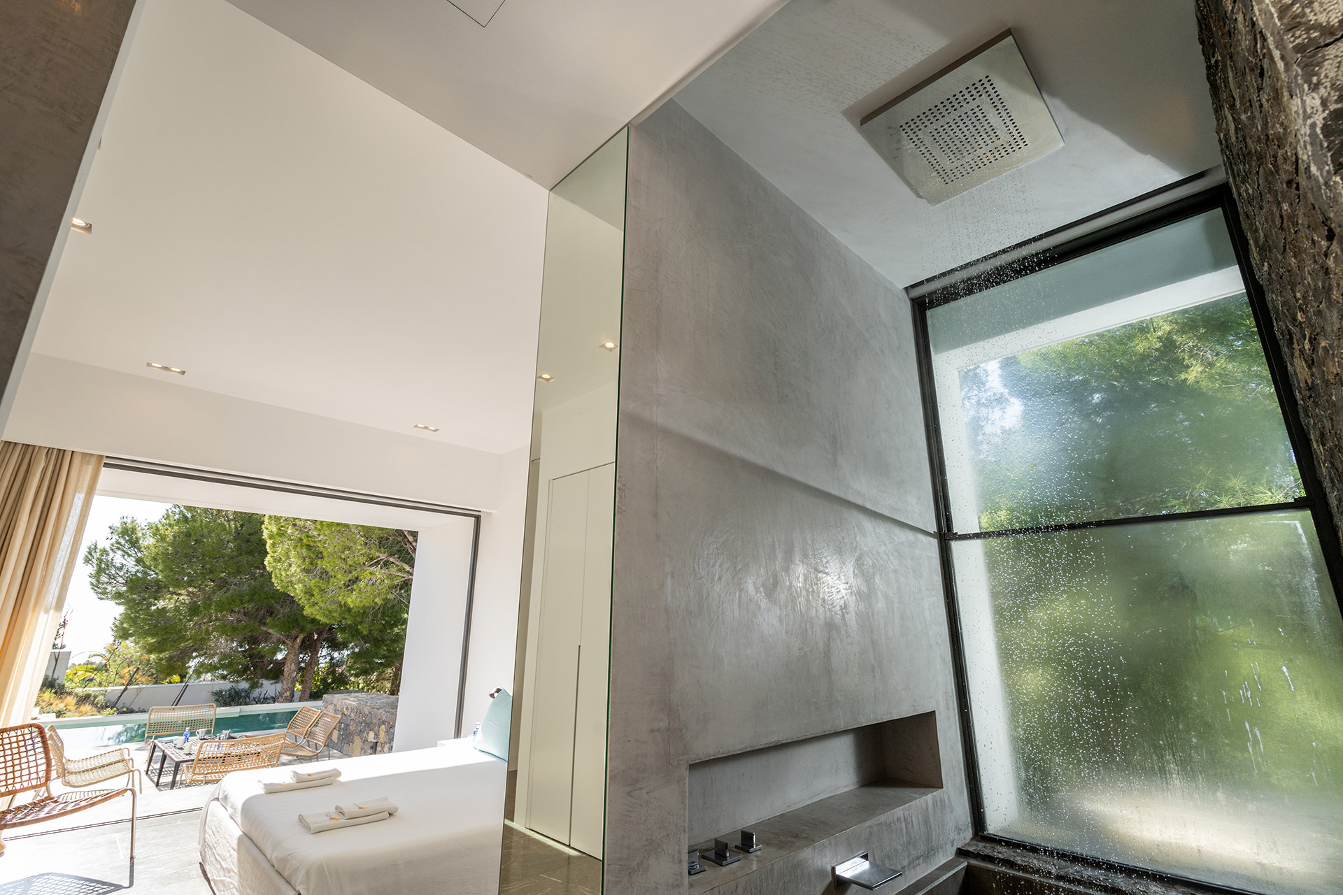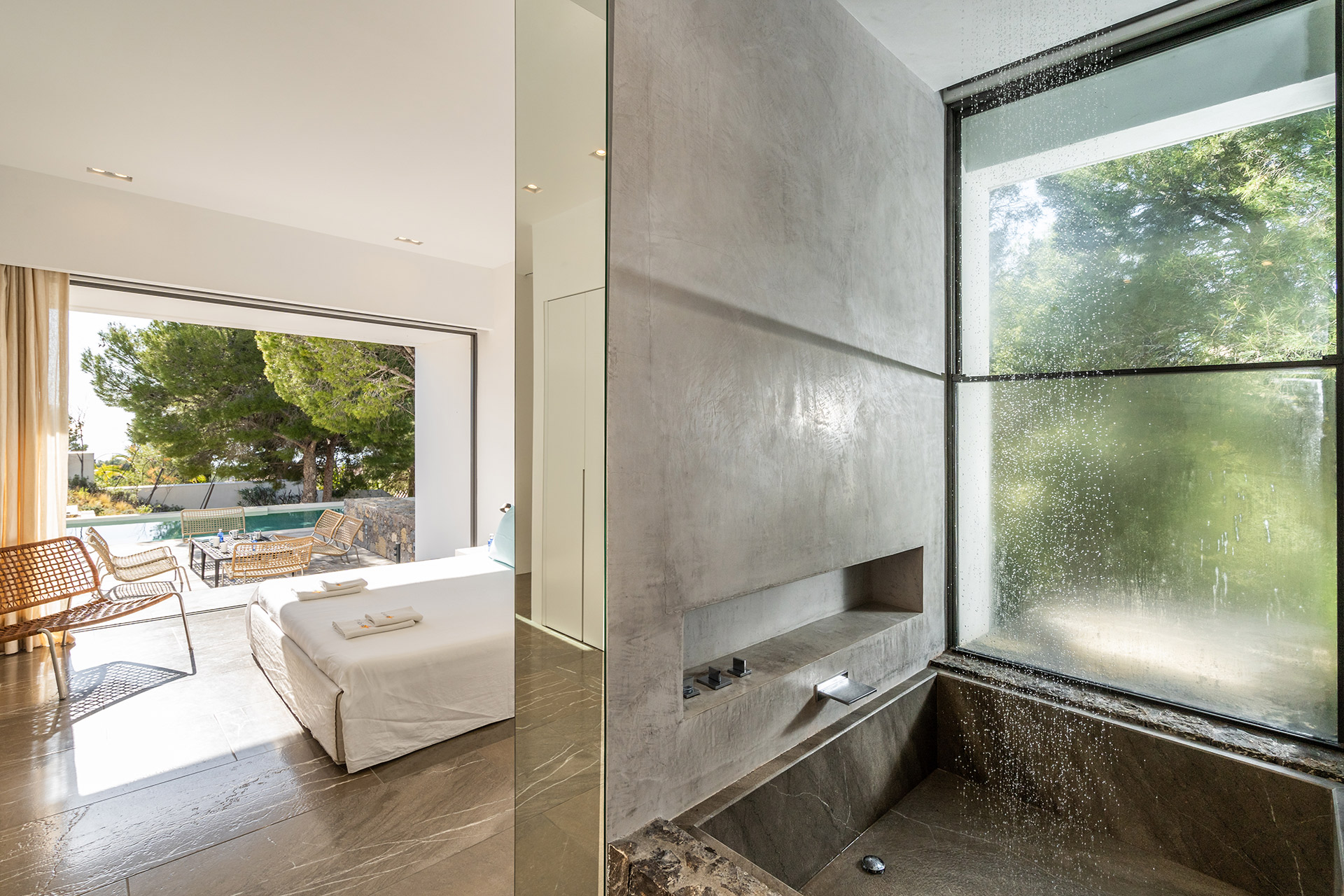 Chambre double avec accès terrasse, vue piscine, climatisation et Salle de bain en suite avec lavabo double, baignoire, douche