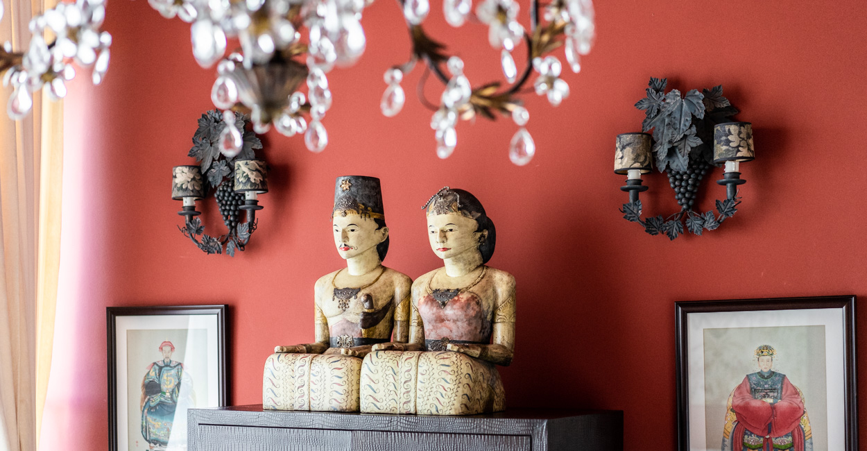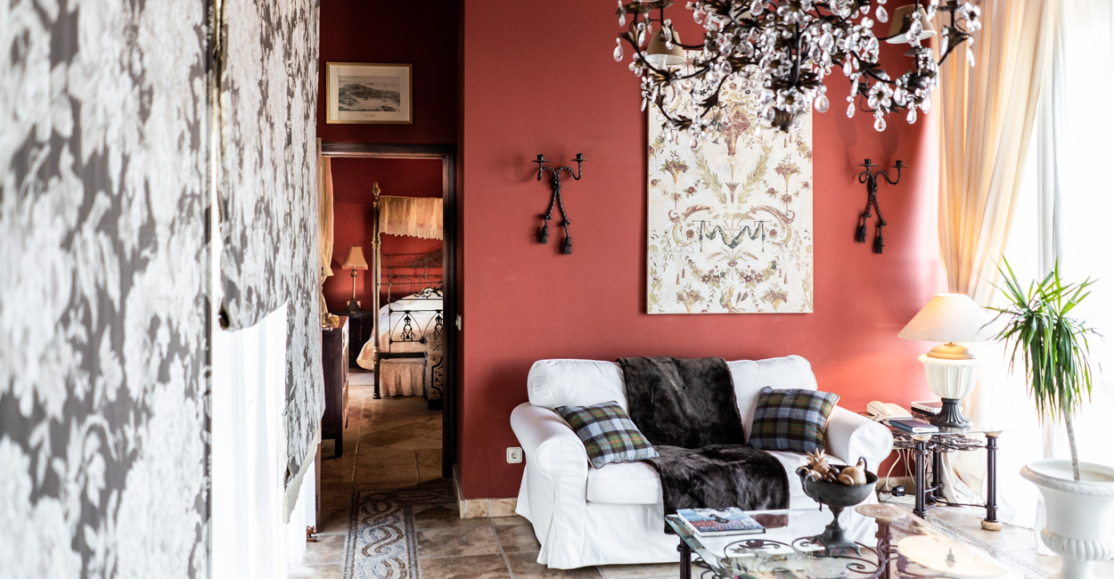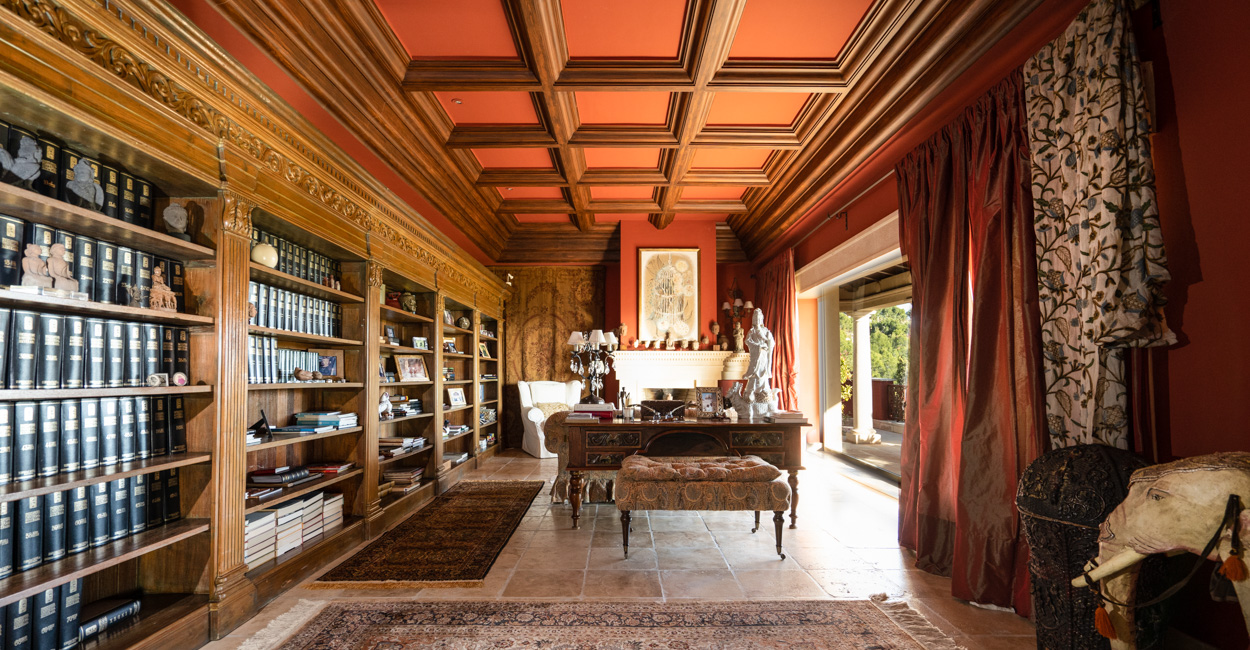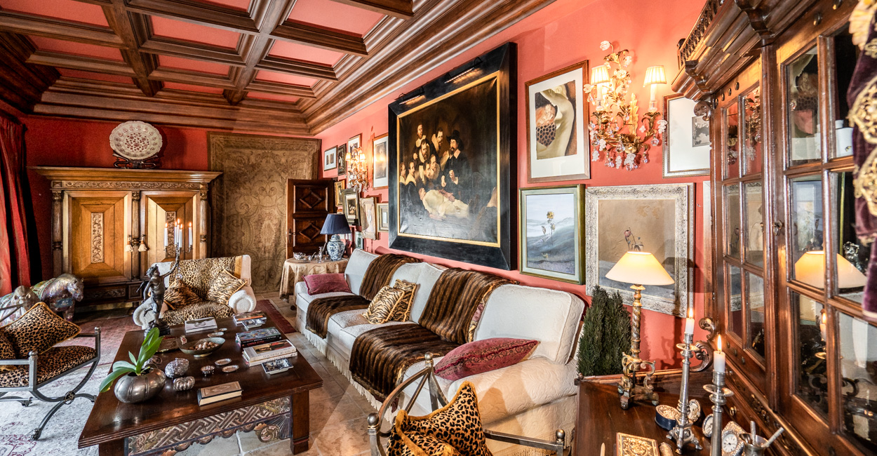 Salon avec de nombreuses peintures, objets de décoration, sculptures... Un salon bibliothèque d'un côté avec canapés et bureau, dans la pièce centrale un piano et dans le salon opposé, canapés confortables et Bibliothèque avec canapés et bureau