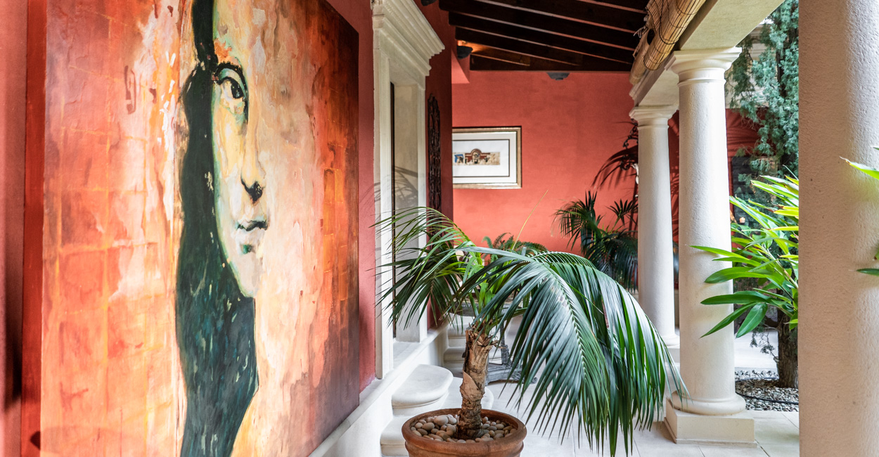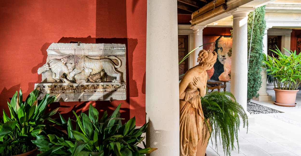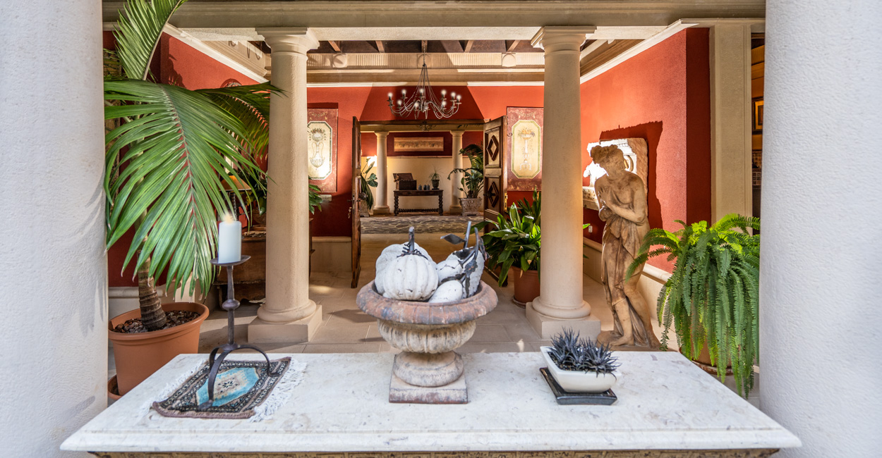 Pièce grand patio avec colonnes, centre de la maison, richement décoré en peinture et sculpture