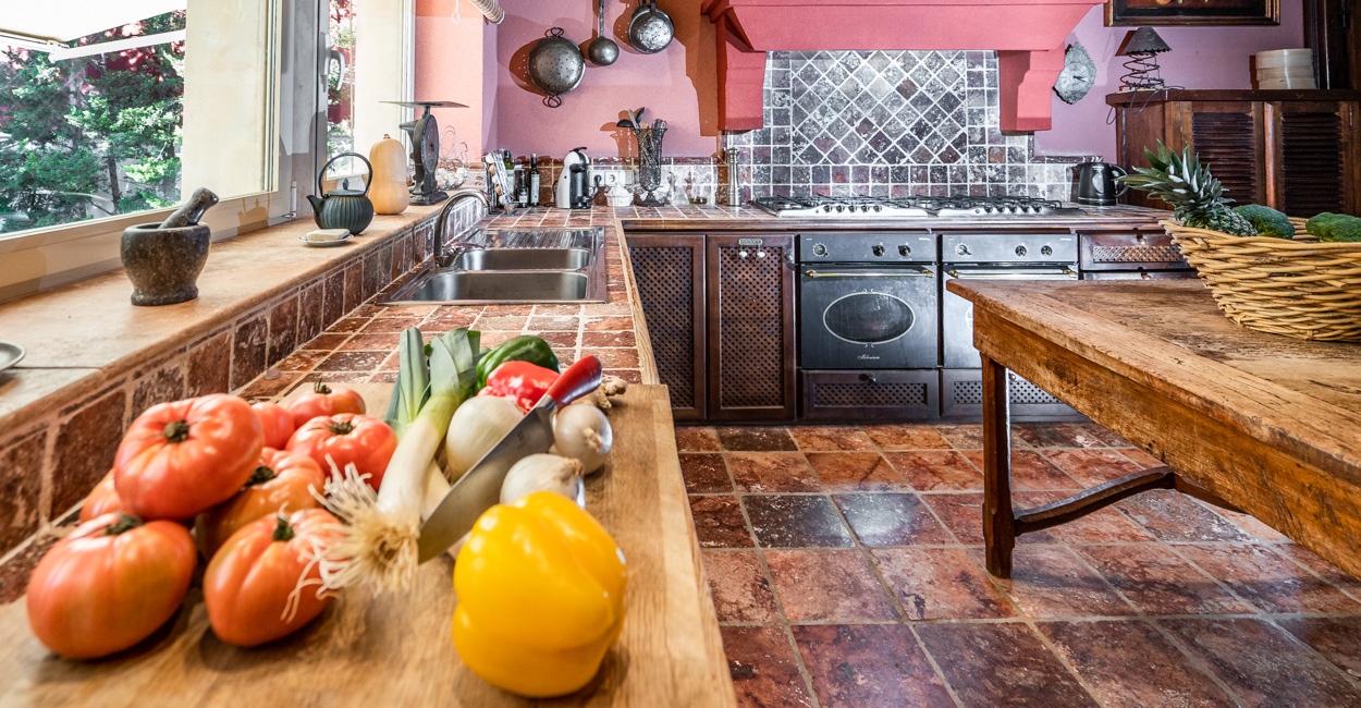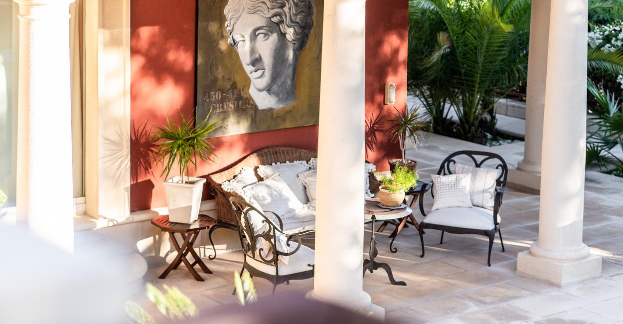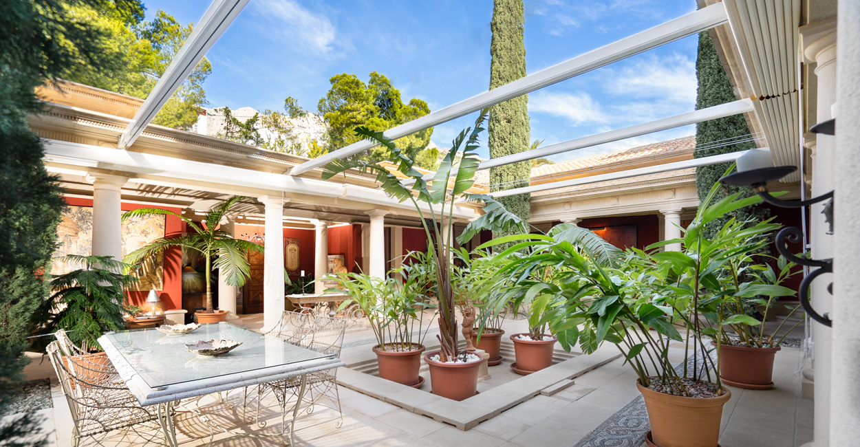 Cette propriété se fond dans une barrière végétale luxuriante de palmiers et cyprès.