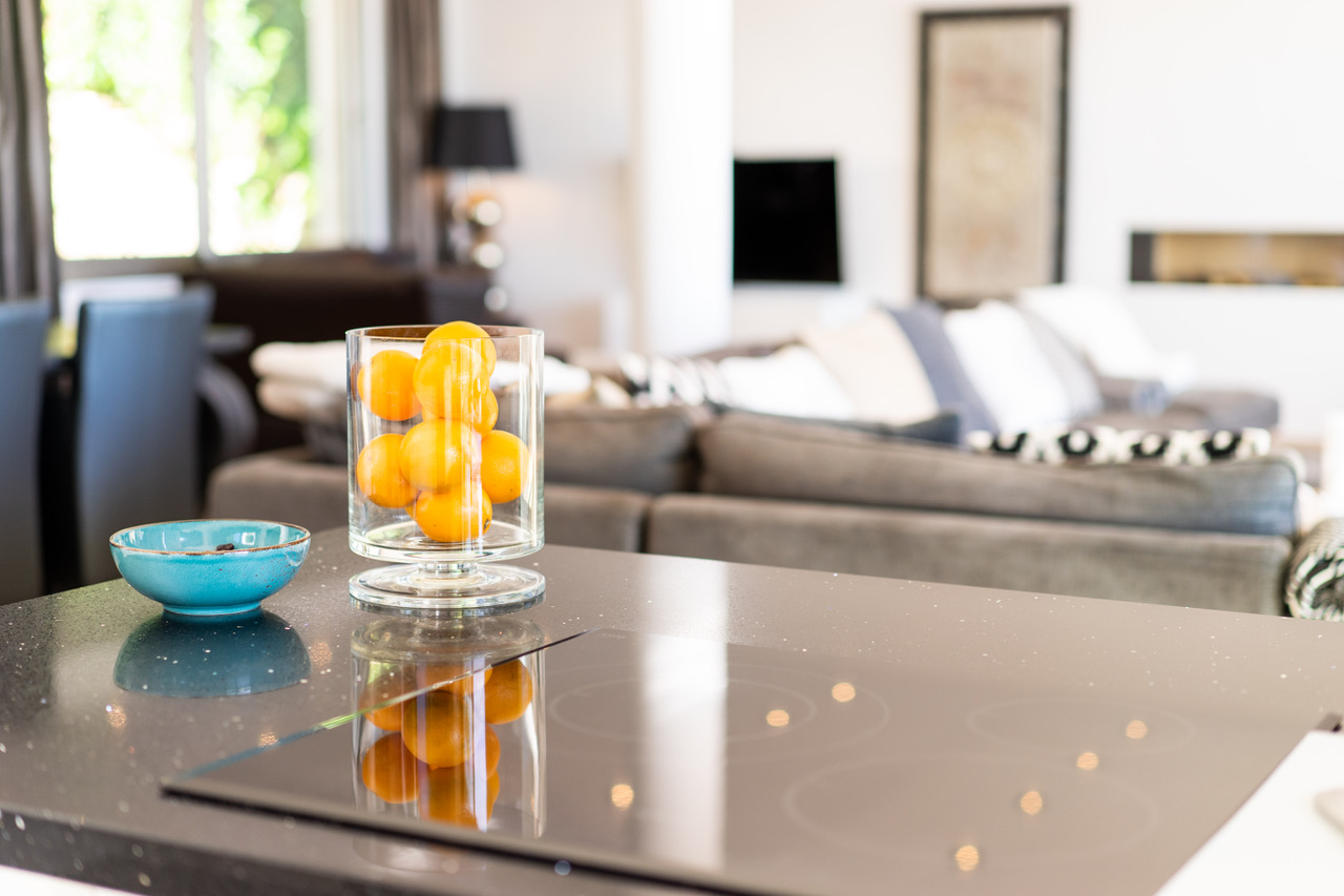 Salon - salle à manger avec accès terrasse, télévision, vue piscine, vue mer et Cuisine avec cafetière, cave à vins, four électrique, lave vaisselle