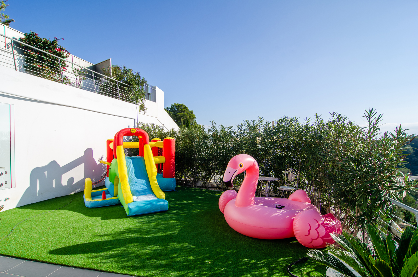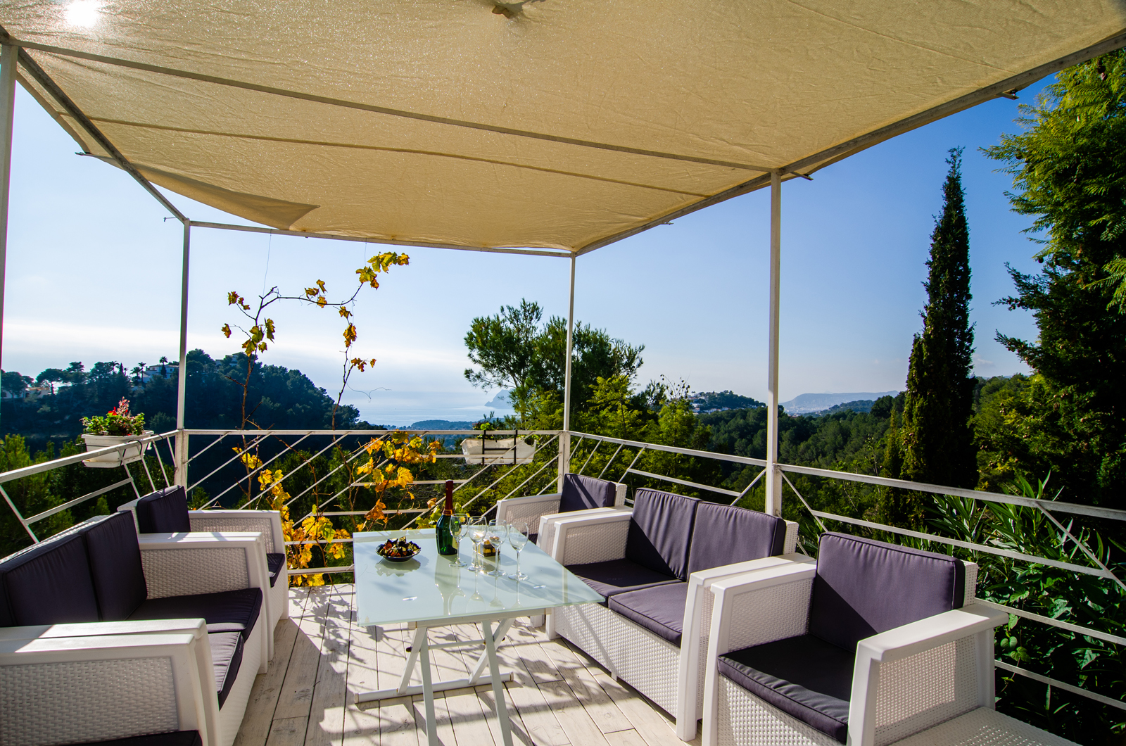 Pour y accéder, vous emprunterez une petite rue sans issue desservant 2 propriétés. L’environnement est très calme. Vous n’aurez, une fois passé le portail sécurisé, qu’une sensation d’exclusivité, d’harmonie et de tranquillité absolue. Vous pourrez contempler cette vue incroyable sur 180 ° offrant cette impression du vert de la forêt plongeant dans le bleu de la mer.
