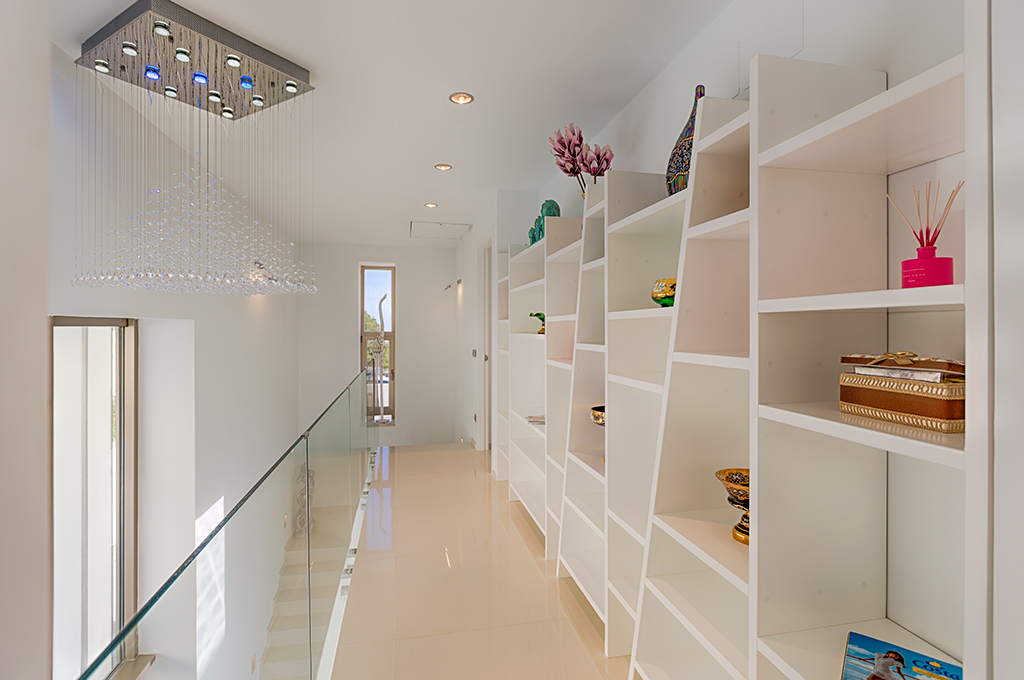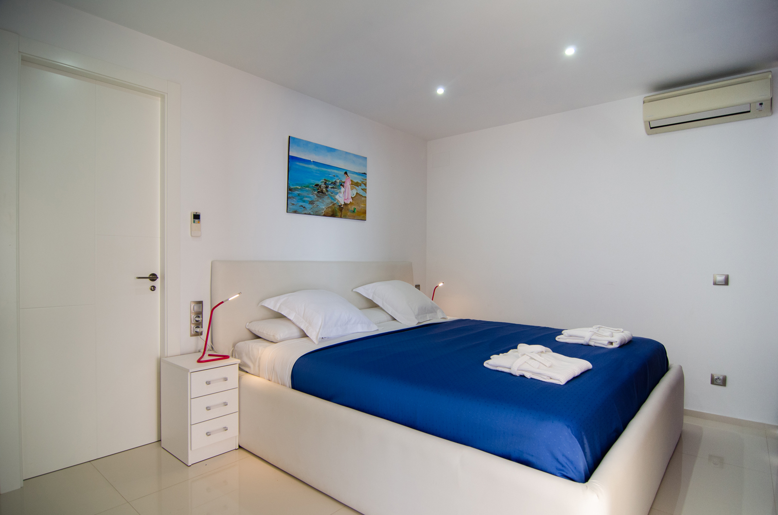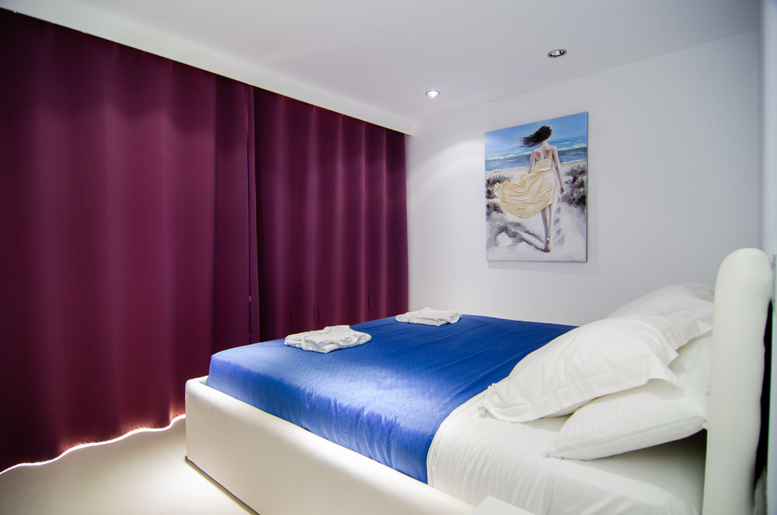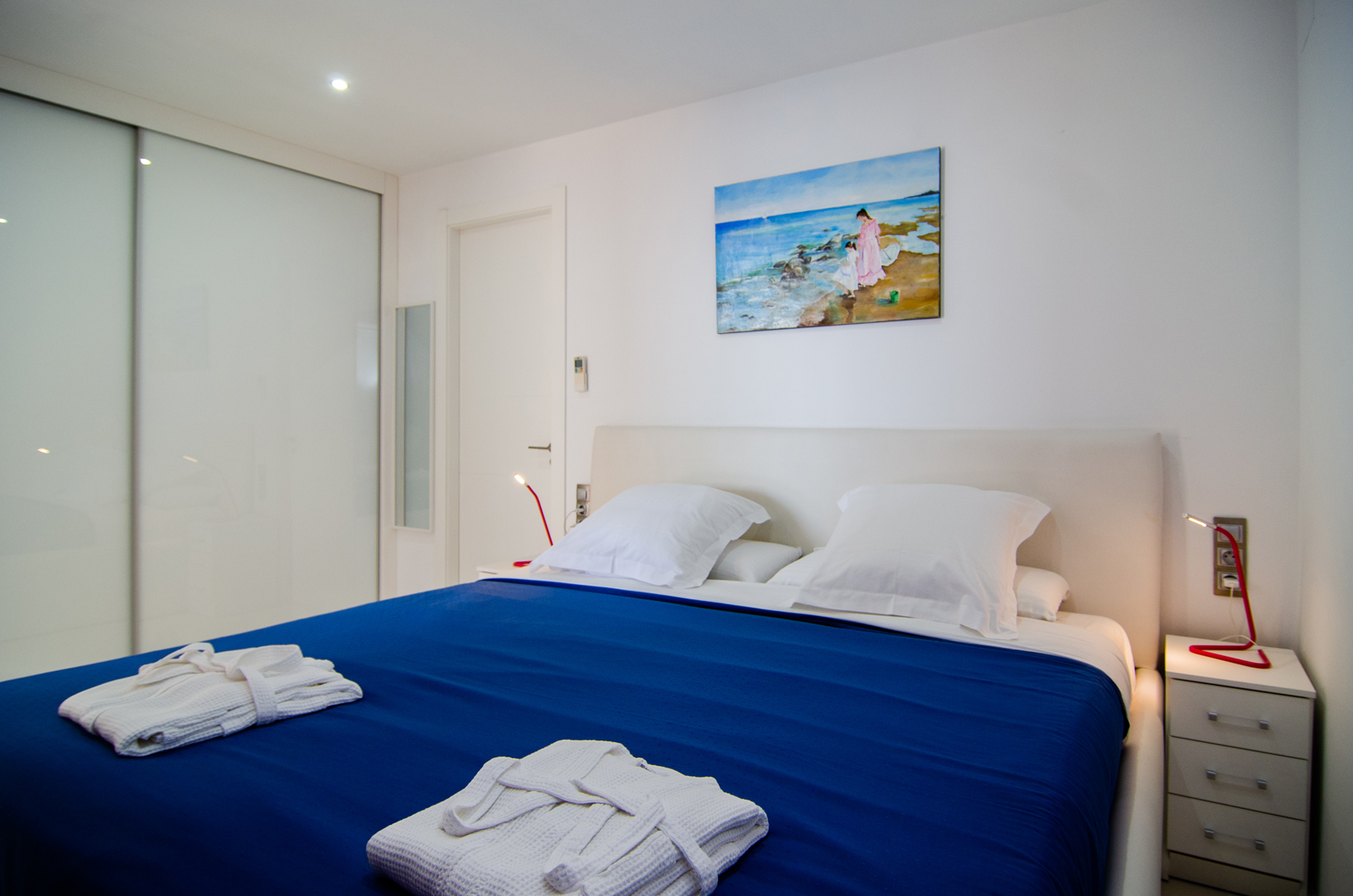 Un escalier avec un garde corps en verre conduit à l’espace supérieur, vous pourrez lorsque vous montrez l’escalier admirer ce lustre en cristal en pyramide sous 6 mètres sous plafond. Les 3 chambres ont toutes une terrasse avec vue panoramique sur la forêt et la mer et disposent de lits aux dimensions remarquables (2mx2,20m) avec matelas mémoire de 40 cm d’épaisseur. Les salles de bains en suite sont de véritables lieux de détente avec hydro massage et Chroma thérapie. Peignoir à disposition.