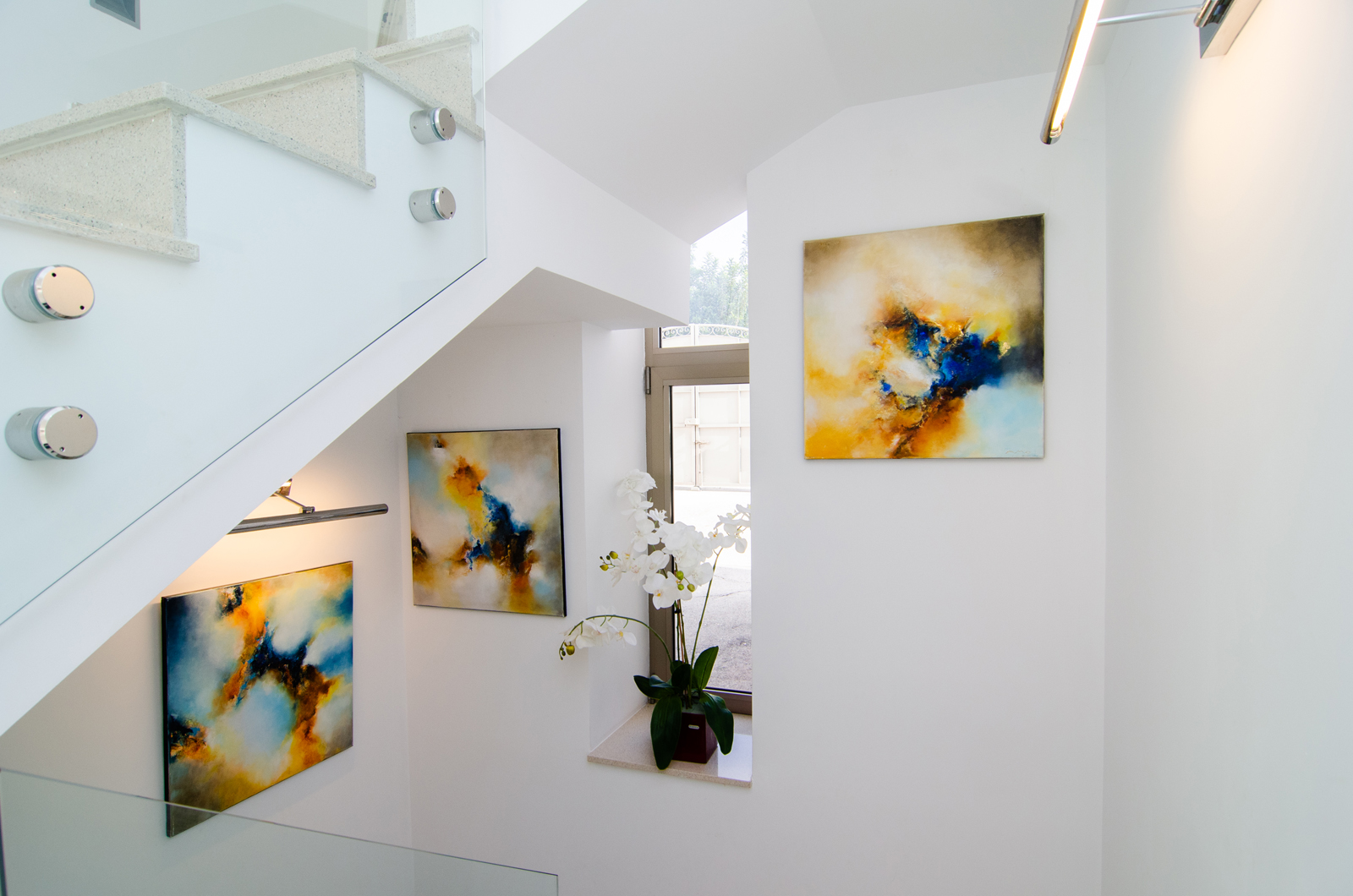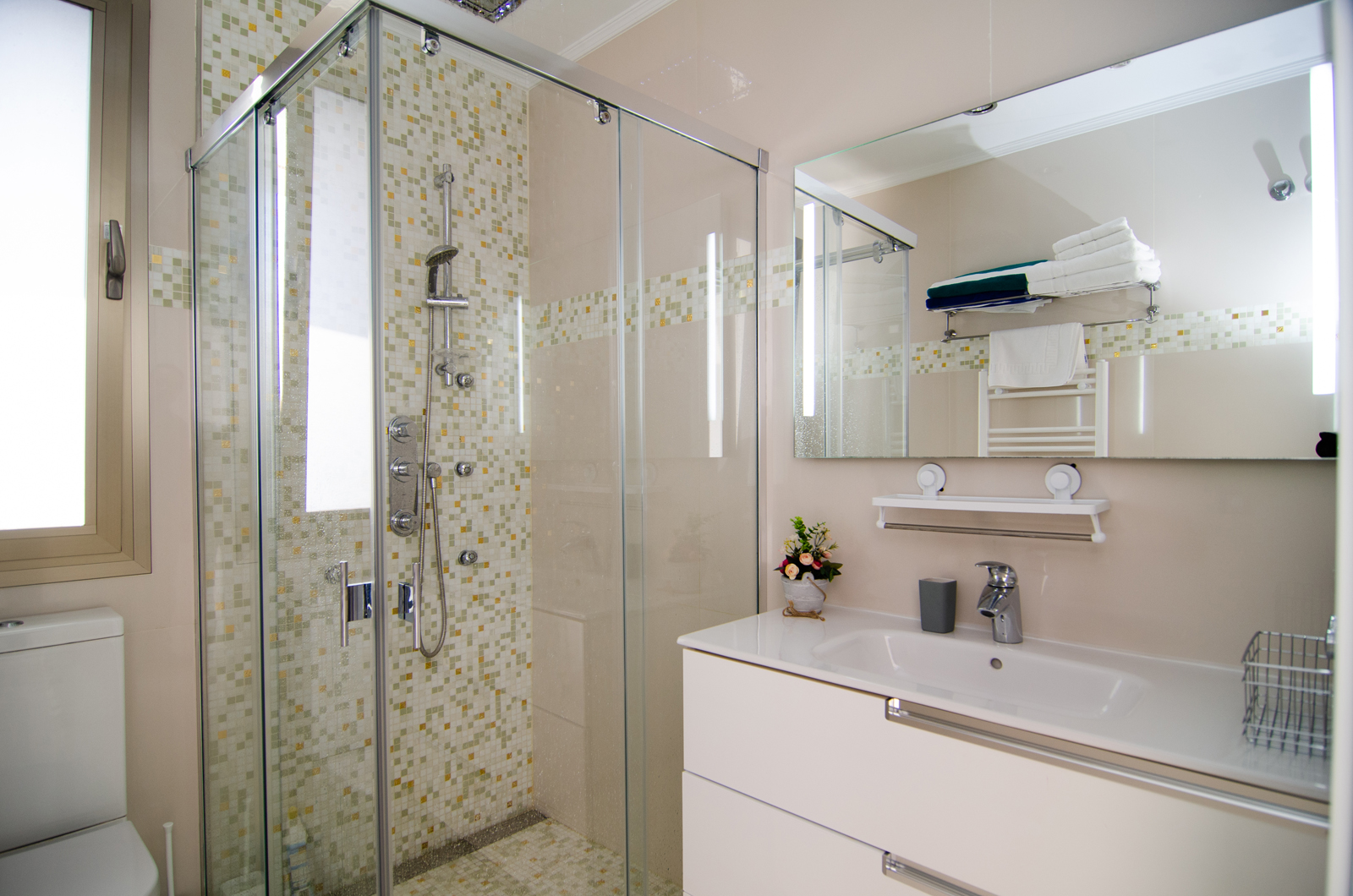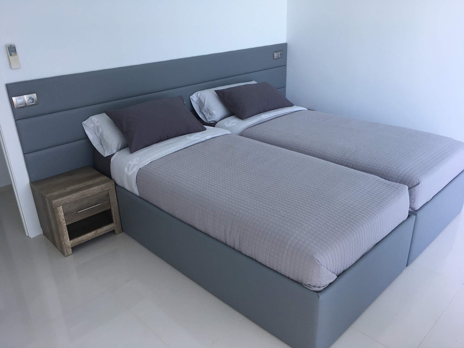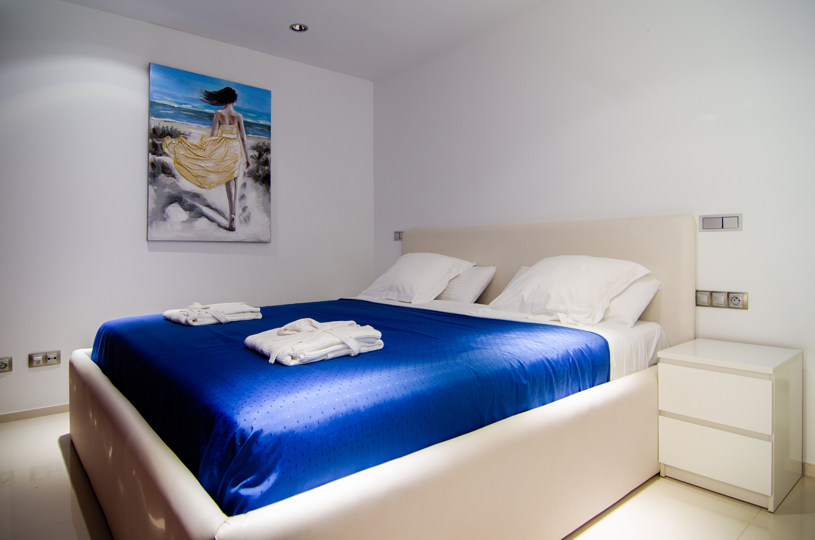 Un escalier avec un garde corps en verre conduit à l’espace supérieur, vous pourrez lorsque vous montrez l’escalier admirer ce lustre en cristal en pyramide sous 6 mètres sous plafond. Les 3 chambres ont toutes une terrasse avec vue panoramique sur la forêt et la mer et disposent de lits aux dimensions remarquables (2mx2,20m) avec matelas mémoire de 40 cm d’épaisseur. Les salles de bains en suite sont de véritables lieux de détente avec hydro massage et Chroma thérapie. Peignoir à disposition.