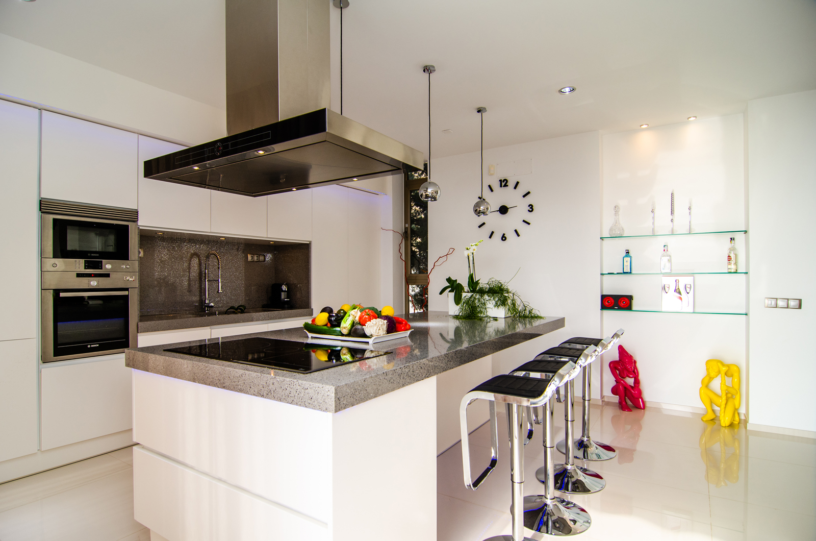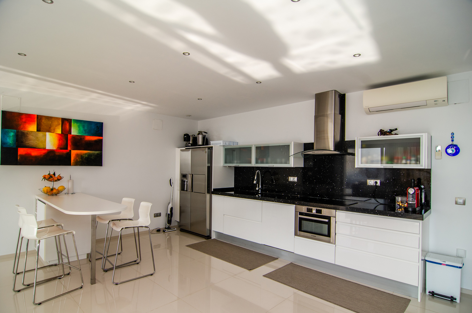 Cuisine ouverte avec congélateur, réfrigérateur, machine à glacons, four électrique, plaques vitrocéramiques, lave vaisselle, four micro ondes, grille pain, cafetière nespresso
