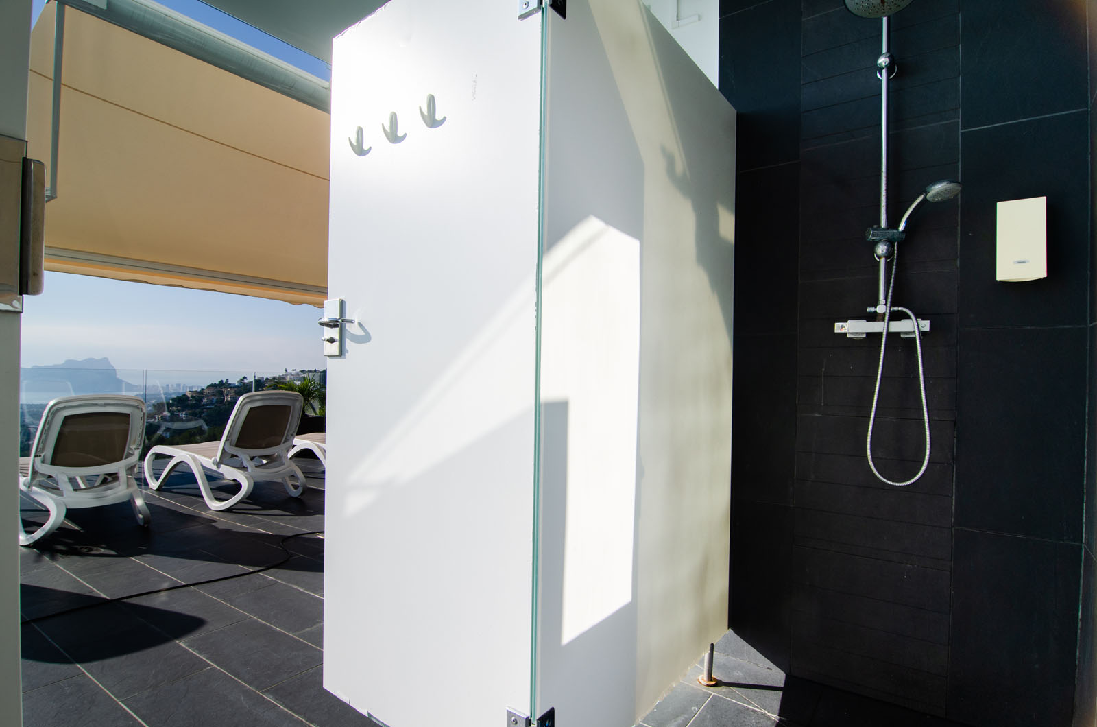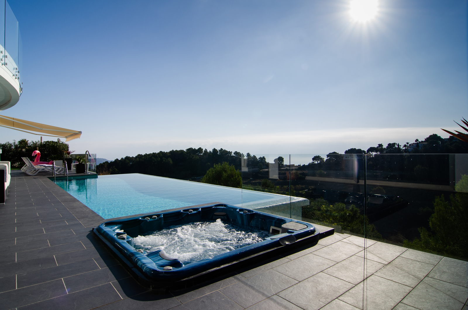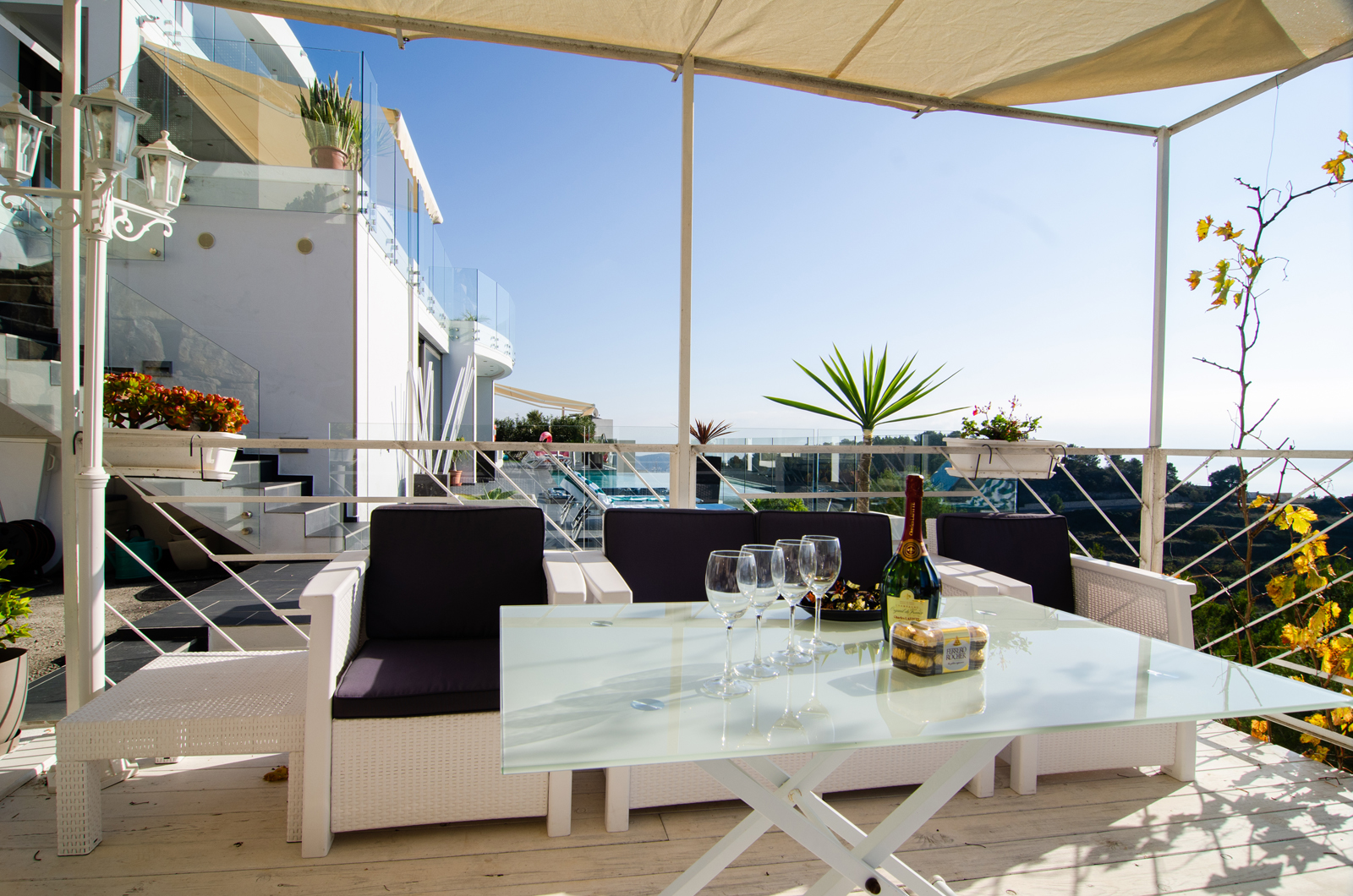 Du salon principal, on ouvre sur l’espace piscine avec jacuzzi, sur la gauche un espace en cristal blanc aménagé sous l’escalier pour la douche extérieure avec eau chaude et froide et toilette et à droite de la piscine l’espace barbecue, four à bois, et une jolie pergola aménagée avec sofa pour 10 personnes idéale pour se détendre, admirer les levers de soleil lors de petits déjeuner matinaux, ou déguster un cocktail et profiter des jolis couchers de soleil . Terrasse aménagée avec un mobilier de qualité et stores anti-uv.