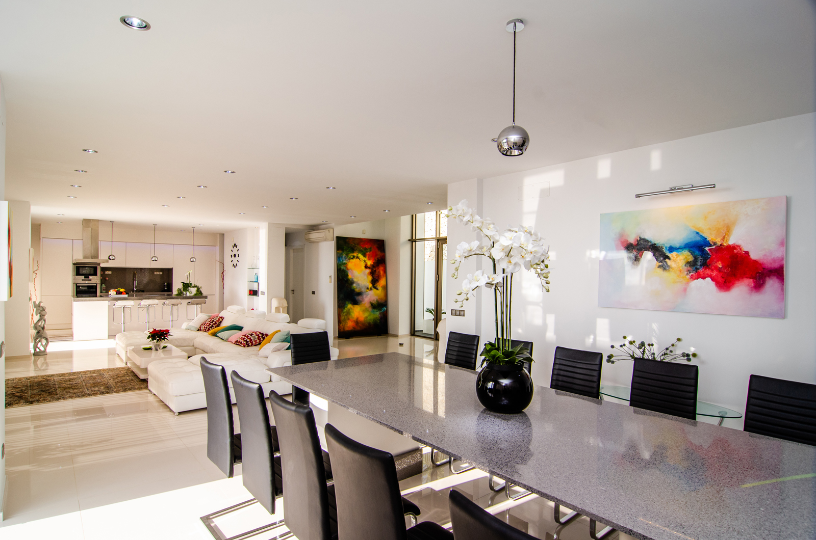 Vous entrerez par une porte toute en baie vitrée ouvrant sur un grand salon lumineux de 120m2 divisé en 3 parties, le coté droit étant dédié à la cuisine ouverte entièrement équipée et son plan de travail, au centre un grand canapé en cuir face à la baie vitrée de plus de 18 m de long qui habille l’espace salon et à droite le coin salle à manger avec une table moderne, pièce unique créée pour cette propriété et pouvant accueillir 12 personnes.