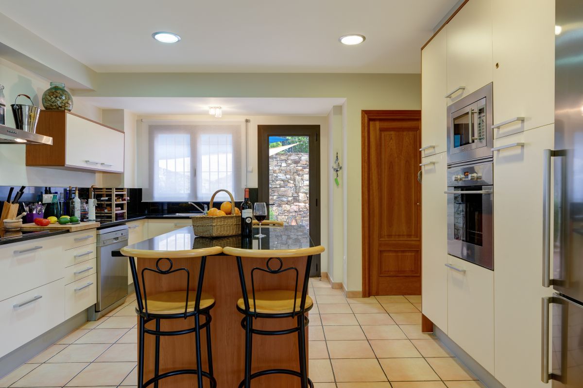 Cuisine avec plaques vitrocéramiques, congélateur, lave vaisselle, four micro ondes, cafetière, four électrique, réfrigérateur, bouilloire, grille pain