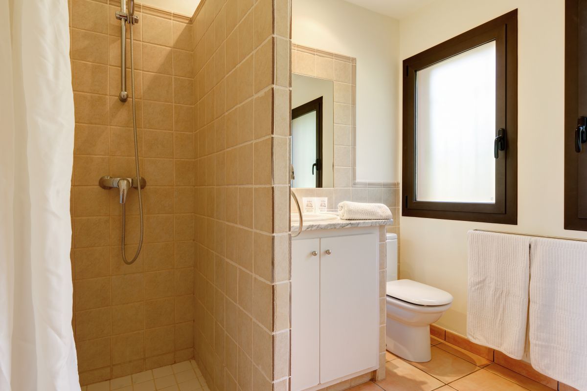 Chambre double avec accès terrasse et Salle de bain en suite et partagée entre ces deux chambres avec douche