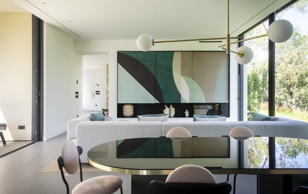 Salon - salle à manger très lumineux et communique entièrement avec l’extérieur,le jardin, la piscine grâce aux grandes portes-fenêtres