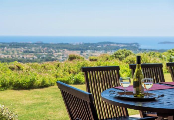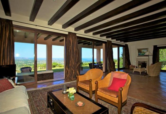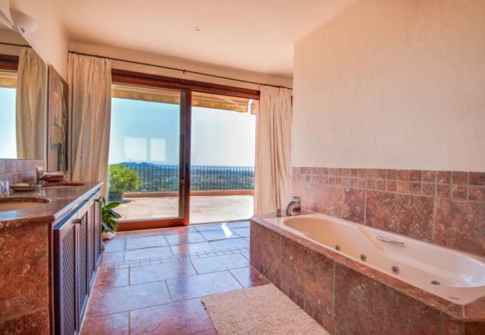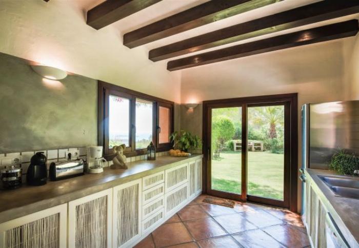 Grâce aux extérieurs parfaitement aménagés, tout le monde peut se réunir facilement autour d’une grande table pour des repas inoubliables. Des espaces détente avec coin salon sont également présents un peu partout dans le jardin arboré. Un petit bassin, des buissons fleuris et la grande pelouse verte le rendent très harmonieux. La piscine privée de 13 x 6 mètres se trouve dans un cadre idyllique qui ressemble à une petite oasis. Avec sa cascade d’eau et sa végétation luxuriante faite de palmiers, se prélasser ici sur un des transats avec la splendide vue mer est un bonheur.