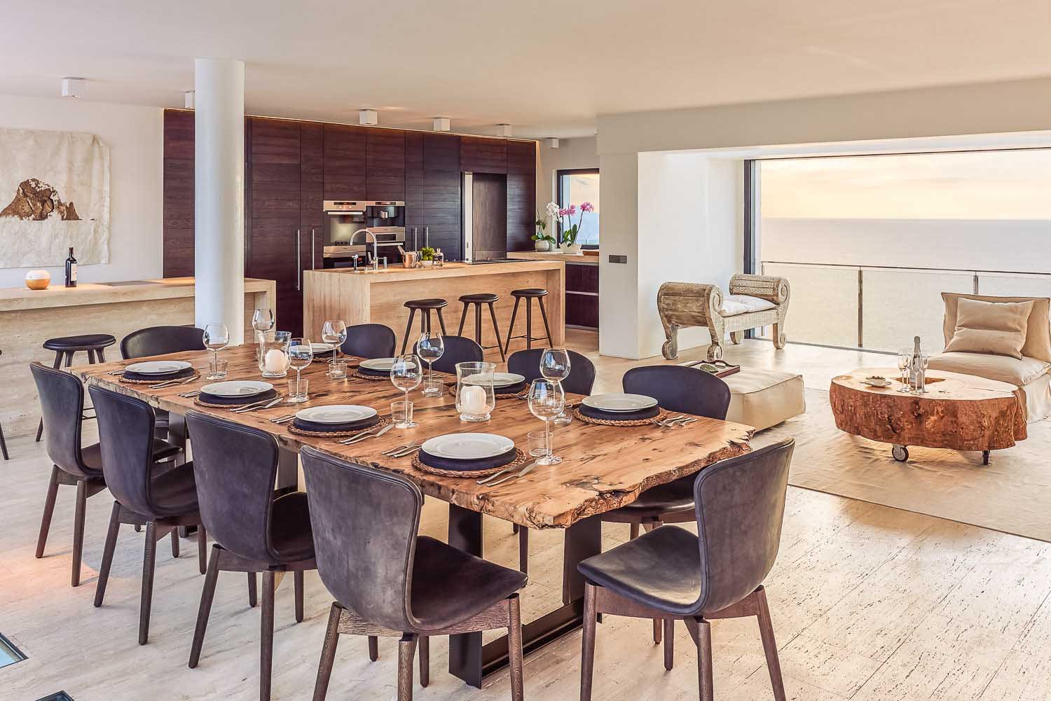 Salon - salle à manger avec table pour 10 personnes, accès à la terrasse avec piscine d’un côté et accès à la terrasse avec un coin repas de l’autre avec vue mer