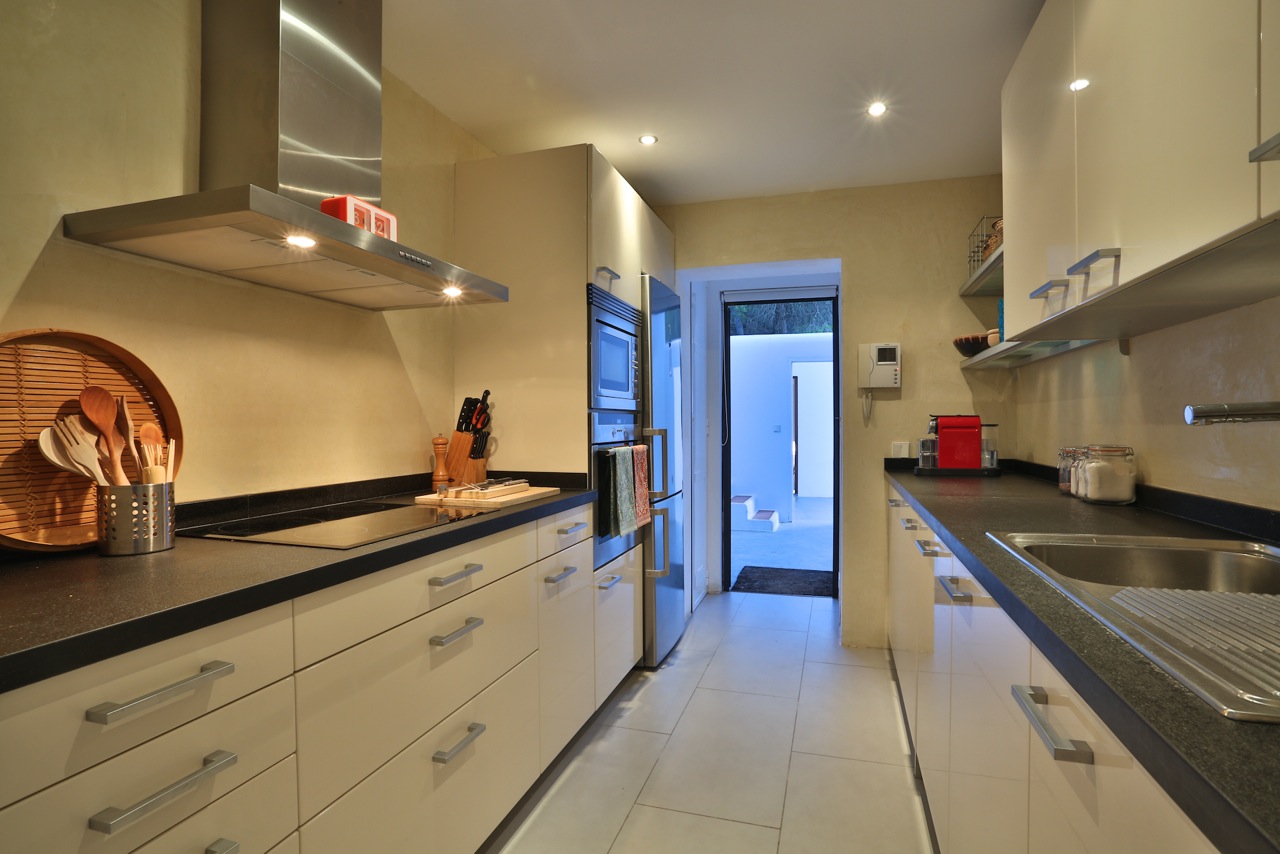 Cuisine ouverte avec réfrigérateur, plaques vitrocéramiques, four électrique, four micro ondes, lave vaisselle, grille pain, cafetière