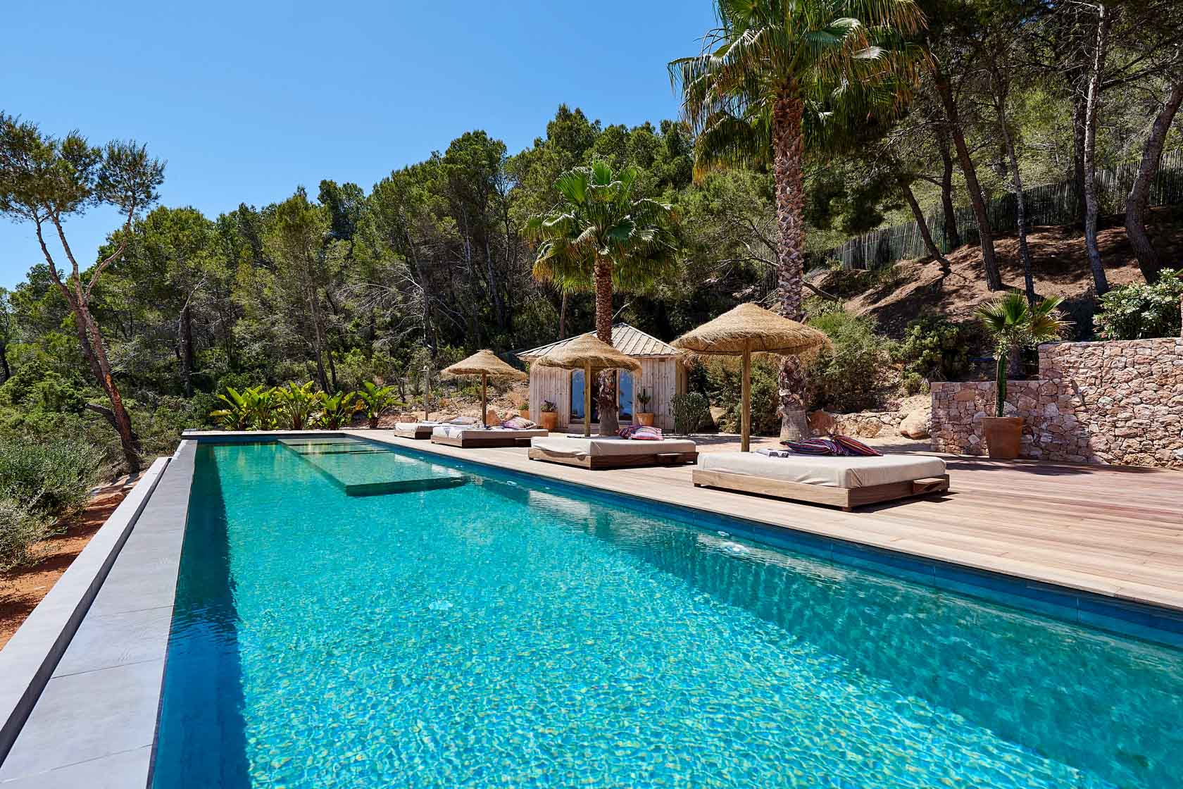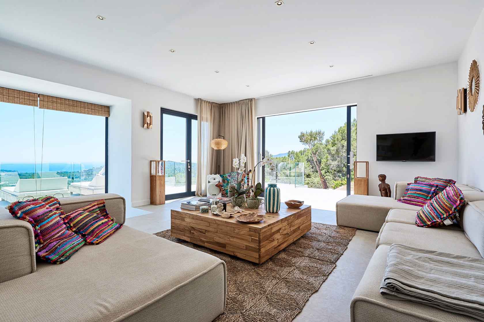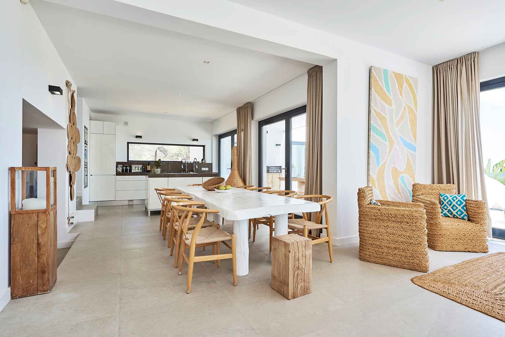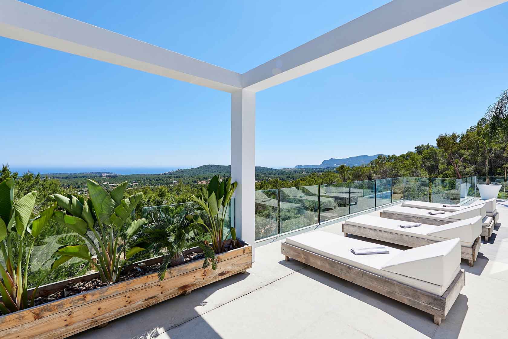 L’architecture de cette villa de luxe est minimaliste et les lignes épurées. La décoration intérieure a été également choisie soigneusement pour offrir des pièces agréables à vivre. Le tout forme un ensemble élégant. Depuis toutes les pièces à vivre on peut observer le bleu de la mer qui s’étend devant nos yeux. Les vertes vallées d’Ibiza sont aussi présentes dans le paysage, faisant un mélange parfait entre campagne et mer. Depuis la piscine la vue est panoramique. Le bassin de 18 mètres de long est parfait aussi bien pour les sportifs souhaitant faire des longueurs que pour les amateurs de farniente qui se laisseront flotter sur une bouée dans l’eau. A l’extérieur, tous les équipements sont présents pour profiter de la douceur du climat d’Ibiza: coin salon, transats ou encore table pour les repas.