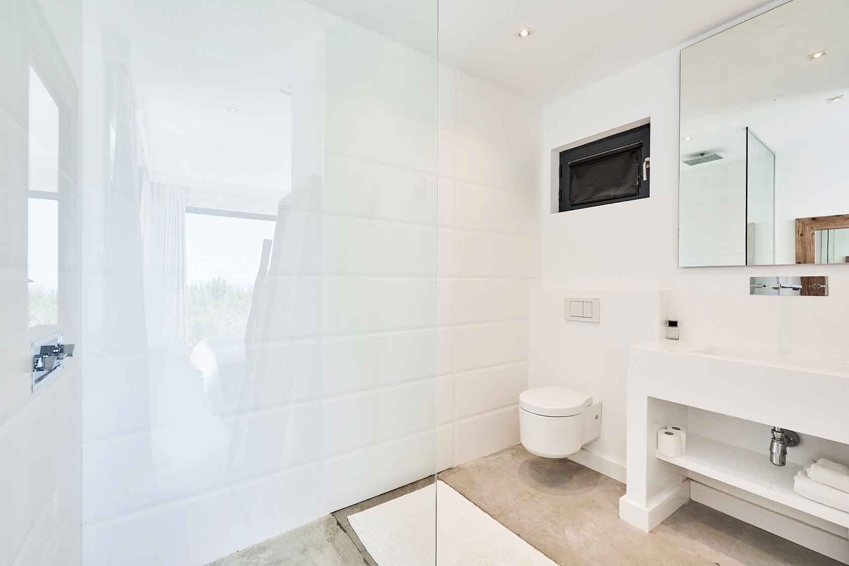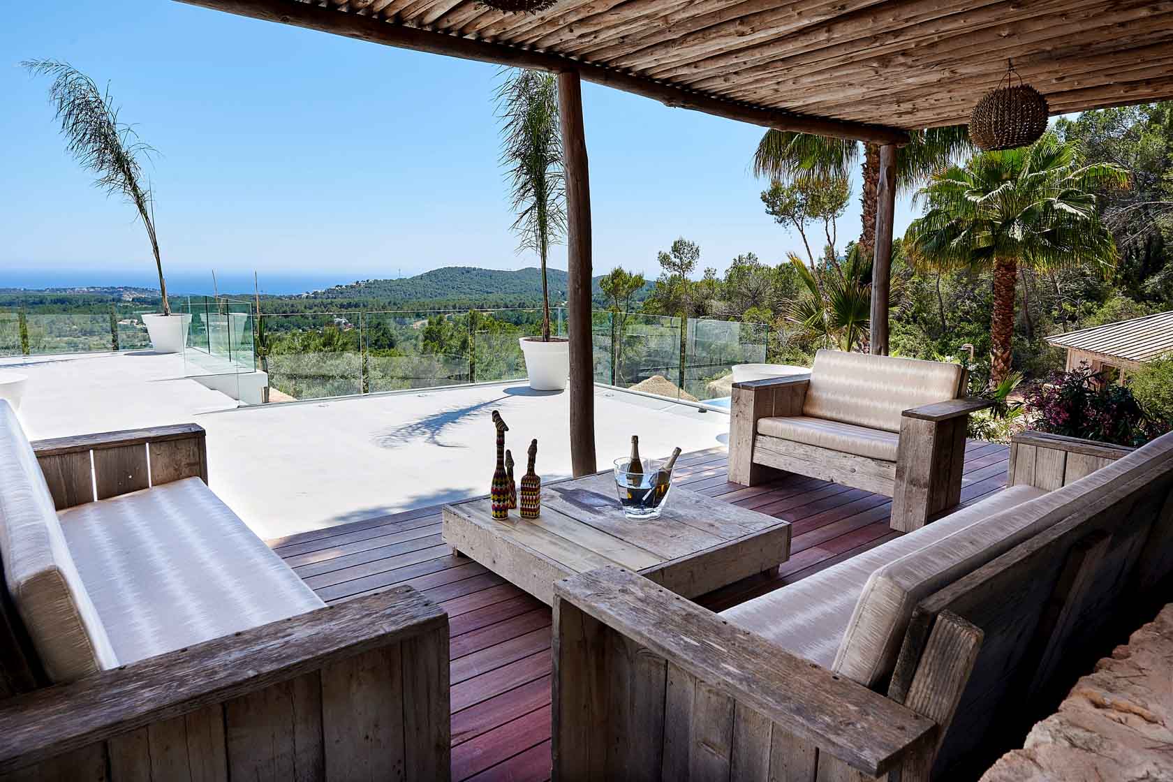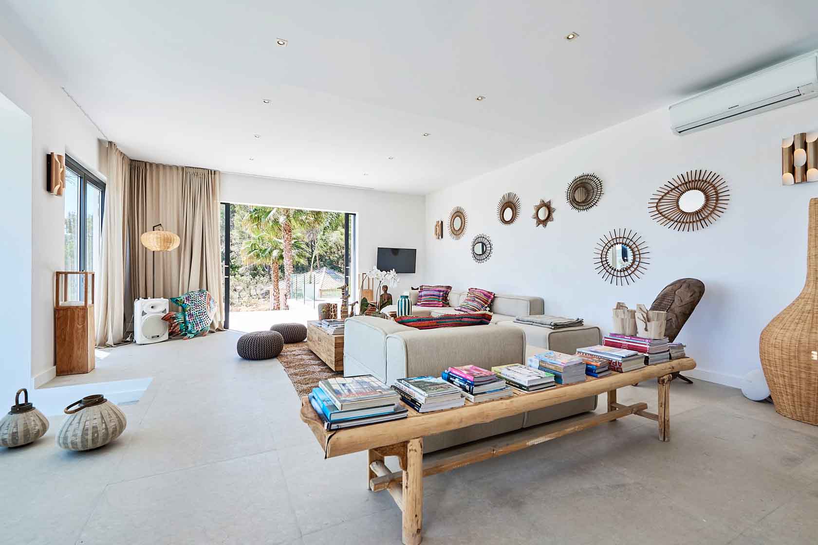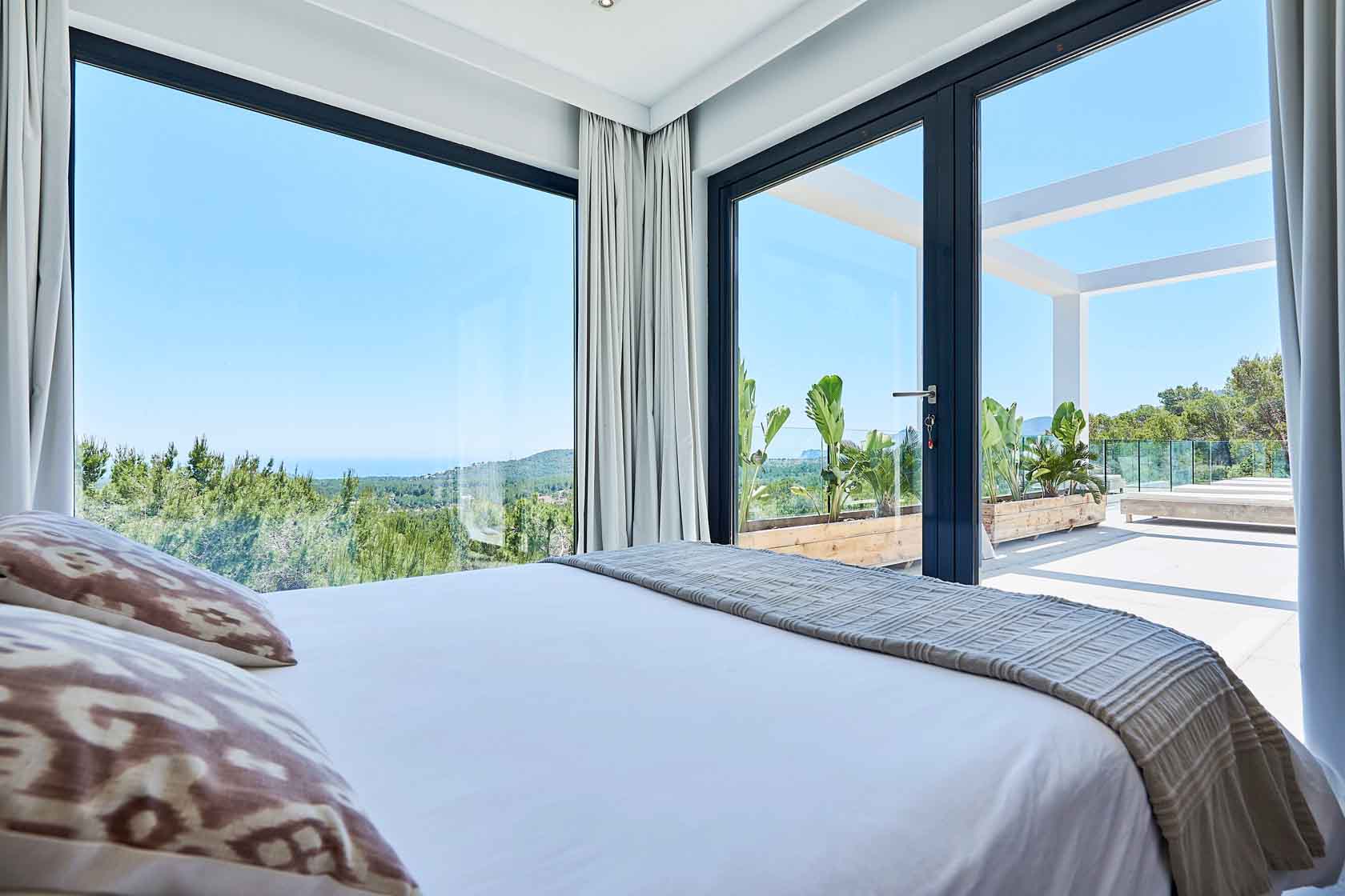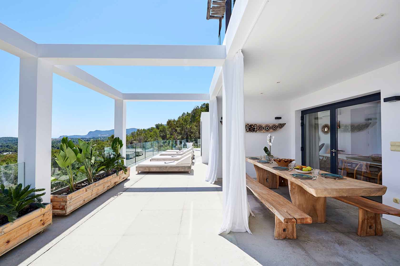 L’architecture de cette villa de luxe est minimaliste et les lignes épurées. La décoration intérieure a été également choisie soigneusement pour offrir des pièces agréables à vivre. Le tout forme un ensemble élégant. Depuis toutes les pièces à vivre on peut observer le bleu de la mer qui s’étend devant nos yeux. Les vertes vallées d’Ibiza sont aussi présentes dans le paysage, faisant un mélange parfait entre campagne et mer. Depuis la piscine la vue est panoramique. Le bassin de 18 mètres de long est parfait aussi bien pour les sportifs souhaitant faire des longueurs que pour les amateurs de farniente qui se laisseront flotter sur une bouée dans l’eau. A l’extérieur, tous les équipements sont présents pour profiter de la douceur du climat d’Ibiza: coin salon, transats ou encore table pour les repas.