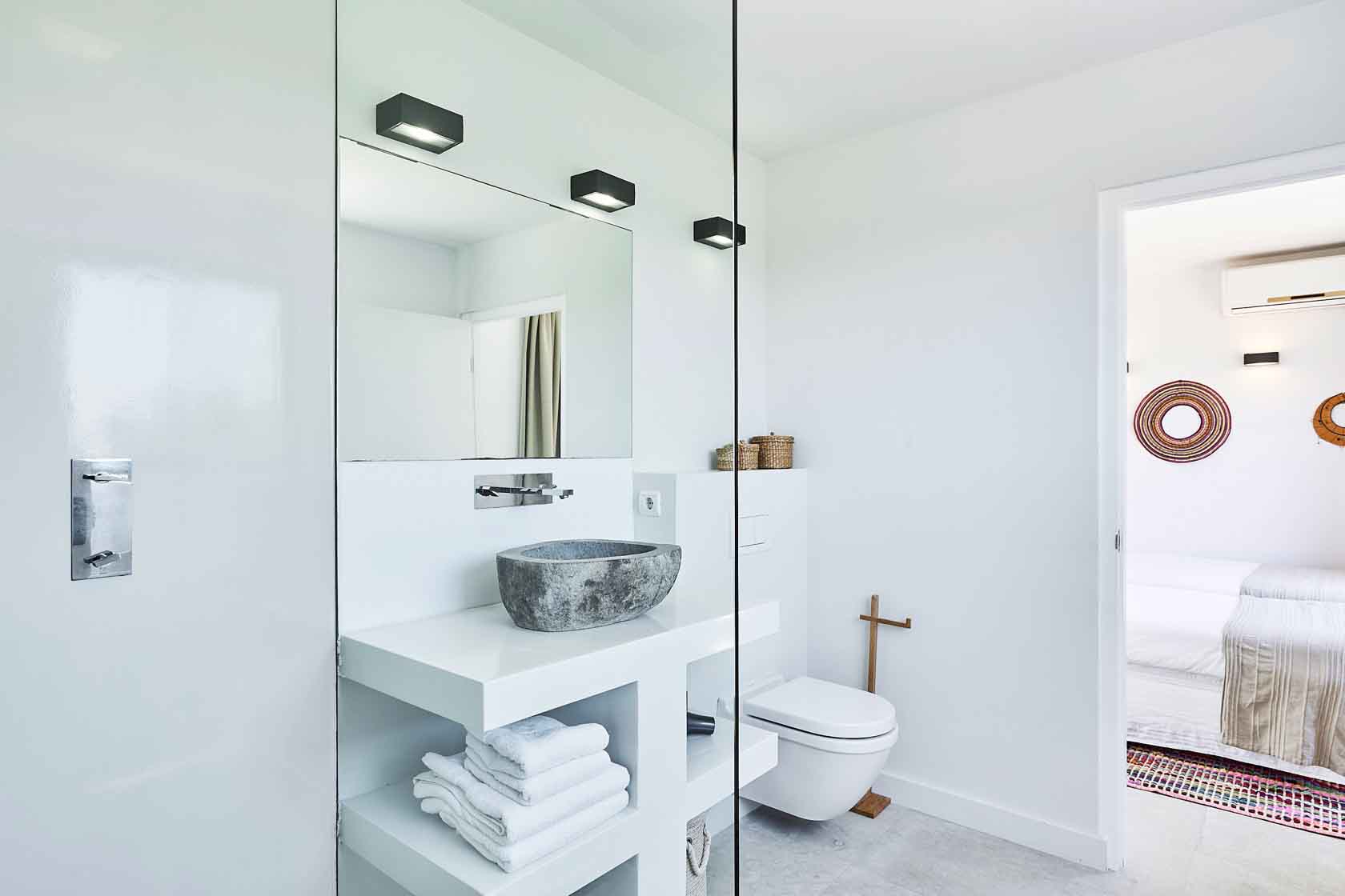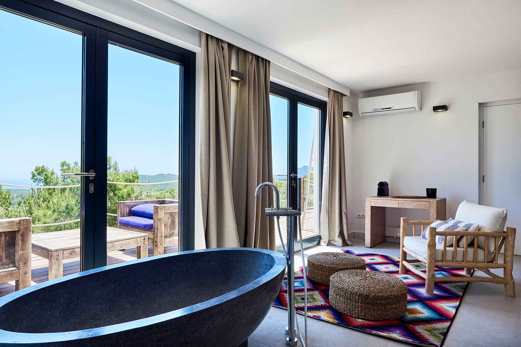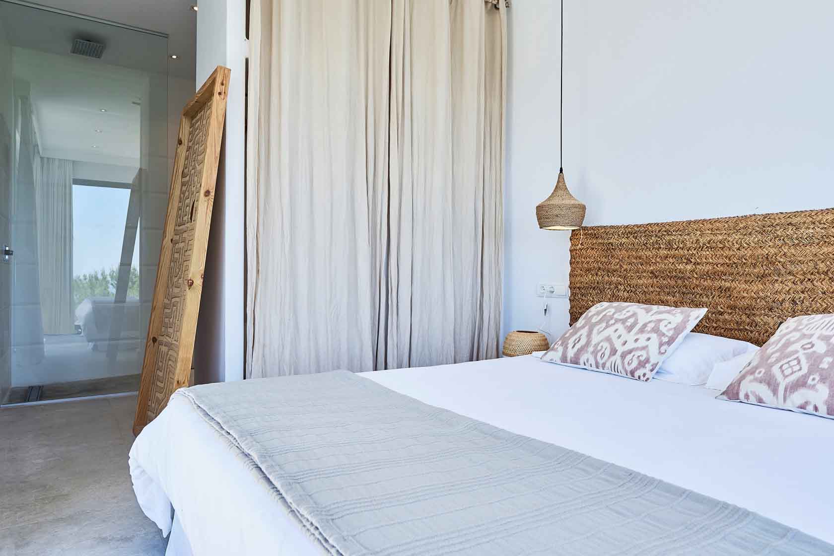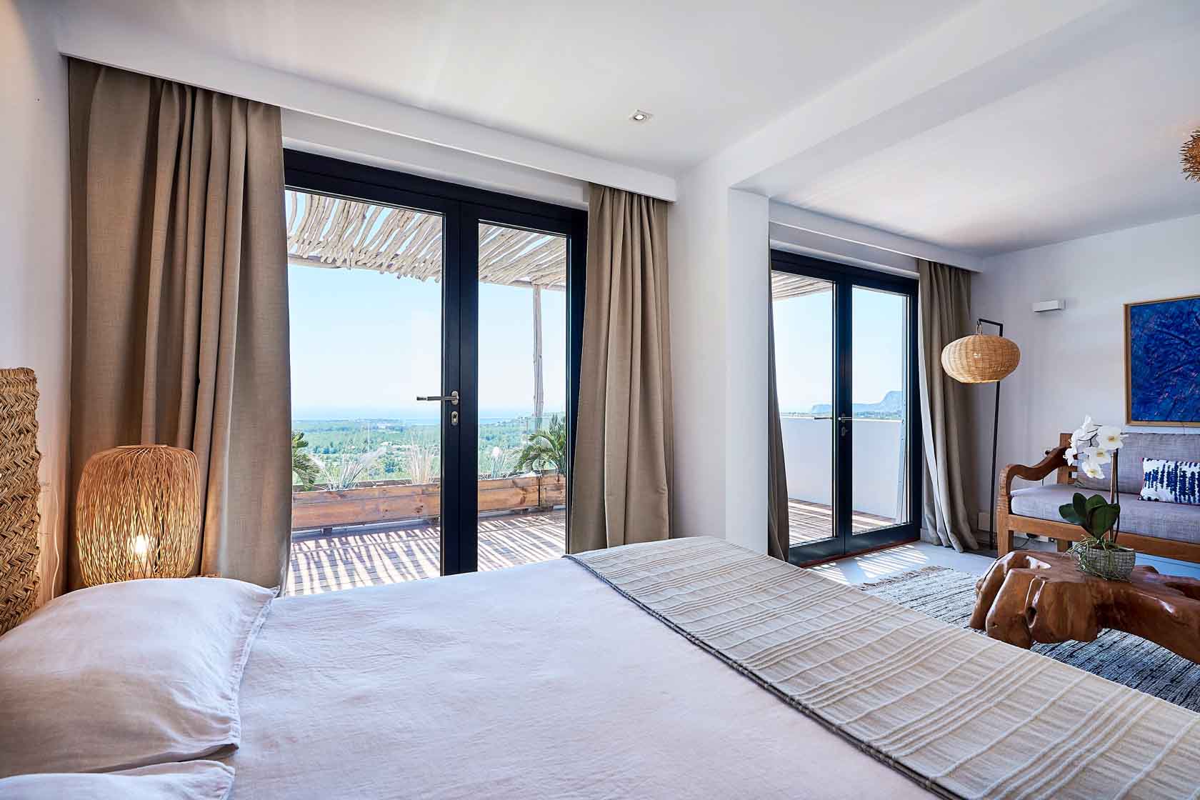 L’architecture de cette villa de luxe est minimaliste et les lignes épurées. La décoration intérieure a été également choisie soigneusement pour offrir des pièces agréables à vivre. Le tout forme un ensemble élégant. Depuis toutes les pièces à vivre on peut observer le bleu de la mer qui s’étend devant nos yeux. Les vertes vallées d’Ibiza sont aussi présentes dans le paysage, faisant un mélange parfait entre campagne et mer. Depuis la piscine la vue est panoramique. Le bassin de 18 mètres de long est parfait aussi bien pour les sportifs souhaitant faire des longueurs que pour les amateurs de farniente qui se laisseront flotter sur une bouée dans l’eau. A l’extérieur, tous les équipements sont présents pour profiter de la douceur du climat d’Ibiza: coin salon, transats ou encore table pour les repas.