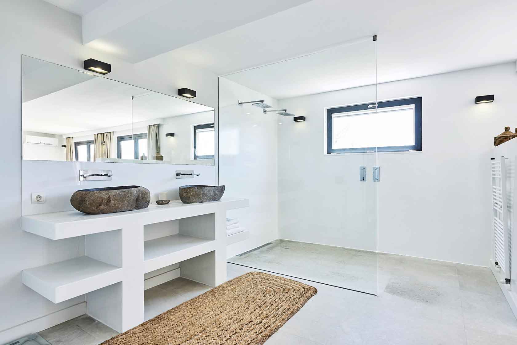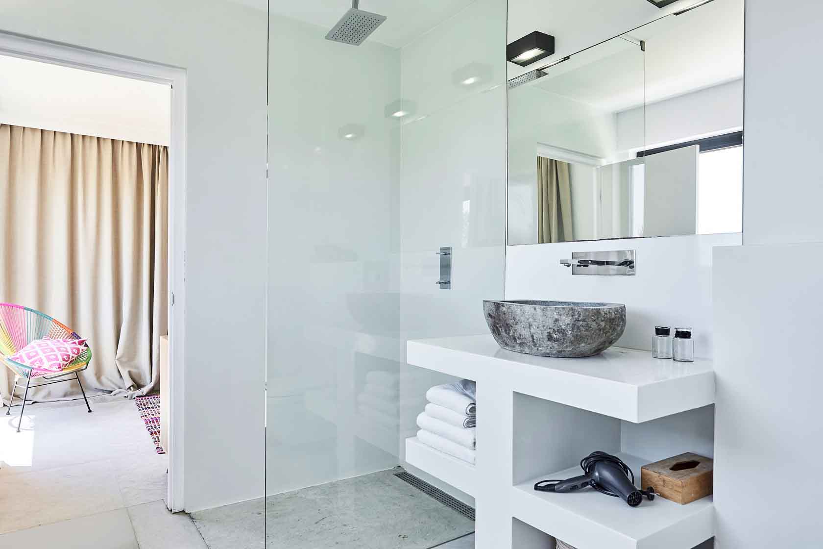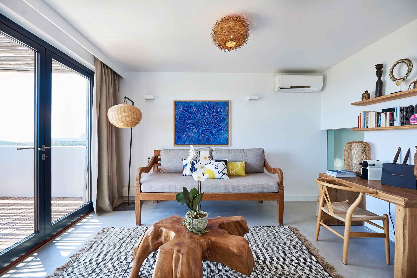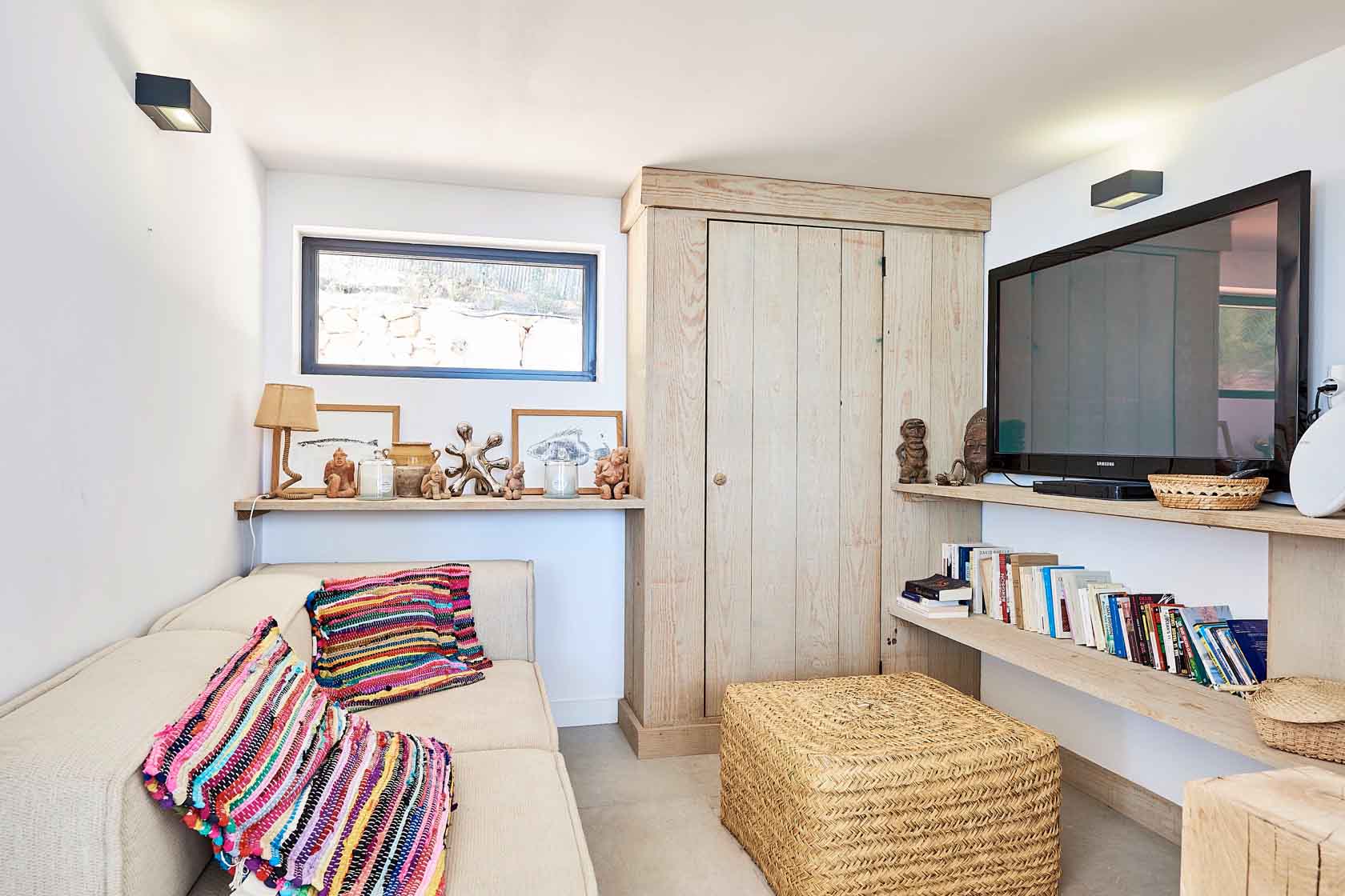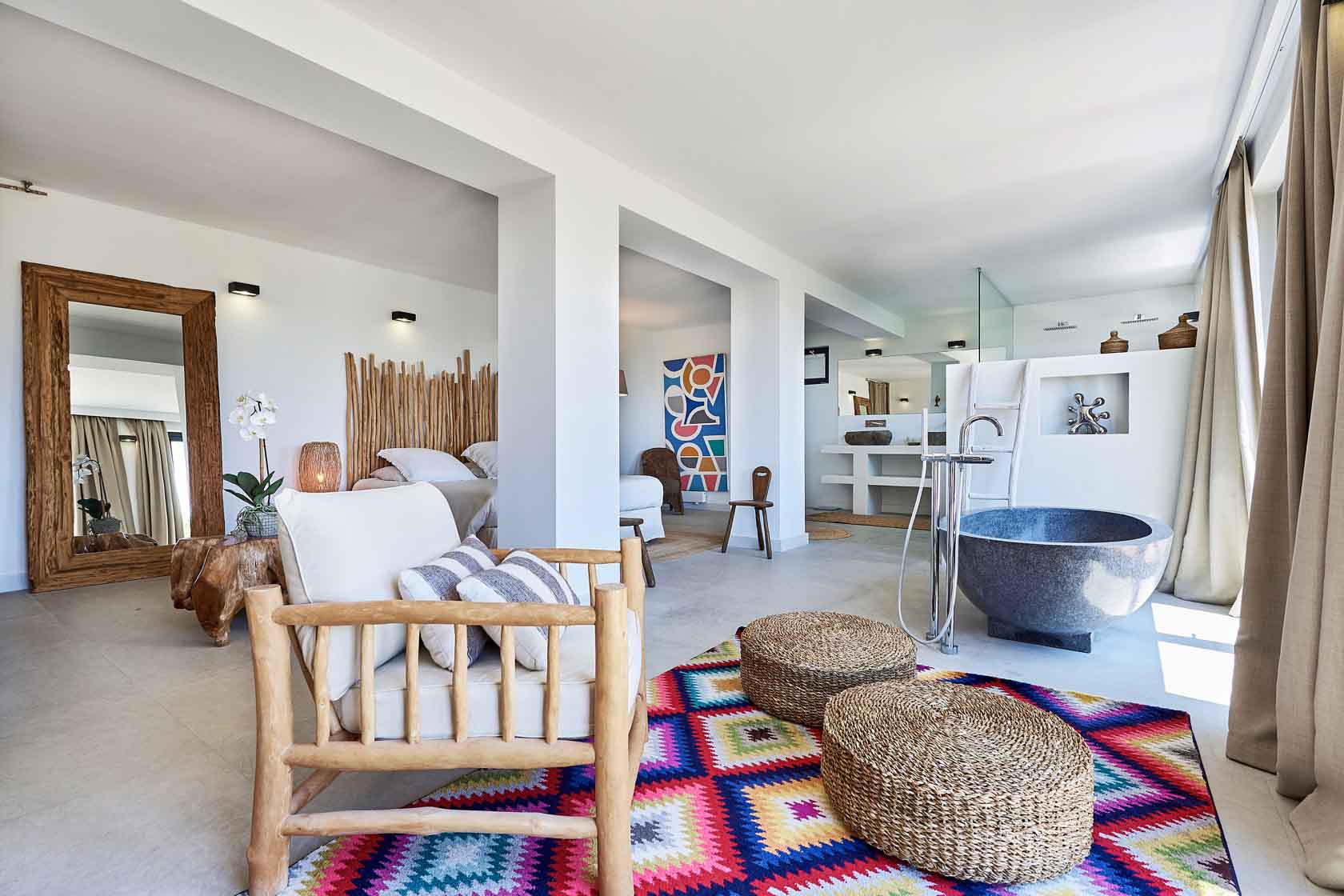 L’architecture de cette villa de luxe est minimaliste et les lignes épurées. La décoration intérieure a été également choisie soigneusement pour offrir des pièces agréables à vivre. Le tout forme un ensemble élégant. Depuis toutes les pièces à vivre on peut observer le bleu de la mer qui s’étend devant nos yeux. Les vertes vallées d’Ibiza sont aussi présentes dans le paysage, faisant un mélange parfait entre campagne et mer. Depuis la piscine la vue est panoramique. Le bassin de 18 mètres de long est parfait aussi bien pour les sportifs souhaitant faire des longueurs que pour les amateurs de farniente qui se laisseront flotter sur une bouée dans l’eau. A l’extérieur, tous les équipements sont présents pour profiter de la douceur du climat d’Ibiza: coin salon, transats ou encore table pour les repas.