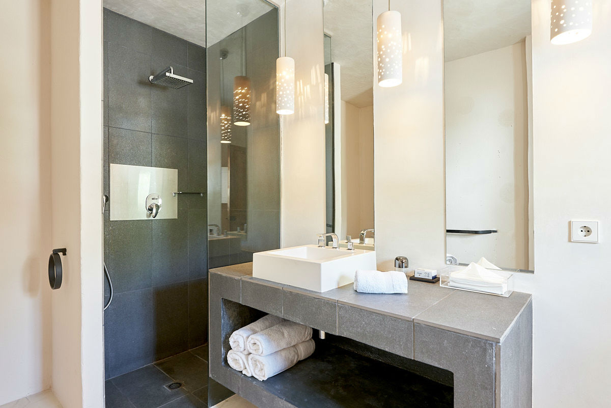 Cette villa est idéale pour un groupe de couples ou bien même une famille avec des enfants âgés. En effet, les cinq chambres ont toutes leurs propres salles de douche, ce qui permet à chacun d’avoir son intimité et son indépendance. La grande chambre de maître au premier étage a un coin bureau qui peut se transformer en chambre d’appoint pour un bébé en fermant la porte qui sépare les deux espaces. Elle dispose également d’une grande terrasse aménagée privative. Le deuxième bâtiment indépendant, réunit trois chambres ainsi qu’un petit salon au premier étage. Avec sa cheminée et ses poutres en bois foncé, ce coin ressemble à un petit cocon où l’on peut se reposer en feuilletant un livre de la bibliothèque ou en regardant un film au coin du feu pendant les (rares) journées de pluie.