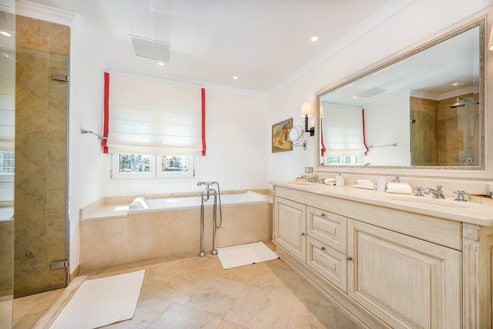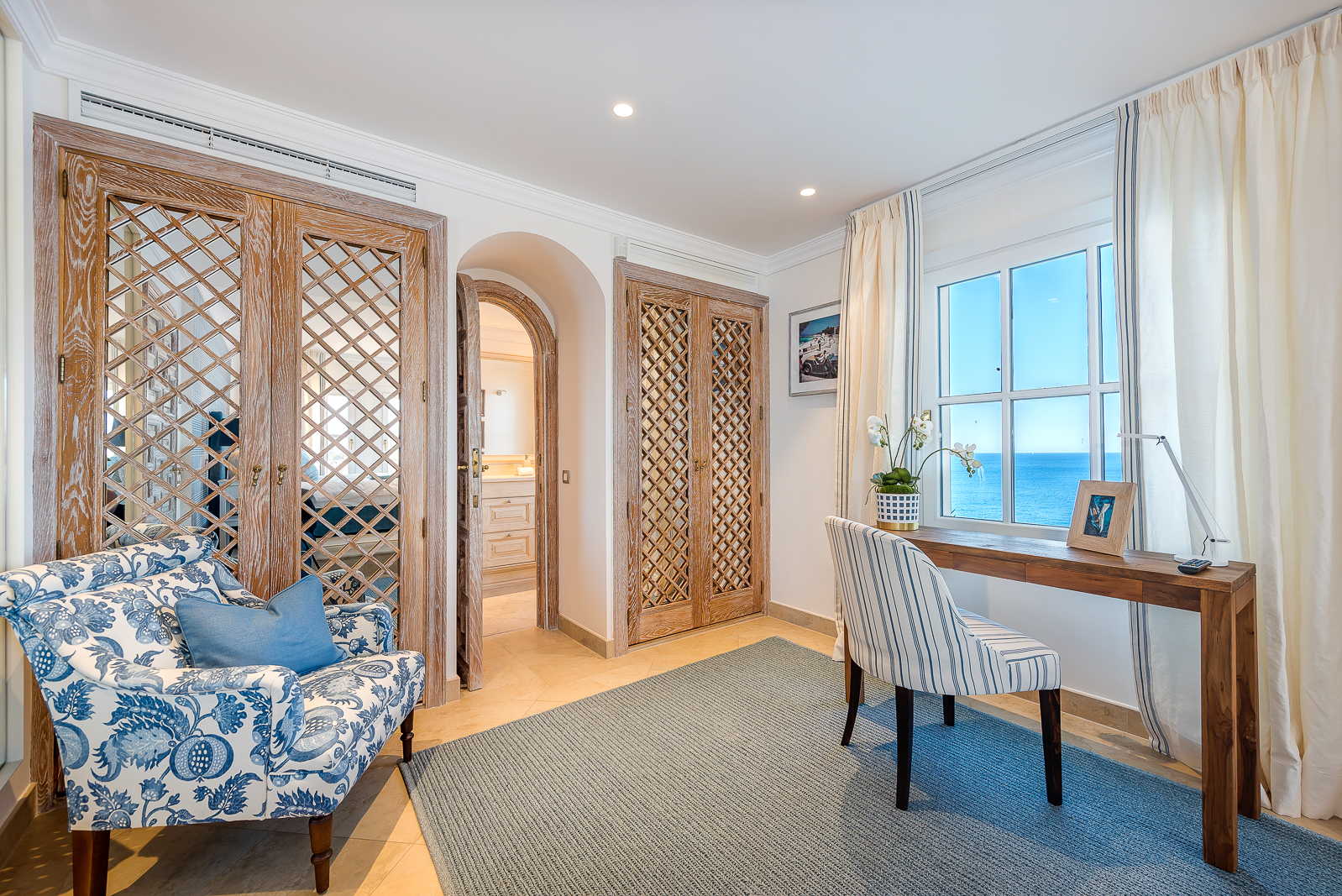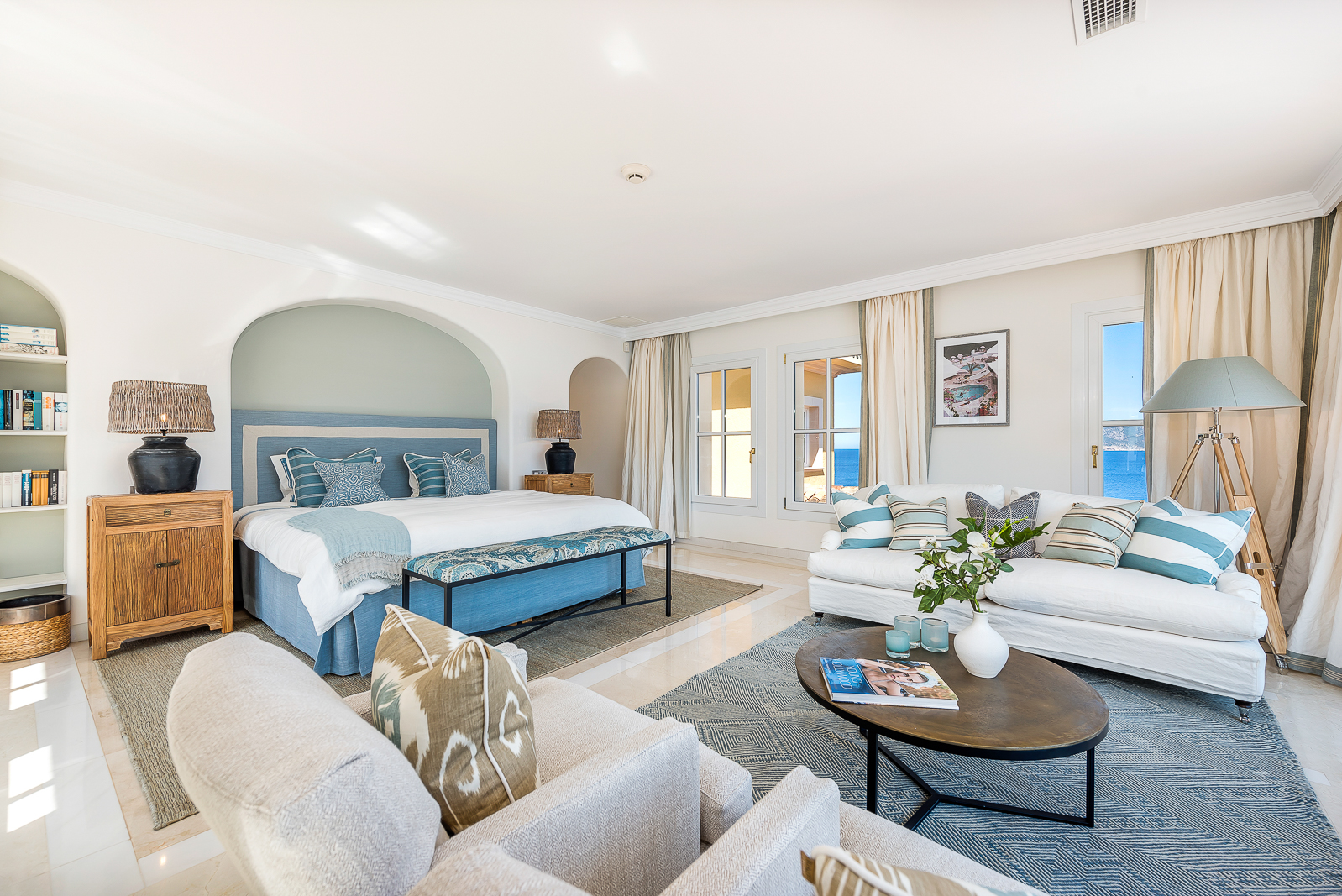 Chambre de Maître avec coin salon, vue mer et Salle de bain en suite avec douche, baignoire, lavabo double
