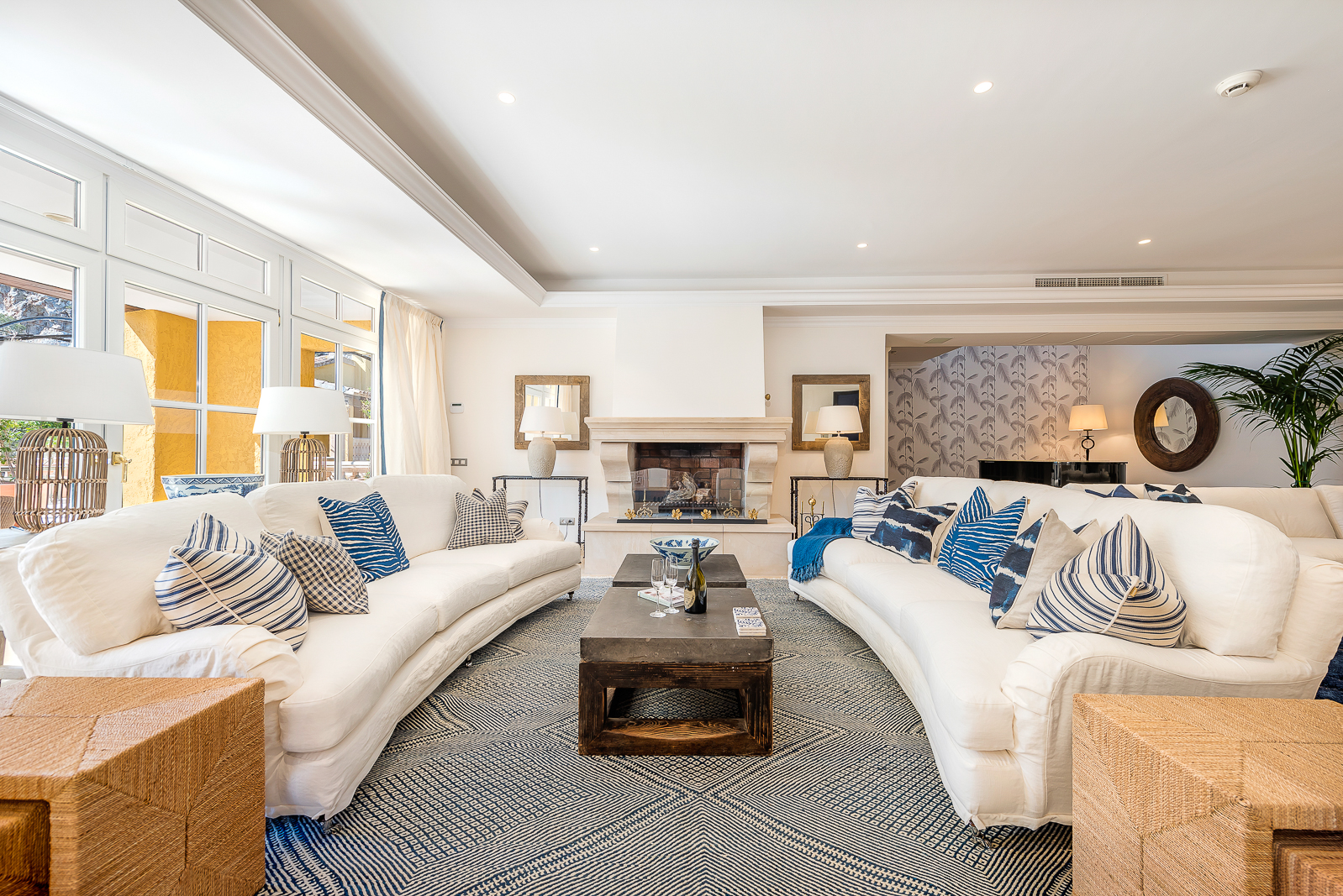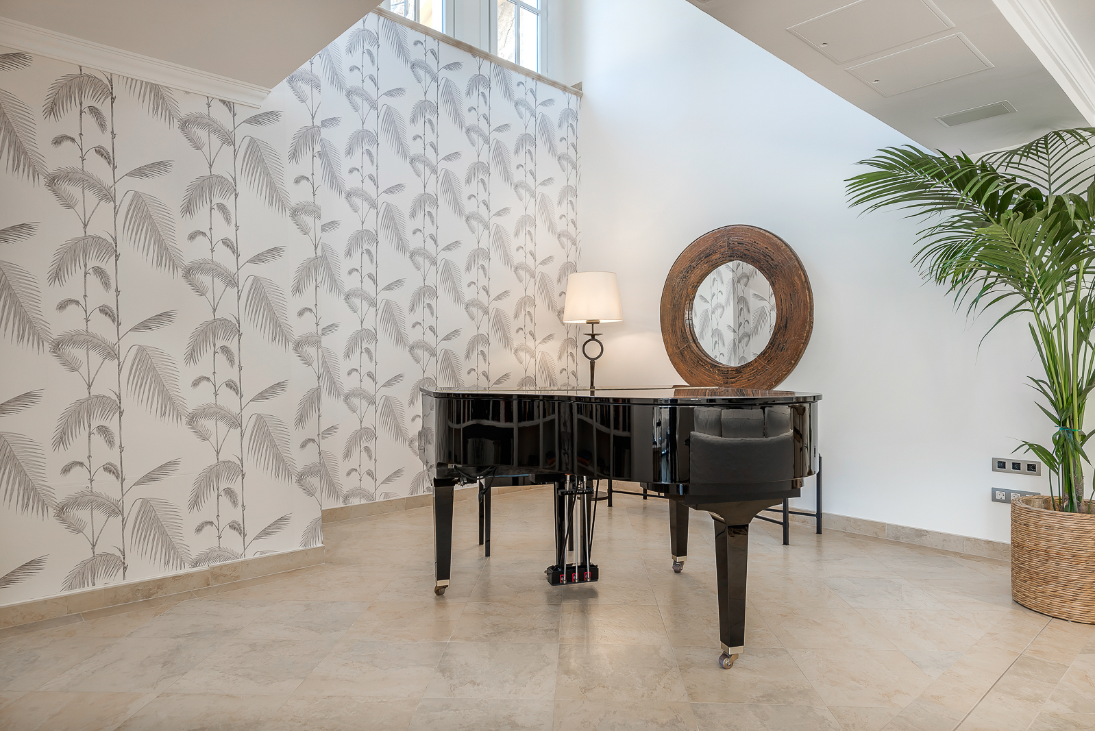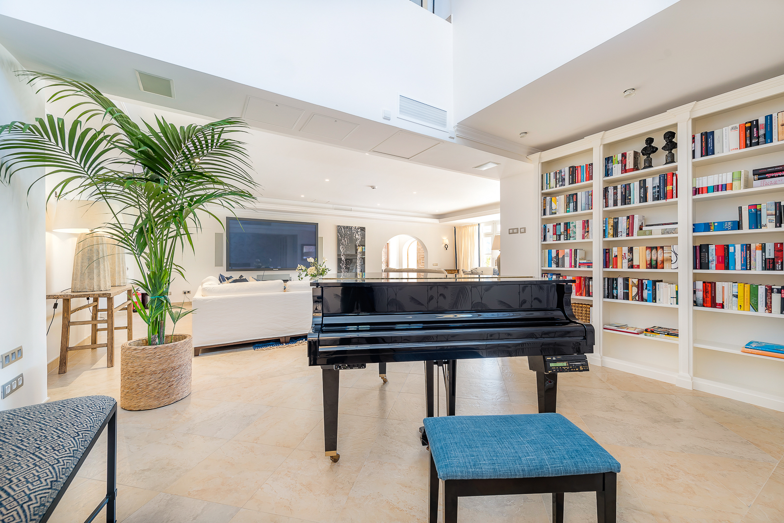 Salon avec accès terrasse, bibliothèque, piano, cheminée, télévision