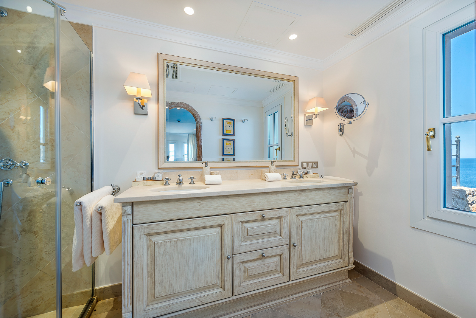 Chambre double avec télévision, coin bureau, vue mer et Salle de bain en suite avec douche, lavabo double