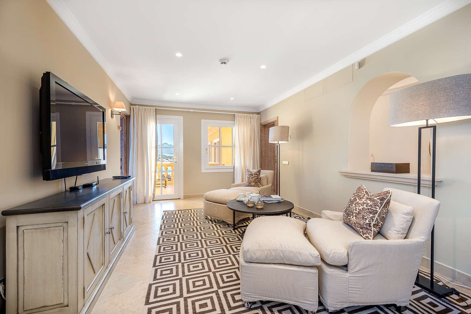 Chambre double avec coin salon, balcon, télévision et Salle de bain en suite avec douche, baignoire, lavabo double