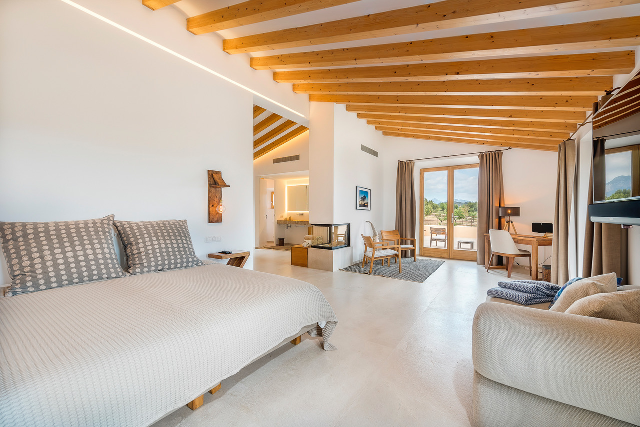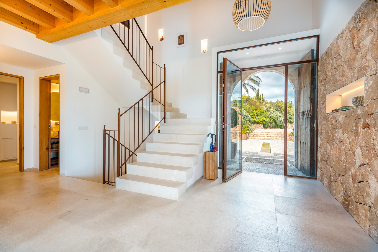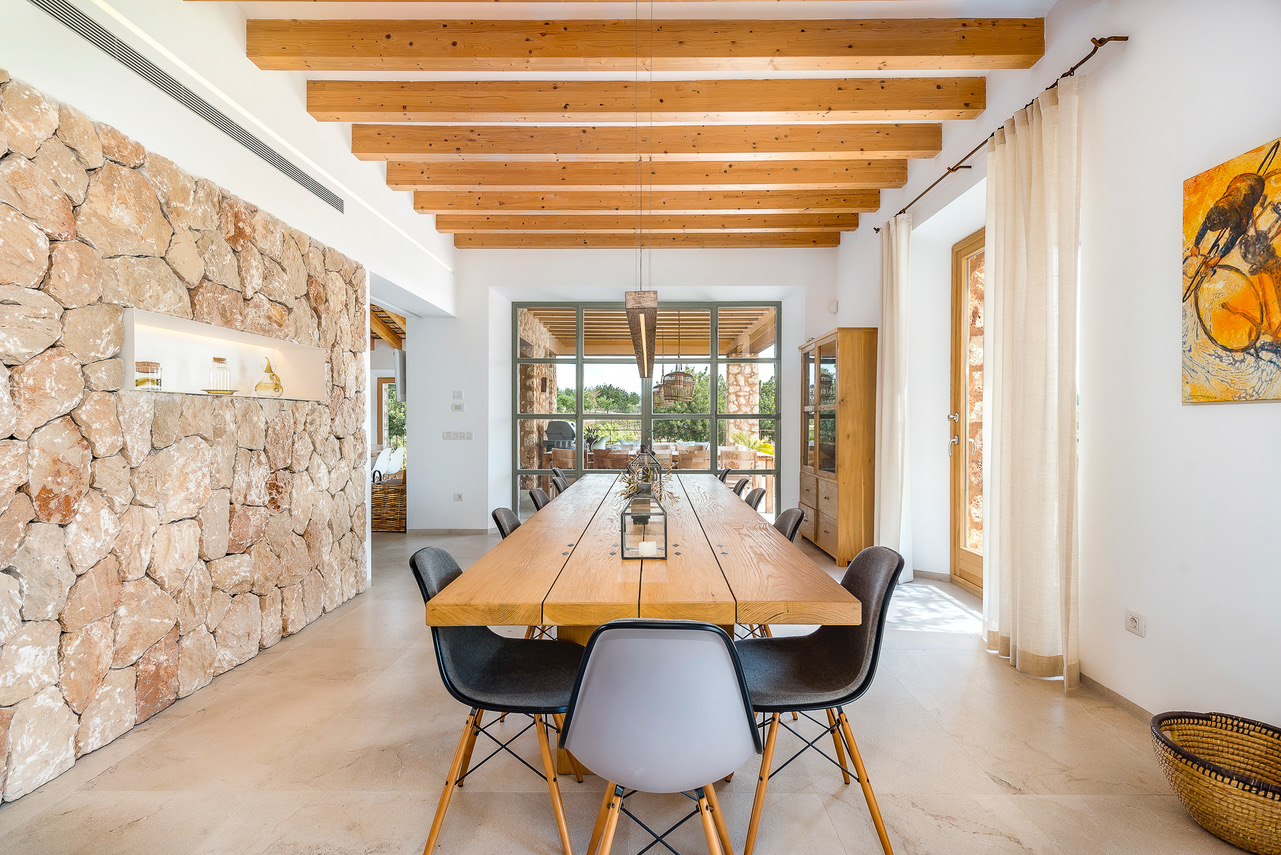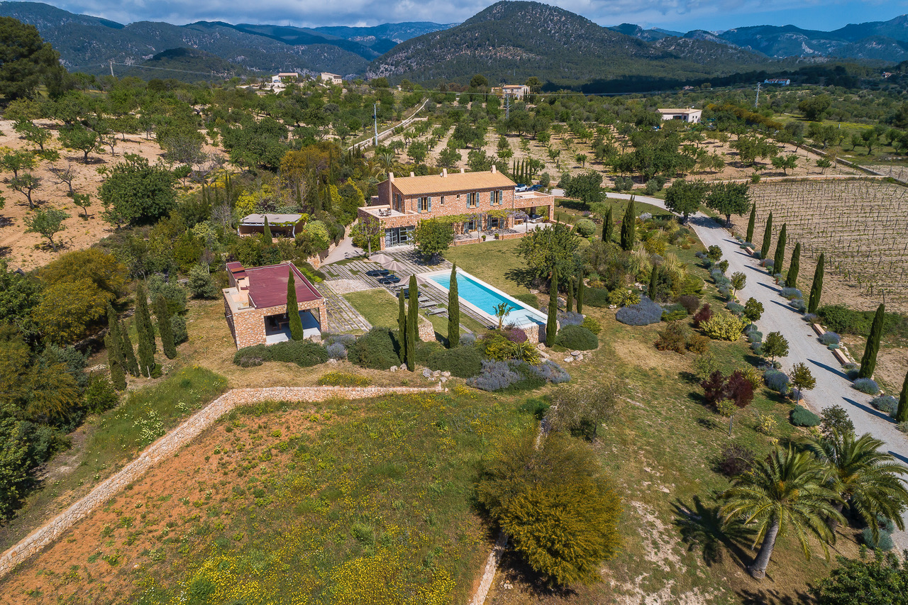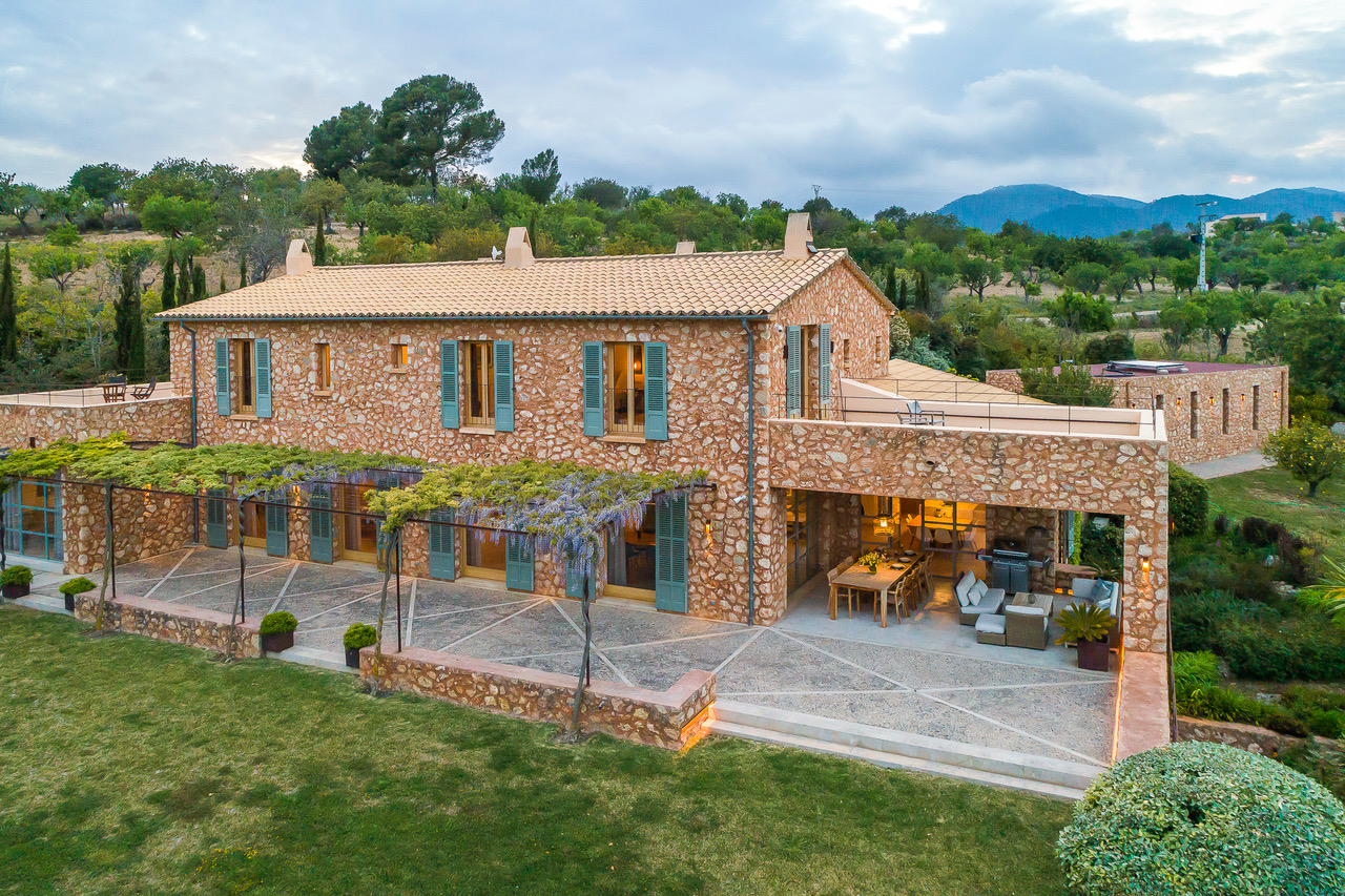 Cette récente Finca de 600 m2 a été construite en alliant parfaitement tradition et modernité. La pierre naturelle des murs extérieurs, que l’on retrouve dans certaines pièces intérieures, donne un c ôté authentique. Les équipements et la décoration que l’on trouve aussi bien dedans que dehors sont modernes et confortables. Les groupes de 10 personnes sont parfaitement à leur aise ici gr âce aux 5 chambres qui disposent toutes de leur propre salle de bain. La chambre de ma ître est un cocon idéal pour les couples : canapé, télévision, terrasse privative ou encore belle baignoire, tout a été pensé pour profiter au maximum de cette pièce. Différents espaces détentes ont été aménagés dans la villa avec un coin salon avec cheminée ou encore un autre avec télévision. Les grandes baies vitrées laissent grandement entrer la lumière et permettent d’observer la verte vue sur le jardin. La salle à manger avec sa large table tout comme la grande cuisine donnent sur une belle terrasse couverte. On peut y manger à l’ombre tout en utilisant le barbecue, ou profiter d’un verre sur les canapés et fauteuils. Une salle de sport très bien équipée est à votre disposition pour vous permettre de maintenir votre forme, même loin de chez vous.