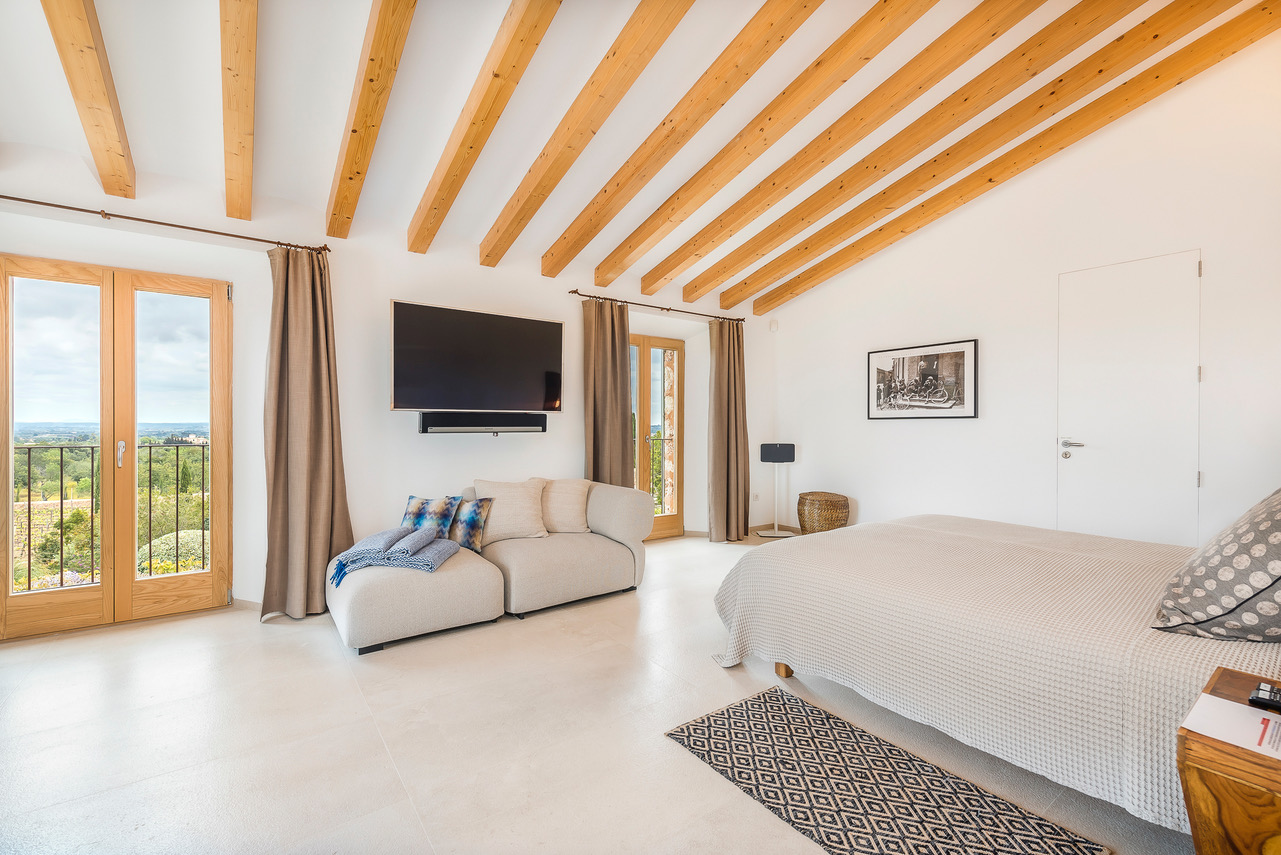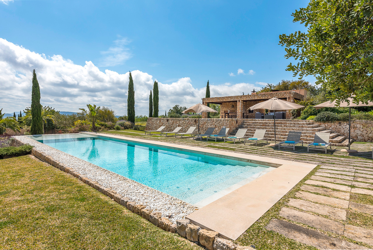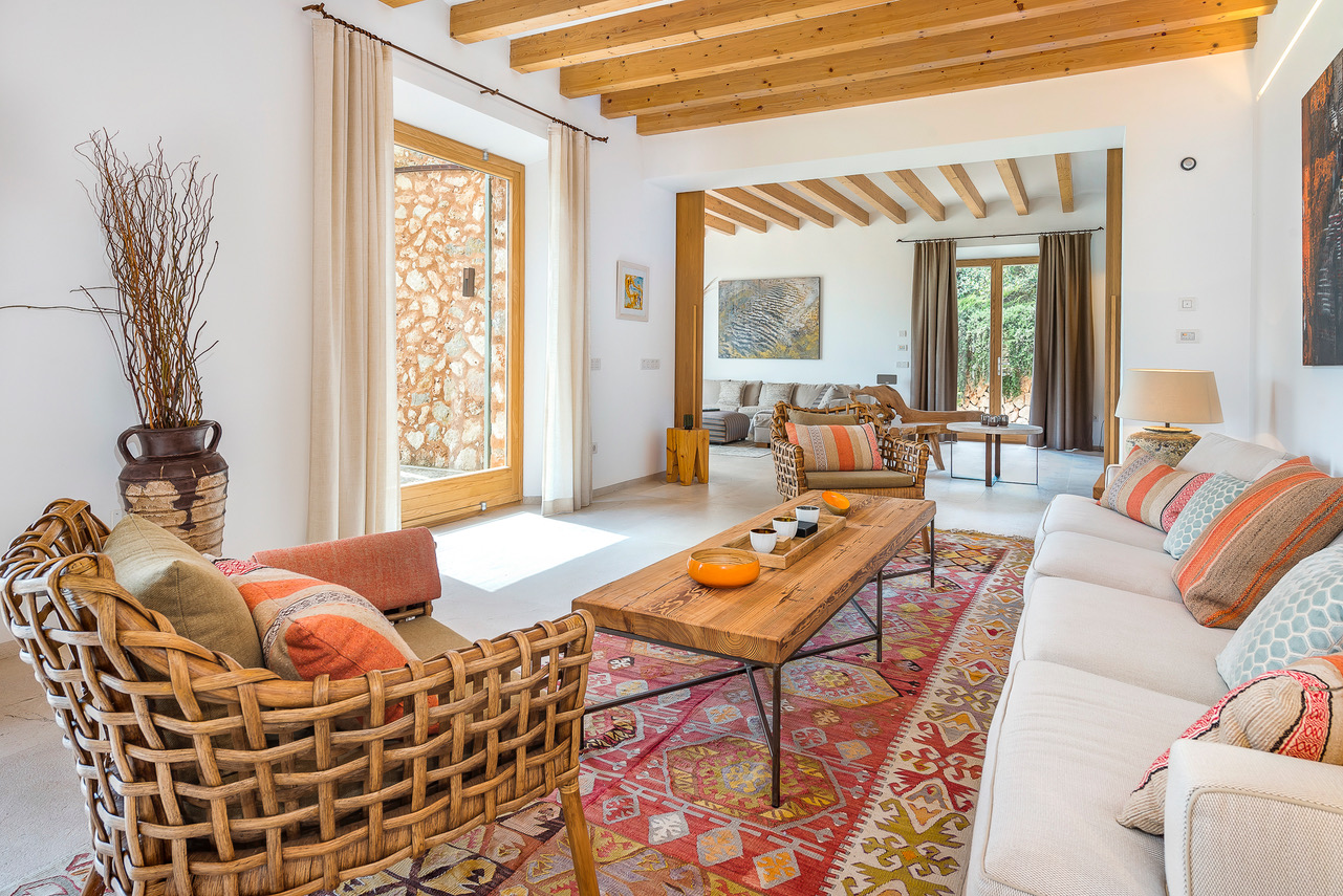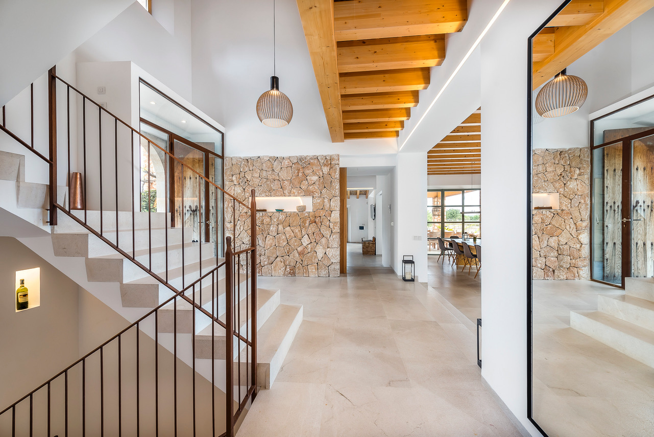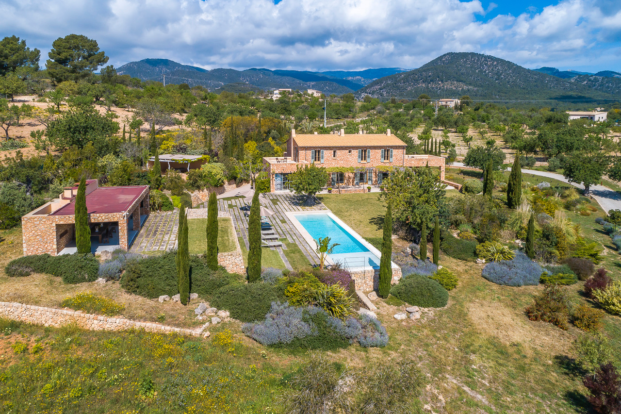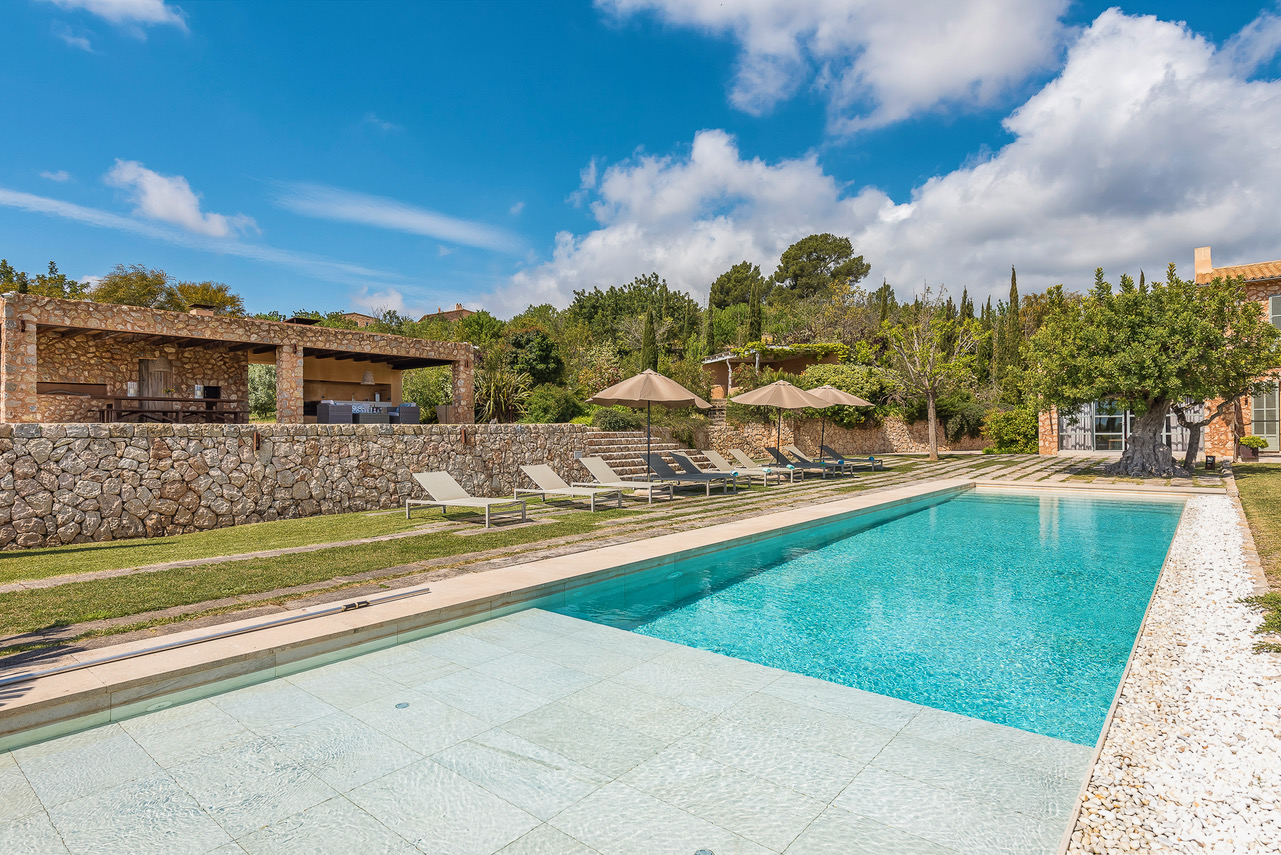 Cette récente Finca de 600 m2 a été construite en alliant parfaitement tradition et modernité. La pierre naturelle des murs extérieurs, que l’on retrouve dans certaines pièces intérieures, donne un c ôté authentique. Les équipements et la décoration que l’on trouve aussi bien dedans que dehors sont modernes et confortables. Les groupes de 10 personnes sont parfaitement à leur aise ici gr âce aux 5 chambres qui disposent toutes de leur propre salle de bain. La chambre de ma ître est un cocon idéal pour les couples : canapé, télévision, terrasse privative ou encore belle baignoire, tout a été pensé pour profiter au maximum de cette pièce. Différents espaces détentes ont été aménagés dans la villa avec un coin salon avec cheminée ou encore un autre avec télévision. Les grandes baies vitrées laissent grandement entrer la lumière et permettent d’observer la verte vue sur le jardin. La salle à manger avec sa large table tout comme la grande cuisine donnent sur une belle terrasse couverte. On peut y manger à l’ombre tout en utilisant le barbecue, ou profiter d’un verre sur les canapés et fauteuils. Une salle de sport très bien équipée est à votre disposition pour vous permettre de maintenir votre forme, même loin de chez vous.