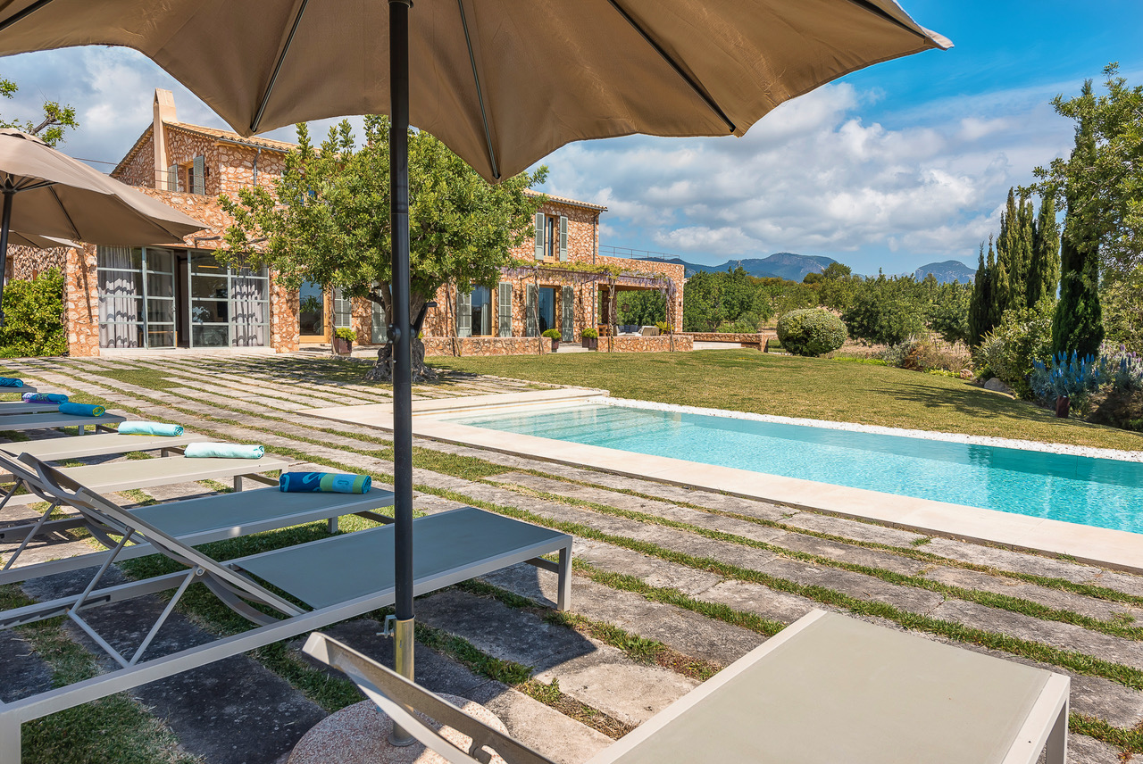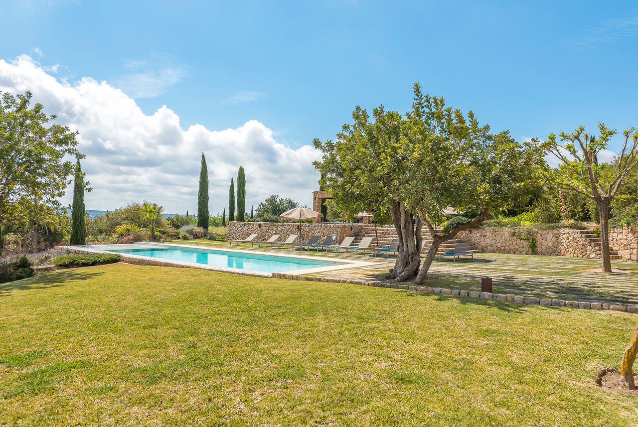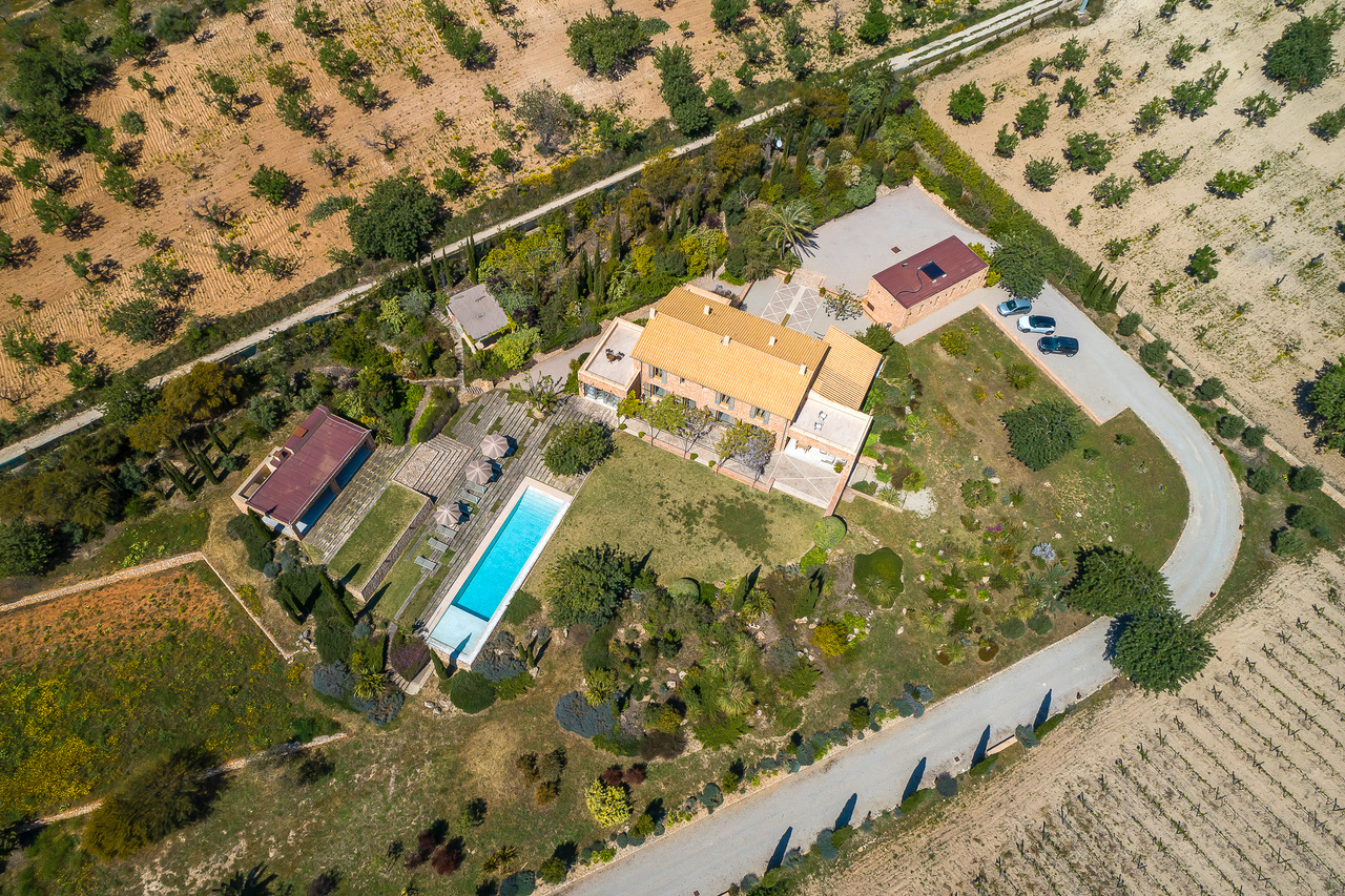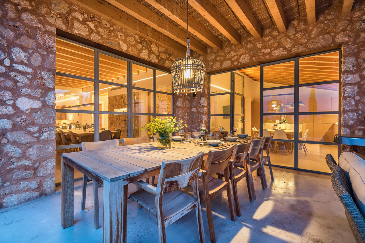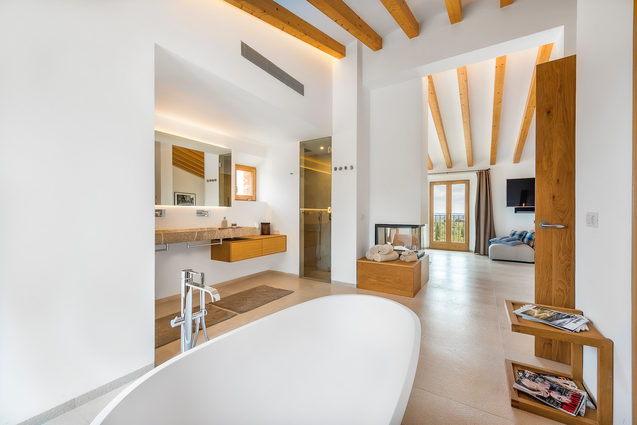 Cette récente Finca de 600 m2 a été construite en alliant parfaitement tradition et modernité. La pierre naturelle des murs extérieurs, que l’on retrouve dans certaines pièces intérieures, donne un c ôté authentique. Les équipements et la décoration que l’on trouve aussi bien dedans que dehors sont modernes et confortables. Les groupes de 10 personnes sont parfaitement à leur aise ici gr âce aux 5 chambres qui disposent toutes de leur propre salle de bain. La chambre de ma ître est un cocon idéal pour les couples : canapé, télévision, terrasse privative ou encore belle baignoire, tout a été pensé pour profiter au maximum de cette pièce. Différents espaces détentes ont été aménagés dans la villa avec un coin salon avec cheminée ou encore un autre avec télévision. Les grandes baies vitrées laissent grandement entrer la lumière et permettent d’observer la verte vue sur le jardin. La salle à manger avec sa large table tout comme la grande cuisine donnent sur une belle terrasse couverte. On peut y manger à l’ombre tout en utilisant le barbecue, ou profiter d’un verre sur les canapés et fauteuils. Une salle de sport très bien équipée est à votre disposition pour vous permettre de maintenir votre forme, même loin de chez vous.