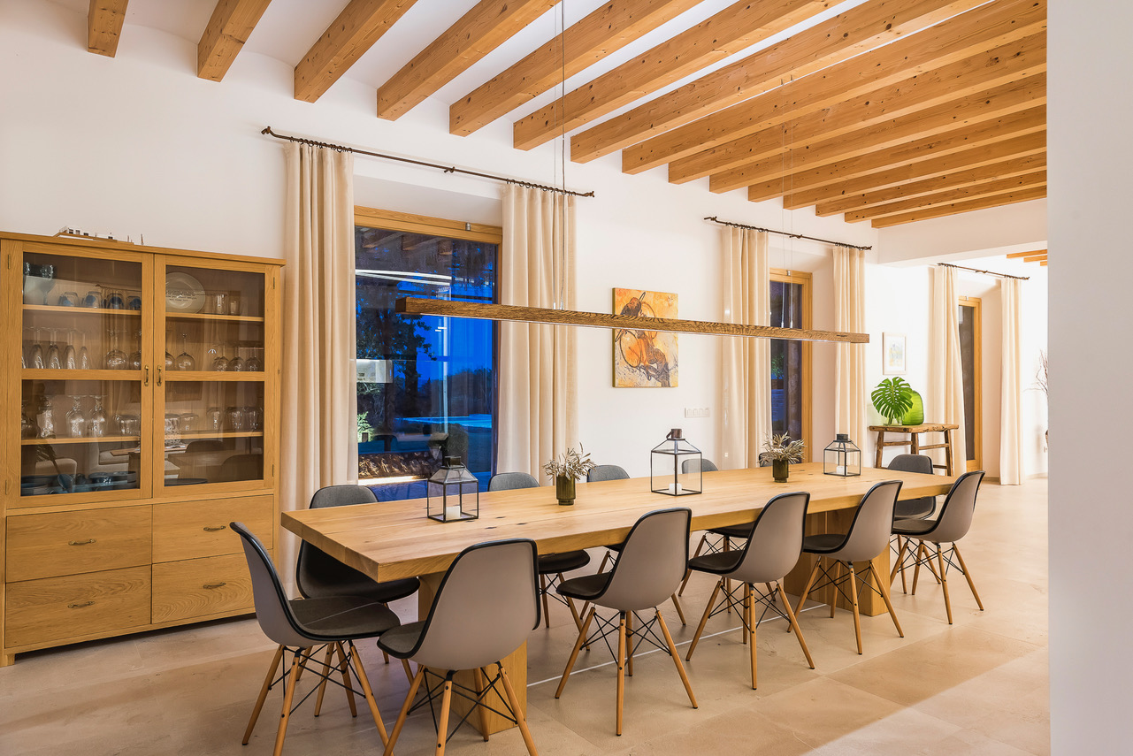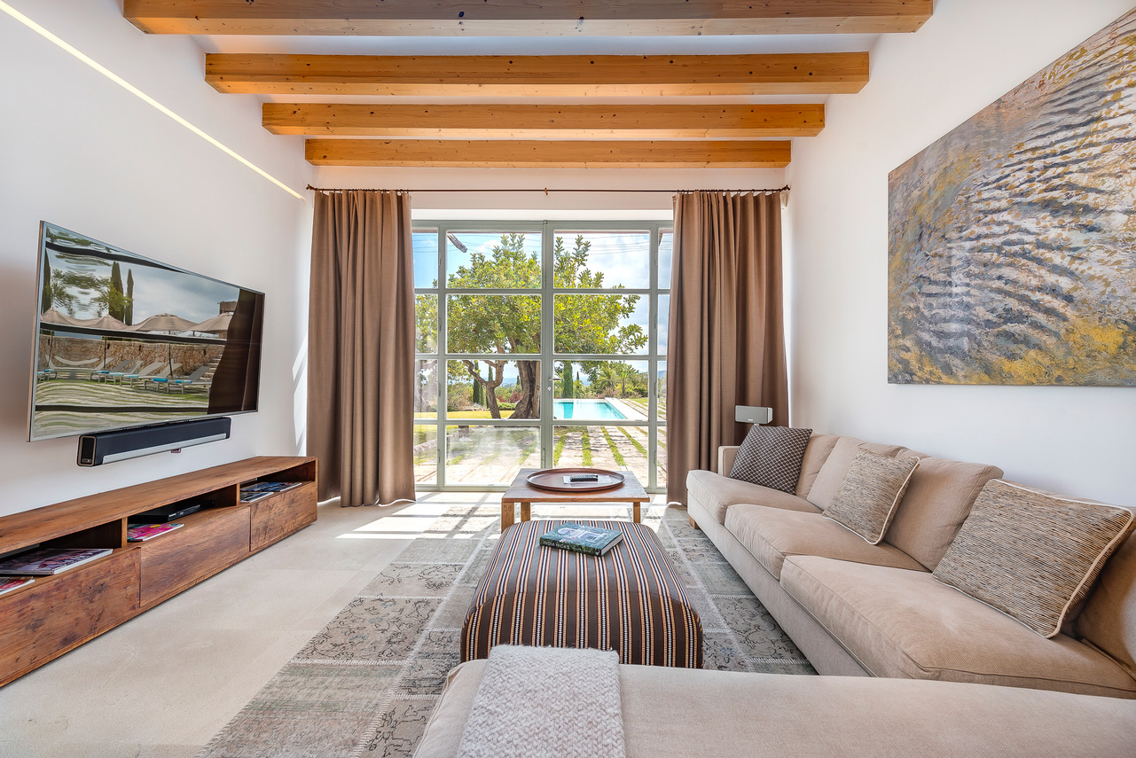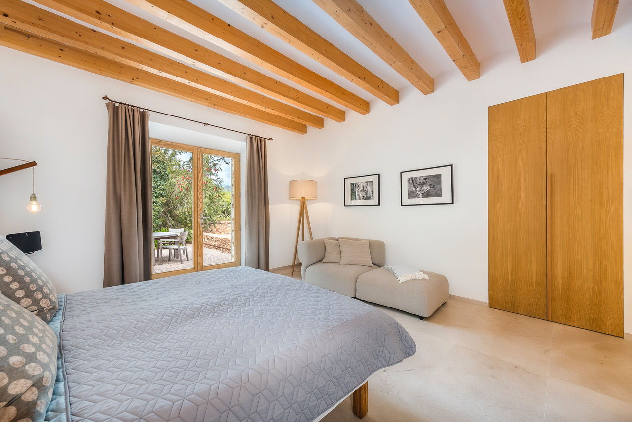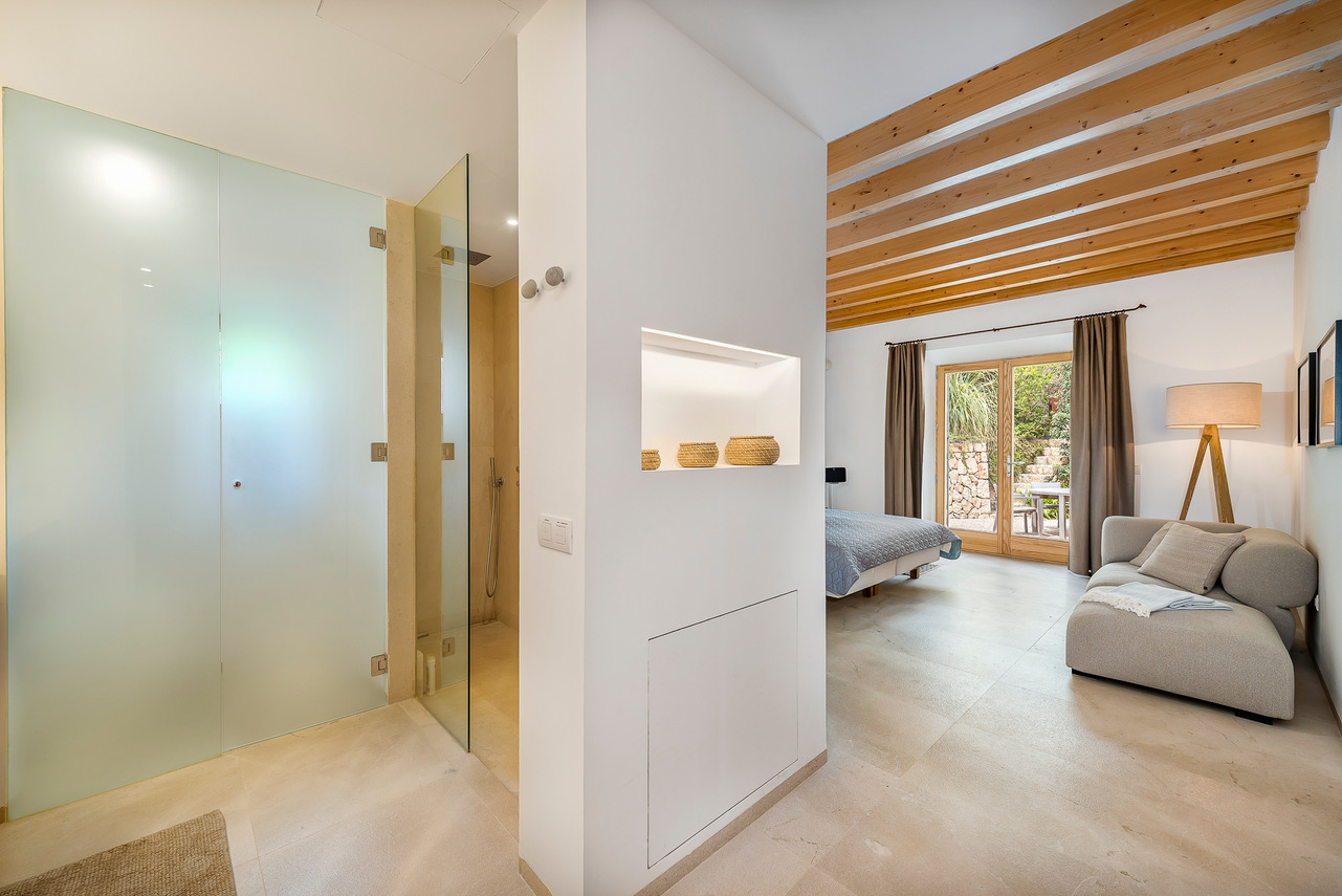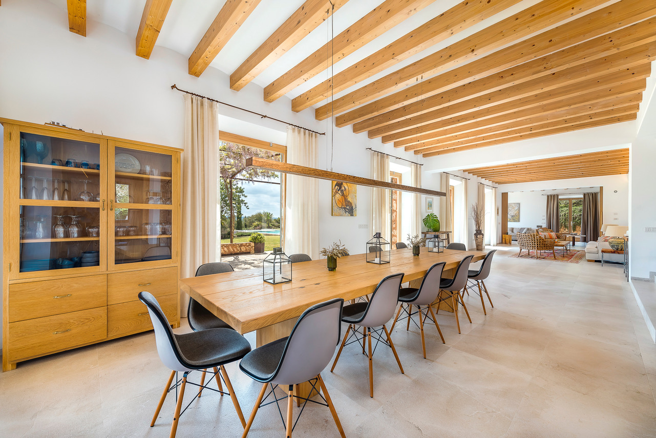 Cette récente Finca de 600 m2 a été construite en alliant parfaitement tradition et modernité. La pierre naturelle des murs extérieurs, que l’on retrouve dans certaines pièces intérieures, donne un c ôté authentique. Les équipements et la décoration que l’on trouve aussi bien dedans que dehors sont modernes et confortables. Les groupes de 10 personnes sont parfaitement à leur aise ici gr âce aux 5 chambres qui disposent toutes de leur propre salle de bain. La chambre de ma ître est un cocon idéal pour les couples : canapé, télévision, terrasse privative ou encore belle baignoire, tout a été pensé pour profiter au maximum de cette pièce. Différents espaces détentes ont été aménagés dans la villa avec un coin salon avec cheminée ou encore un autre avec télévision. Les grandes baies vitrées laissent grandement entrer la lumière et permettent d’observer la verte vue sur le jardin. La salle à manger avec sa large table tout comme la grande cuisine donnent sur une belle terrasse couverte. On peut y manger à l’ombre tout en utilisant le barbecue, ou profiter d’un verre sur les canapés et fauteuils. Une salle de sport très bien équipée est à votre disposition pour vous permettre de maintenir votre forme, même loin de chez vous.