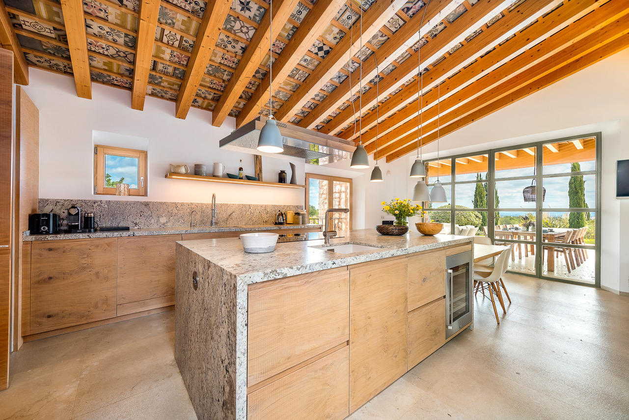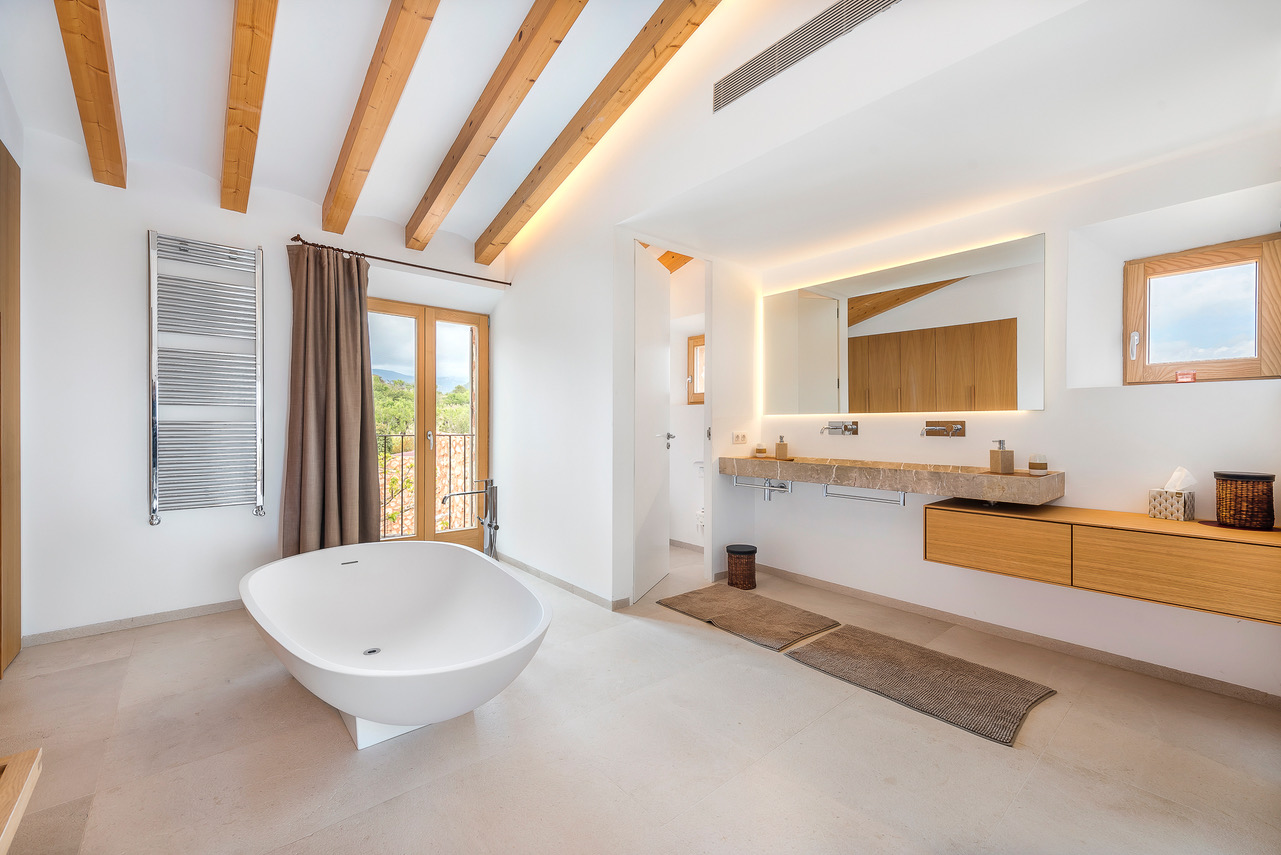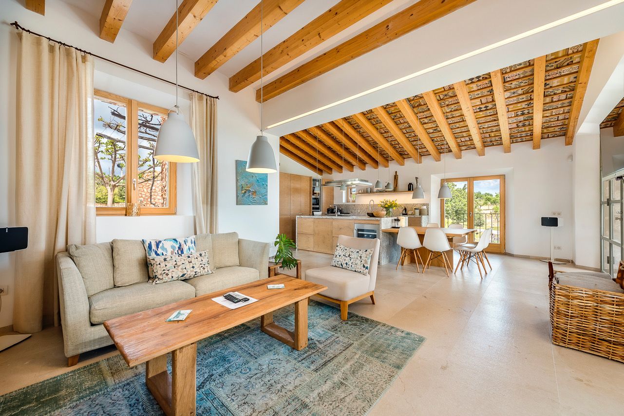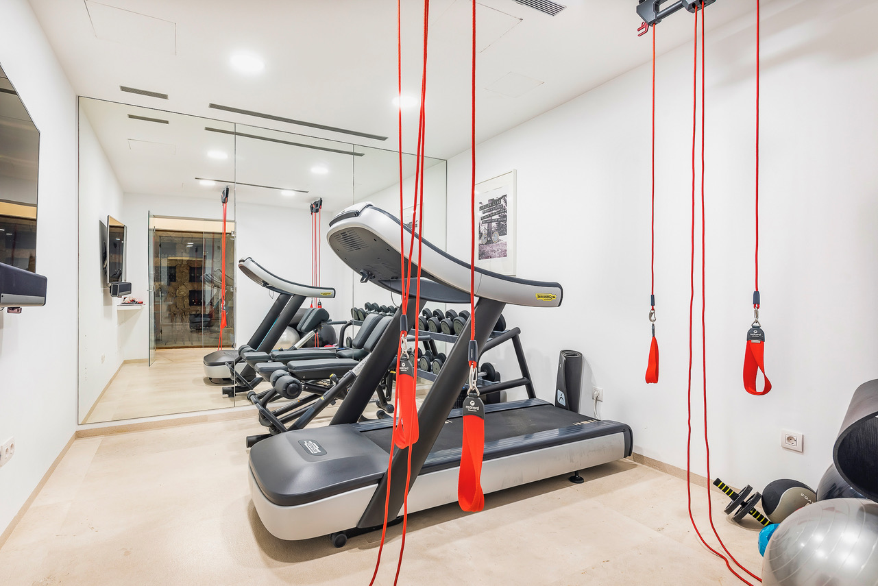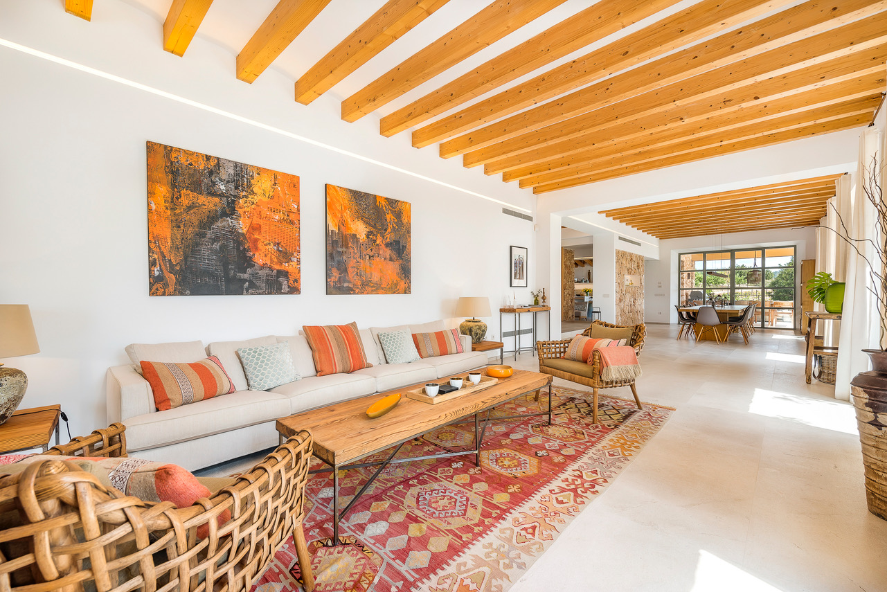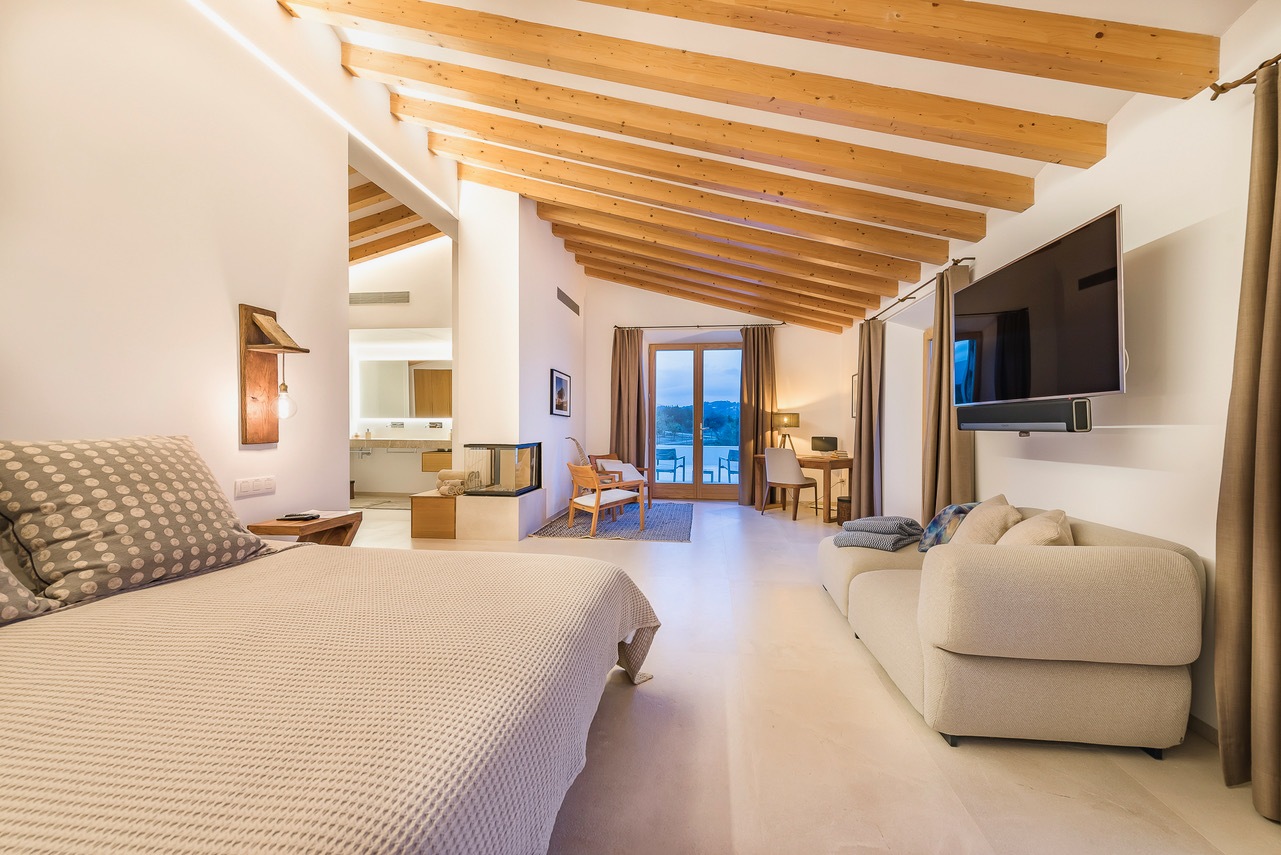 Cette récente Finca de 600 m2 a été construite en alliant parfaitement tradition et modernité. La pierre naturelle des murs extérieurs, que l’on retrouve dans certaines pièces intérieures, donne un c ôté authentique. Les équipements et la décoration que l’on trouve aussi bien dedans que dehors sont modernes et confortables. Les groupes de 10 personnes sont parfaitement à leur aise ici gr âce aux 5 chambres qui disposent toutes de leur propre salle de bain. La chambre de ma ître est un cocon idéal pour les couples : canapé, télévision, terrasse privative ou encore belle baignoire, tout a été pensé pour profiter au maximum de cette pièce. Différents espaces détentes ont été aménagés dans la villa avec un coin salon avec cheminée ou encore un autre avec télévision. Les grandes baies vitrées laissent grandement entrer la lumière et permettent d’observer la verte vue sur le jardin. La salle à manger avec sa large table tout comme la grande cuisine donnent sur une belle terrasse couverte. On peut y manger à l’ombre tout en utilisant le barbecue, ou profiter d’un verre sur les canapés et fauteuils. Une salle de sport très bien équipée est à votre disposition pour vous permettre de maintenir votre forme, même loin de chez vous.