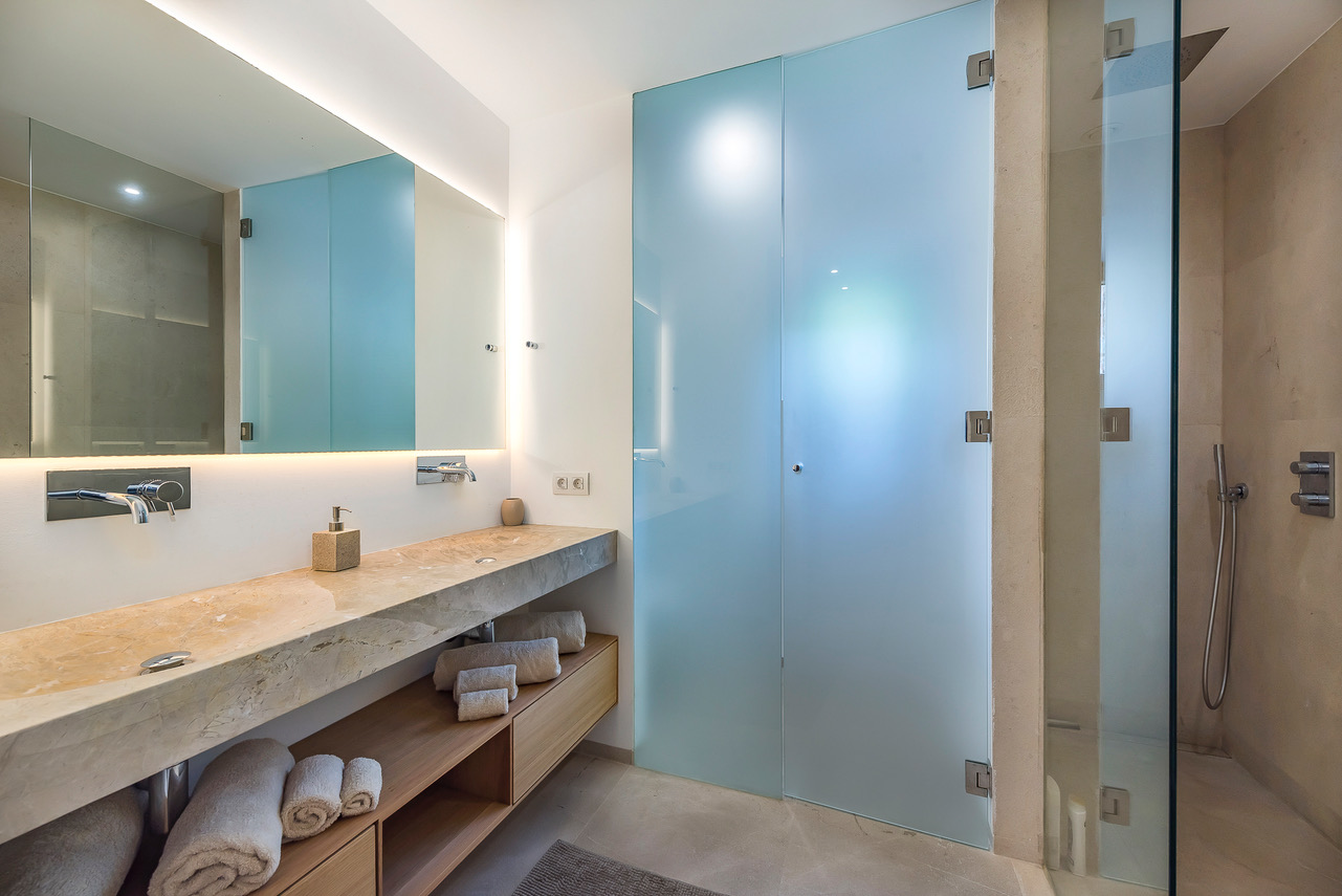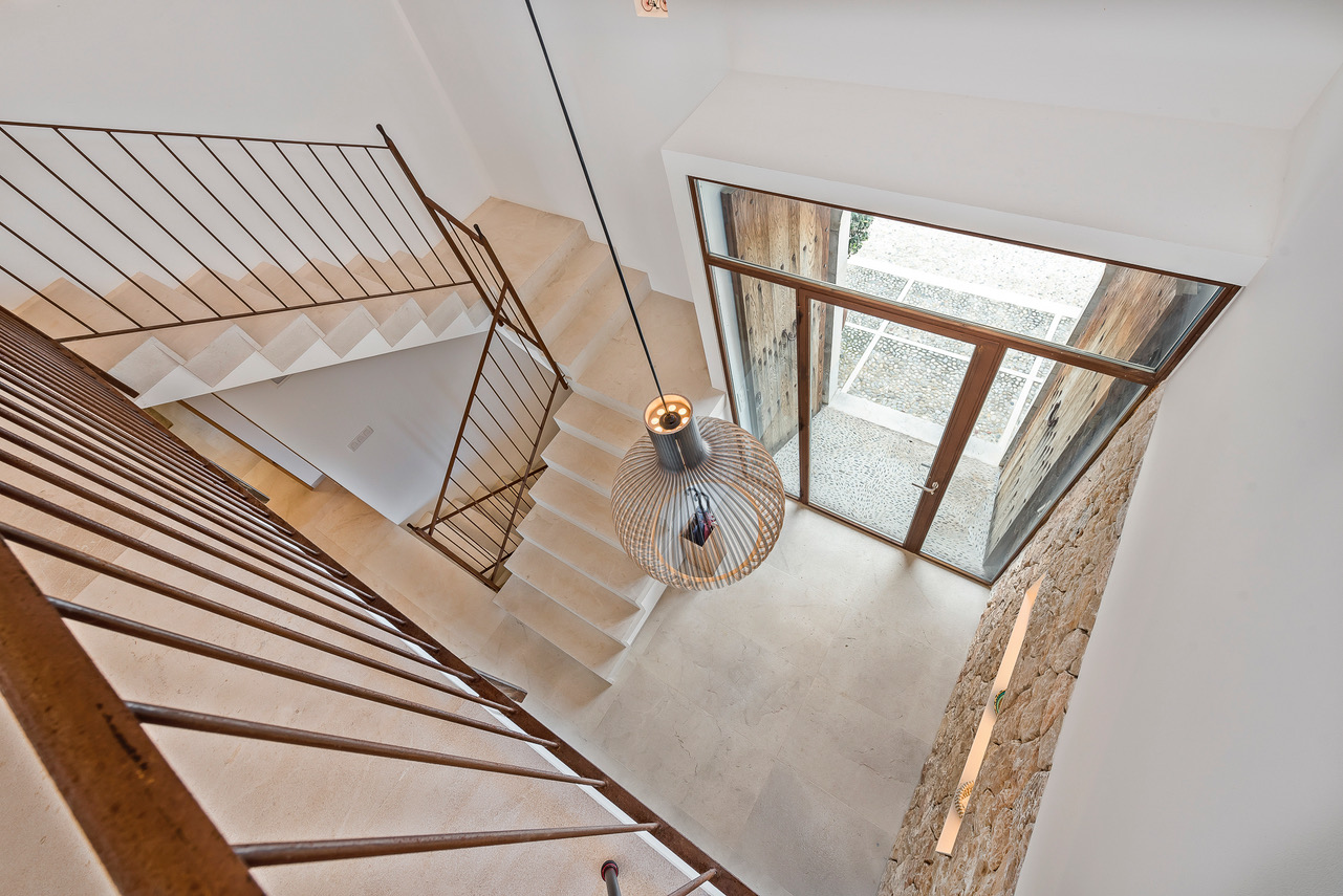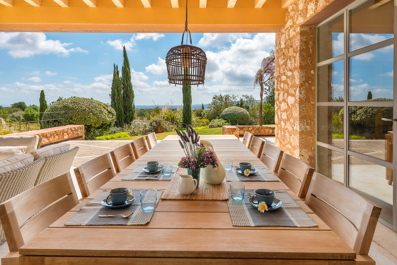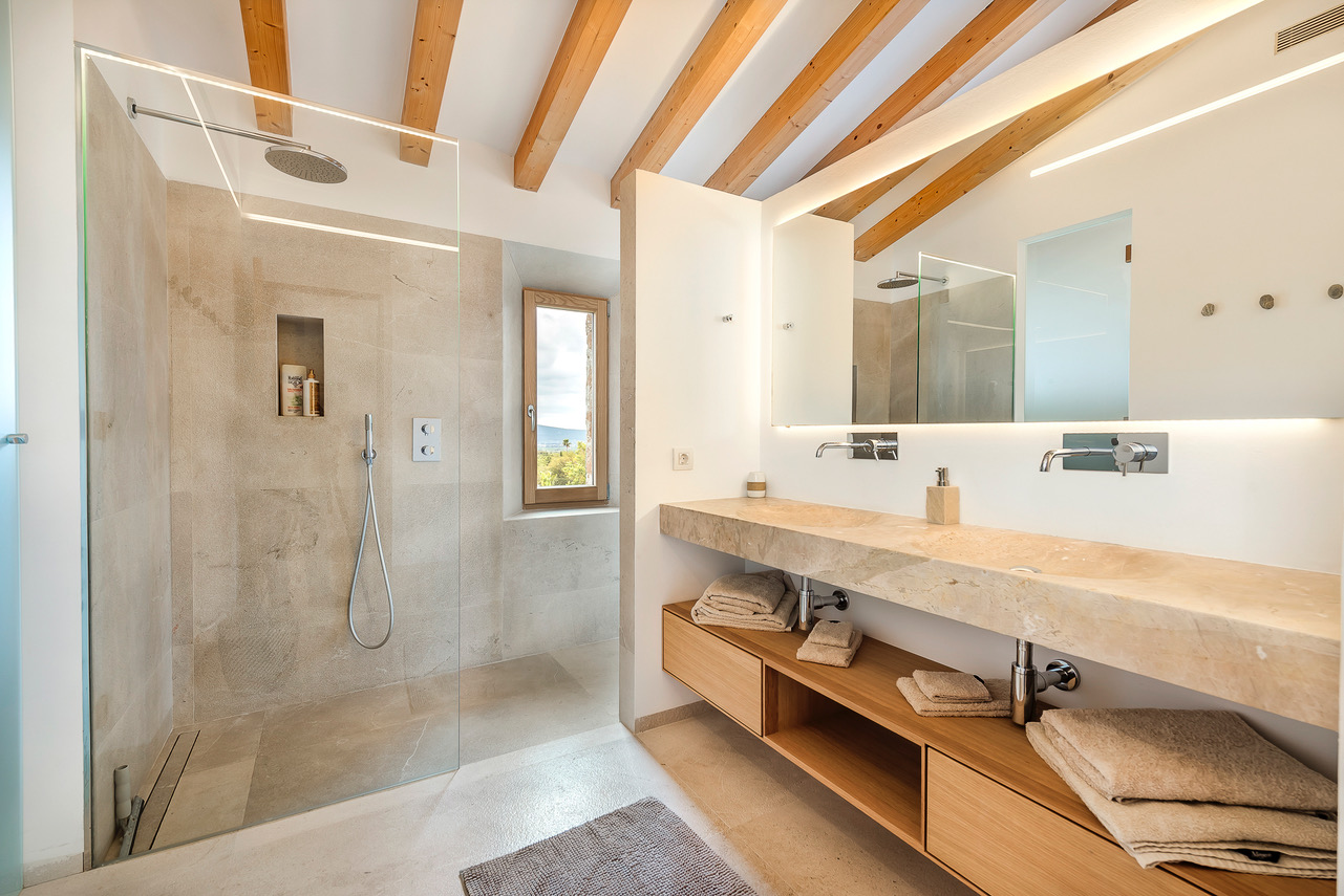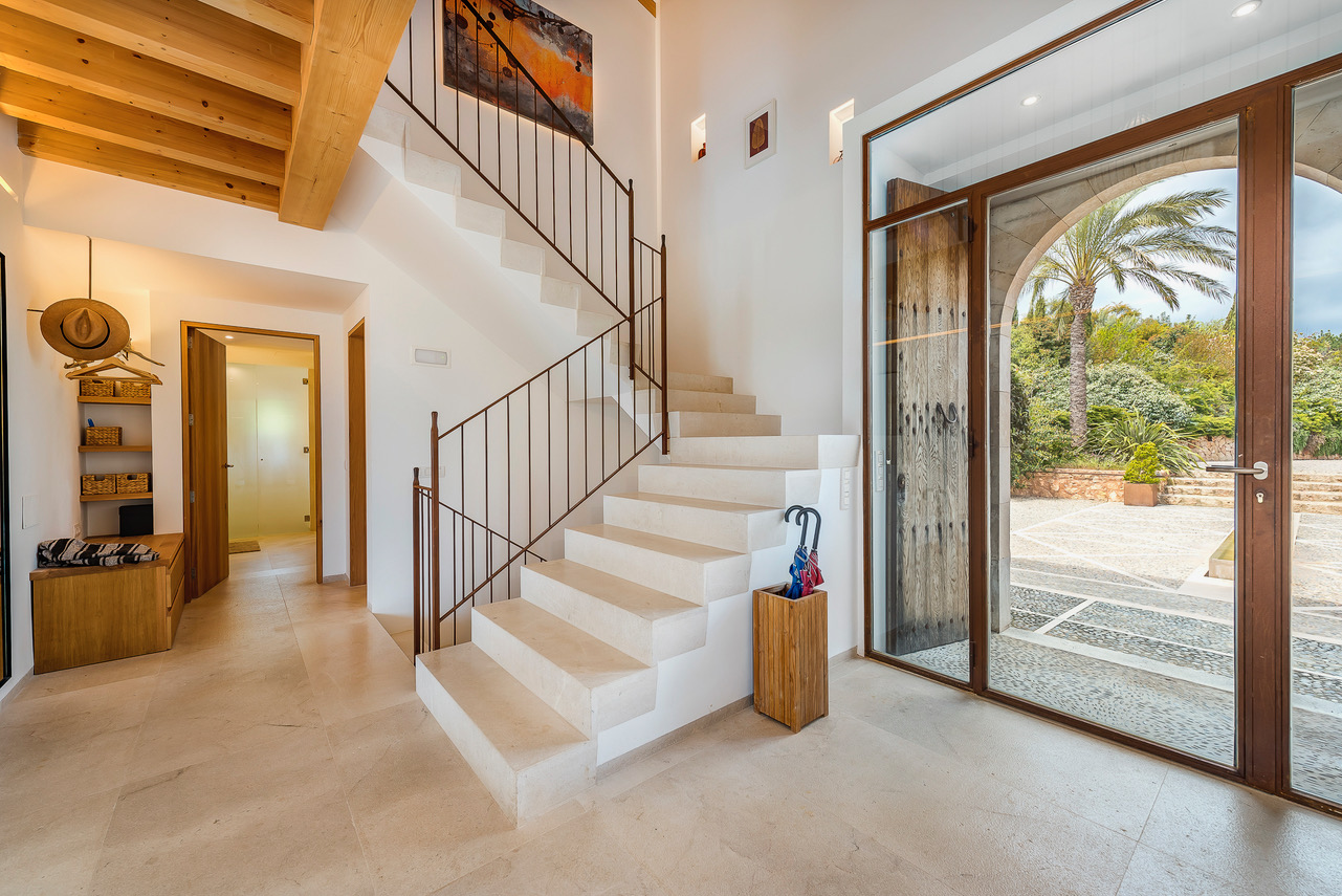 Cette récente Finca de 600 m2 a été construite en alliant parfaitement tradition et modernité. La pierre naturelle des murs extérieurs, que l’on retrouve dans certaines pièces intérieures, donne un c ôté authentique. Les équipements et la décoration que l’on trouve aussi bien dedans que dehors sont modernes et confortables. Les groupes de 10 personnes sont parfaitement à leur aise ici gr âce aux 5 chambres qui disposent toutes de leur propre salle de bain. La chambre de ma ître est un cocon idéal pour les couples : canapé, télévision, terrasse privative ou encore belle baignoire, tout a été pensé pour profiter au maximum de cette pièce. Différents espaces détentes ont été aménagés dans la villa avec un coin salon avec cheminée ou encore un autre avec télévision. Les grandes baies vitrées laissent grandement entrer la lumière et permettent d’observer la verte vue sur le jardin. La salle à manger avec sa large table tout comme la grande cuisine donnent sur une belle terrasse couverte. On peut y manger à l’ombre tout en utilisant le barbecue, ou profiter d’un verre sur les canapés et fauteuils. Une salle de sport très bien équipée est à votre disposition pour vous permettre de maintenir votre forme, même loin de chez vous.
