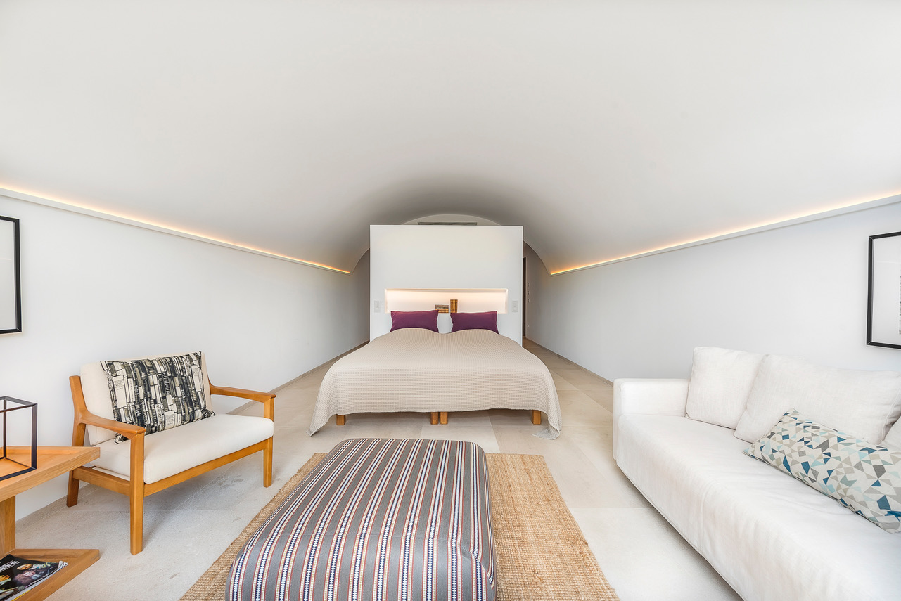 Chambre double avec coin salon et Salle de bain en suite ouverte avec lavabo double, douche
