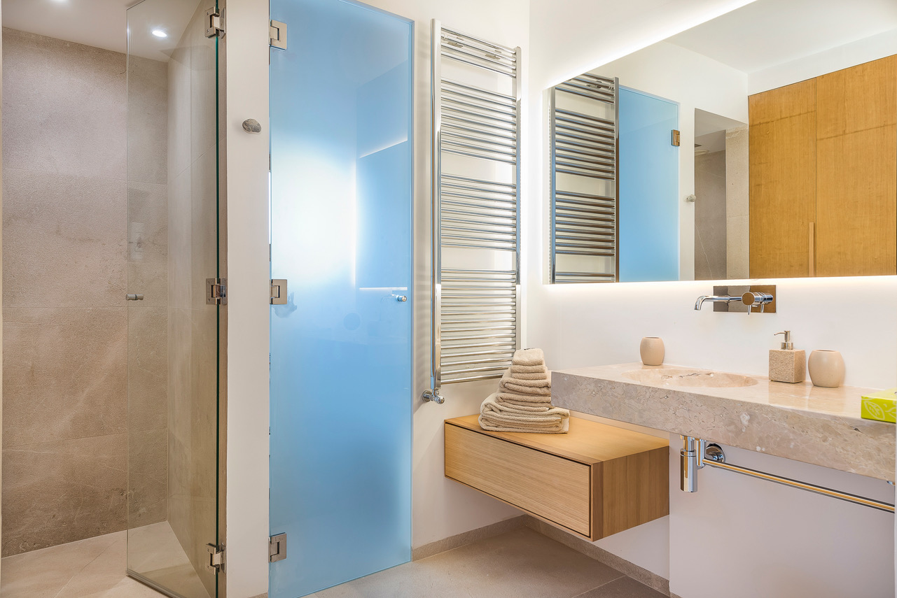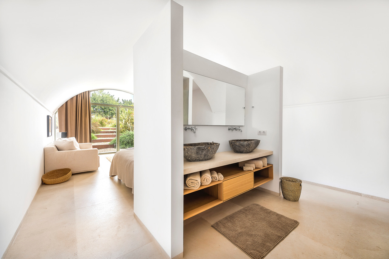 Chambre double avec accès terrasse et Salle de bain en suite ouverte avec lavabo double, douche