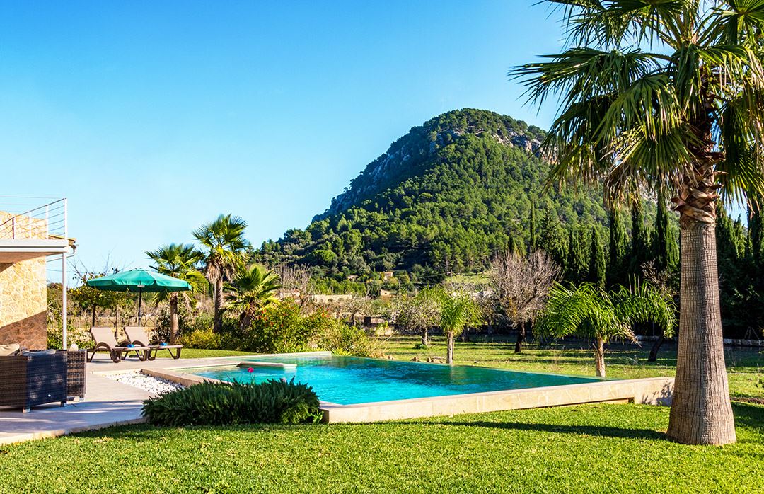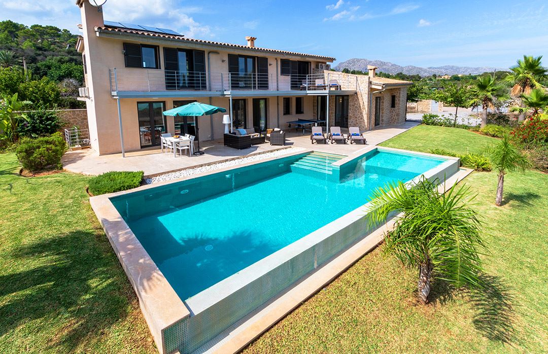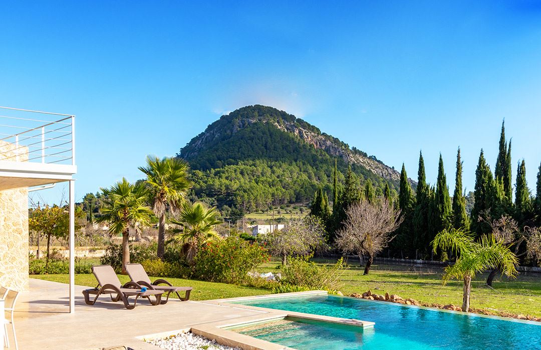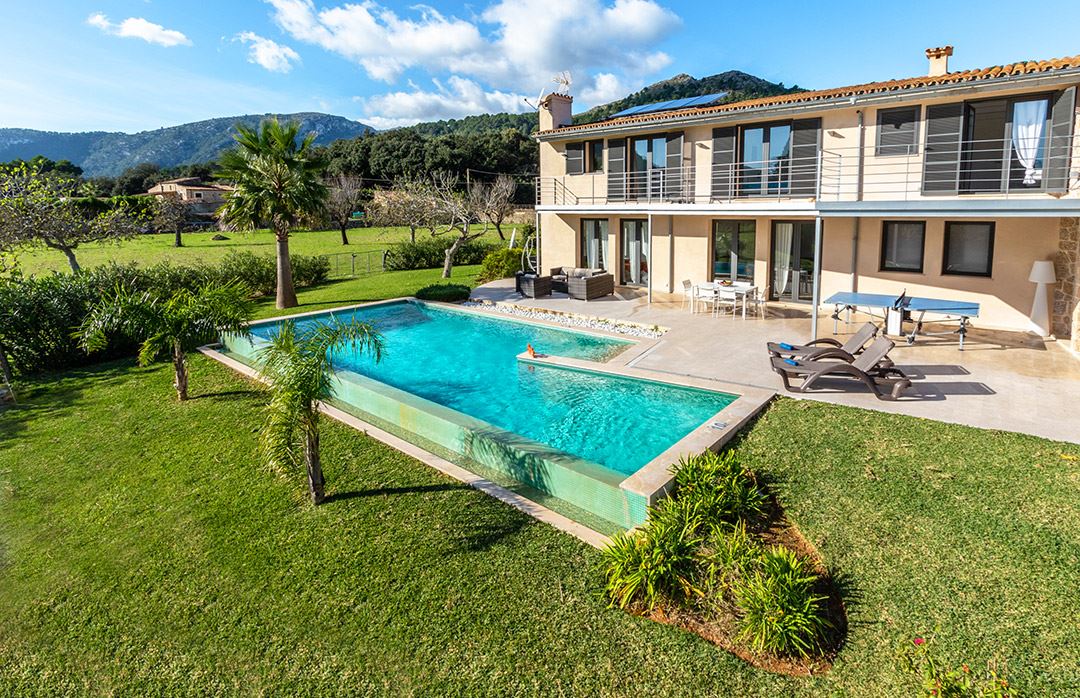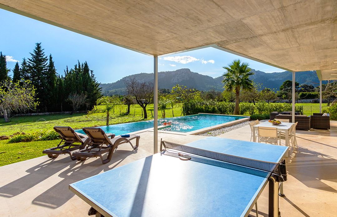 Depuis le jardin, la vue à admirer est totalement dépaysante avec les reliefs qui entourent la maison. La Tramuntana et les champs seront vos voisins de vacances. Pour vos divertissements sans quitter la villa, la grande piscine privée, avec ses 12 x 6 mètres, offre de la place pour tous pour se rafraîchir lors des chaudes journées d’été en extérieur. Une fois à l’intérieur, la climatisation prend le relais pour vous garantir de fraîches et douces nuits. La table de ping pong vous permettra d’organiser de joyeux duels entre amis. Pour celles et ceux qui désirent plutôt profiter tranquillement d’un verre en fin d’après-midi en admirant le beau ciel estival, le salon extérieur sera votre endroit préféré.