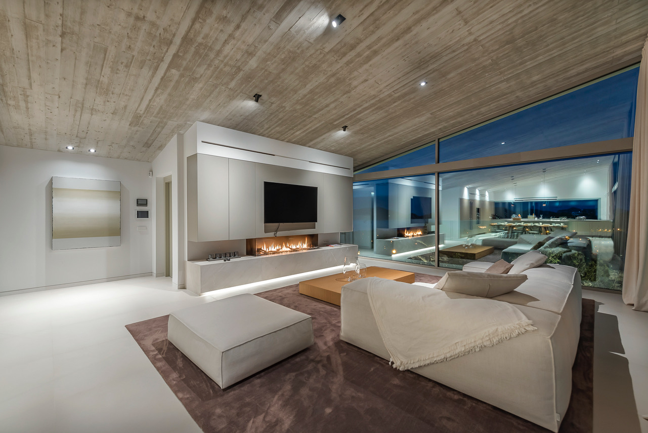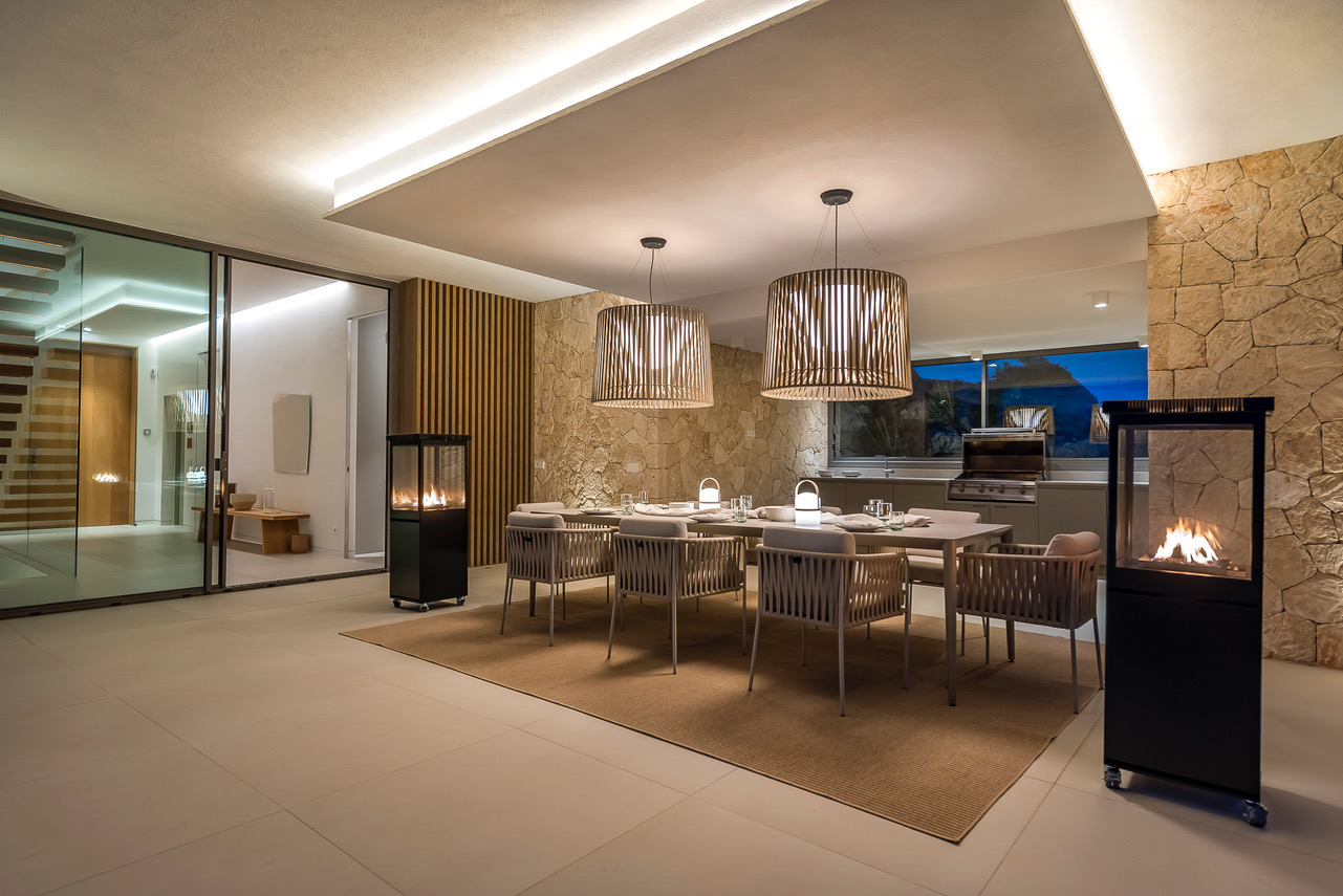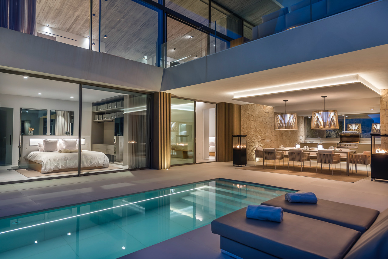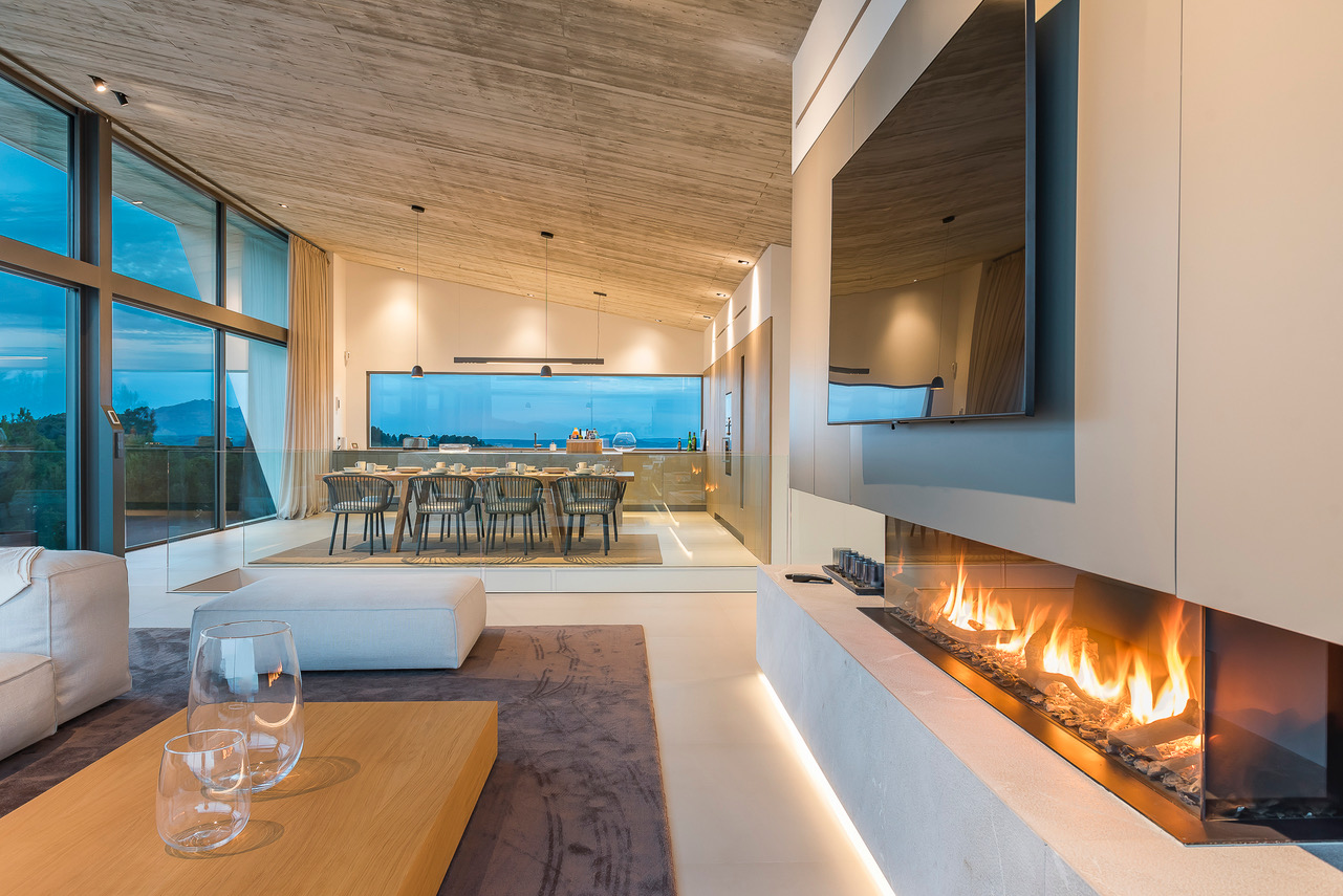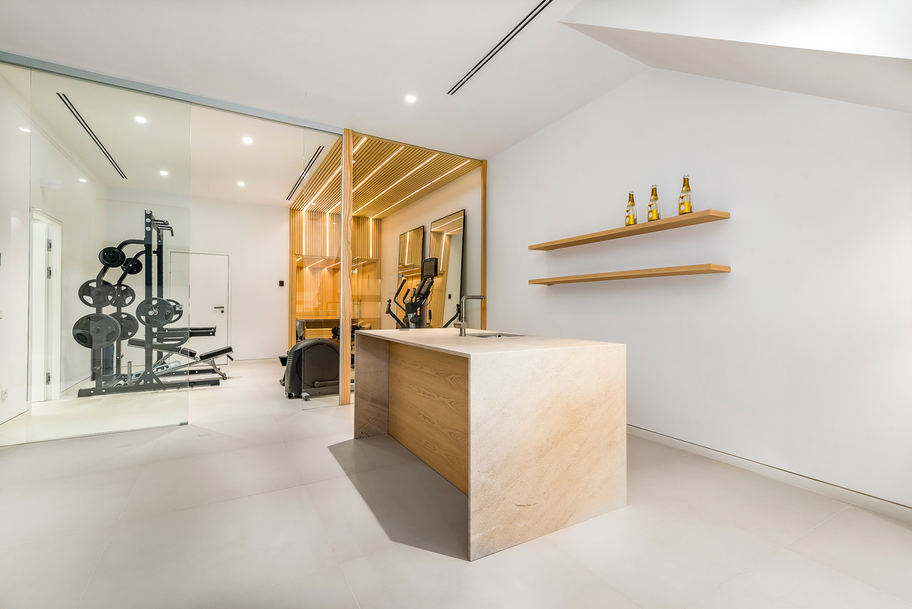 Au niveau de l’entrée se trouve l’espace nuit avec les 4 chambres doubles et salles de bain. Une belle terrasse y a été également aménagée. Cuisine d’été extérieure, barbecue, grande table et éclairage font de ce lieu l’endroit idéal pour profiter de délicieux repas. La piscine permet de faire de belles longueurs tout en profitant d’une magnifique vue sur la mer et sur les reliefs alentours. A l’étage, une grande pièce divisée en deux continue d’offrir là encore une vue exceptionnelle sur la nature environnante gr âce à ses grandes baies vitrées. Le salon avec sa cheminée au gaz, une fois allumée, confère à l’endroit une ambiance relaxante de cocooning. Les touches de couleurs au plafond et au sol avec les tapis apportent un c ôté encore plus chaleureux. Le mobilier est moderne et de grande qualité. Une deuxième terrasse à cet étage permet de profiter d’un salon extérieur et surtout d’un grand bassin avec jacuzzi. Un ascenseur vous mènera au sous-sol qui est composé d’un salon avec une salle de fitness et un sauna pour des moments de bien- être.