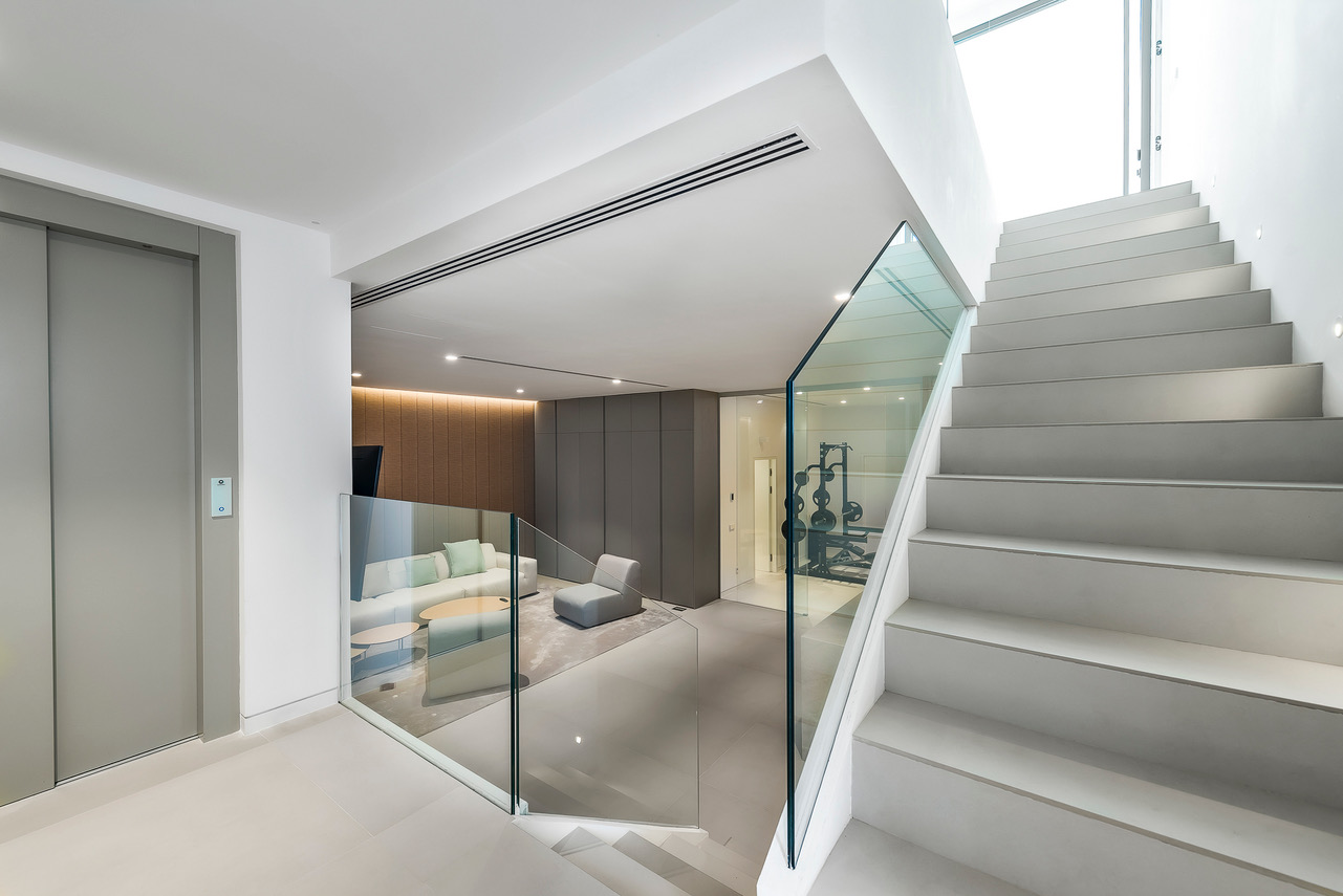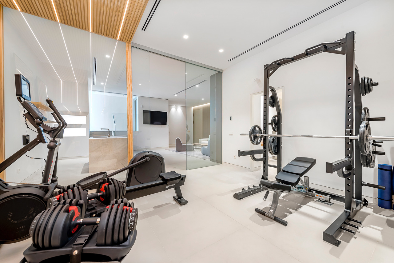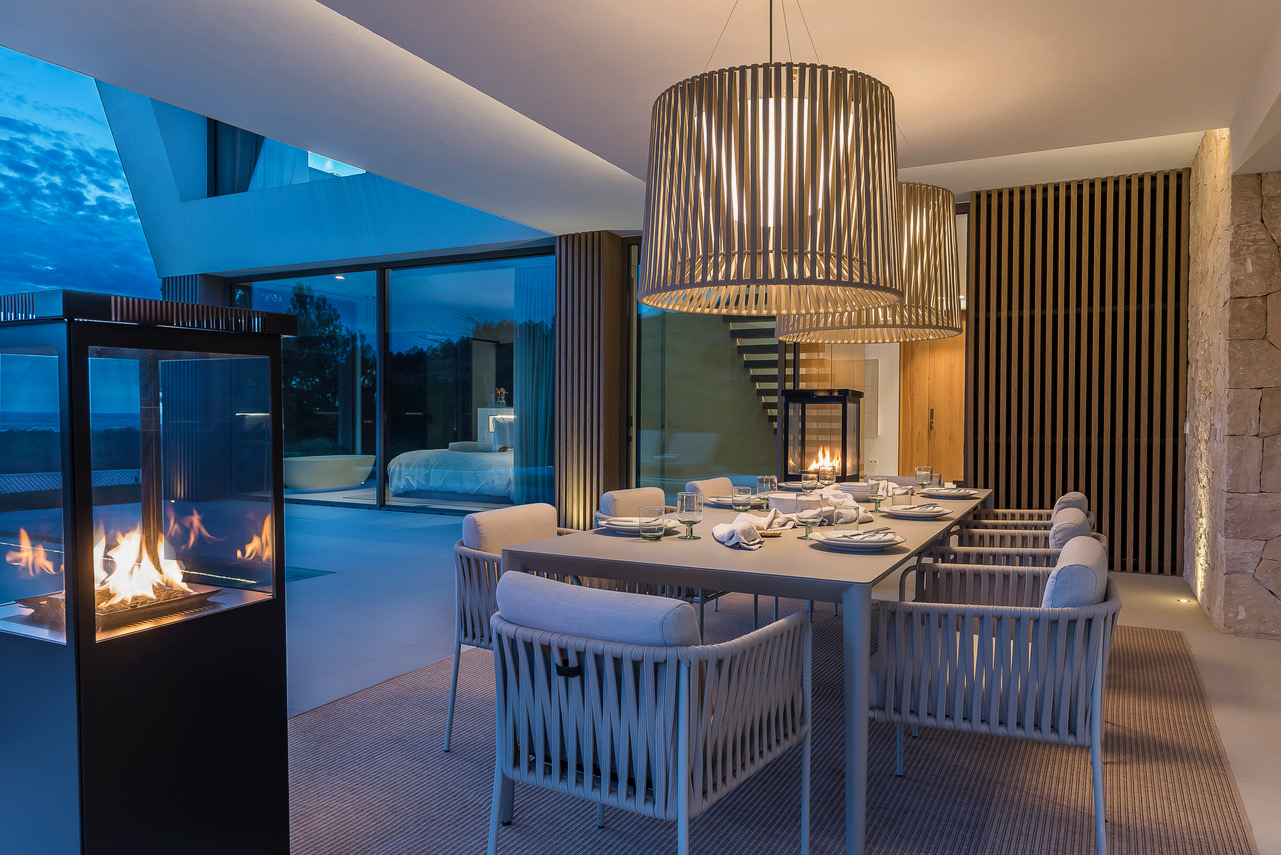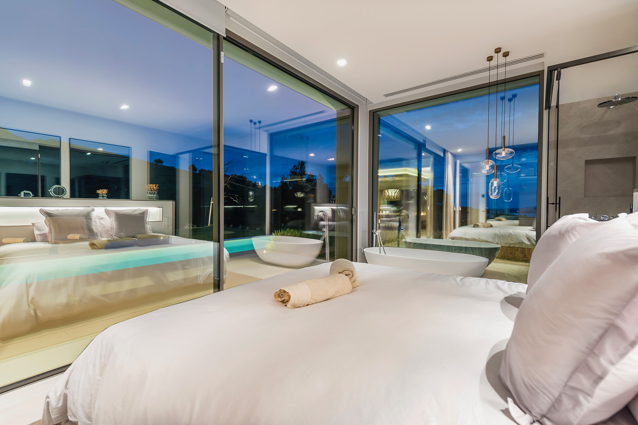 Au niveau de l’entrée se trouve l’espace nuit avec les 4 chambres doubles et salles de bain. Une belle terrasse y a été également aménagée. Cuisine d’été extérieure, barbecue, grande table et éclairage font de ce lieu l’endroit idéal pour profiter de délicieux repas. La piscine permet de faire de belles longueurs tout en profitant d’une magnifique vue sur la mer et sur les reliefs alentours. A l’étage, une grande pièce divisée en deux continue d’offrir là encore une vue exceptionnelle sur la nature environnante gr âce à ses grandes baies vitrées. Le salon avec sa cheminée au gaz, une fois allumée, confère à l’endroit une ambiance relaxante de cocooning. Les touches de couleurs au plafond et au sol avec les tapis apportent un c ôté encore plus chaleureux. Le mobilier est moderne et de grande qualité. Une deuxième terrasse à cet étage permet de profiter d’un salon extérieur et surtout d’un grand bassin avec jacuzzi. Un ascenseur vous mènera au sous-sol qui est composé d’un salon avec une salle de fitness et un sauna pour des moments de bien- être.