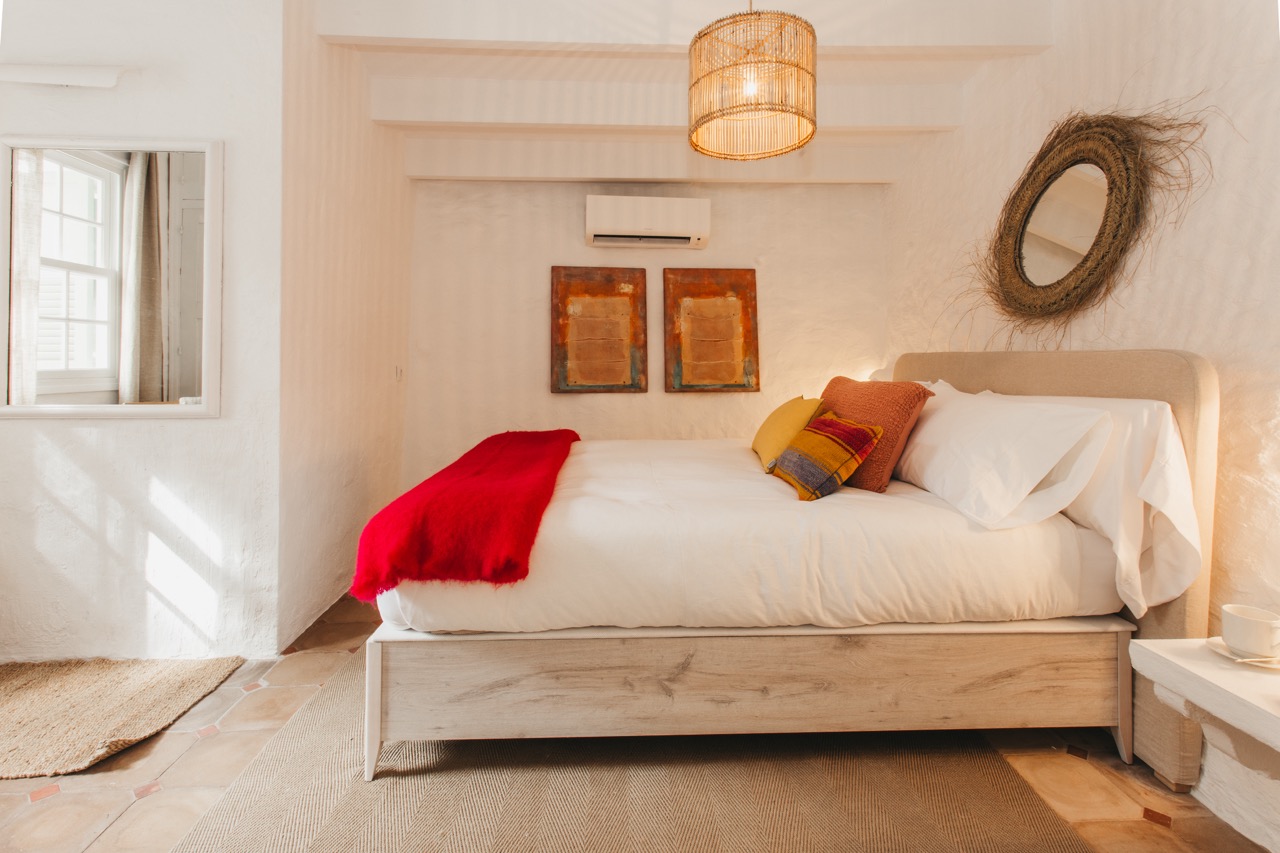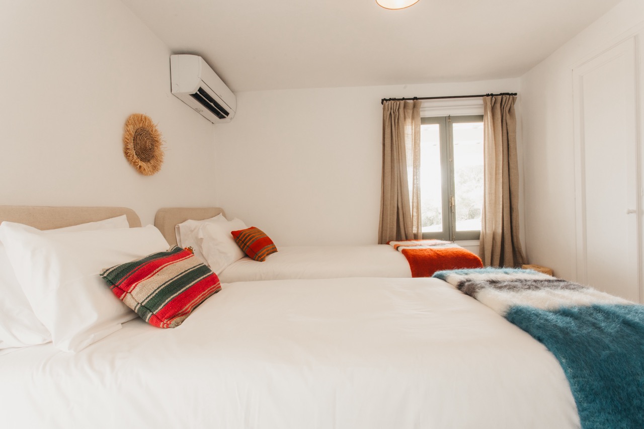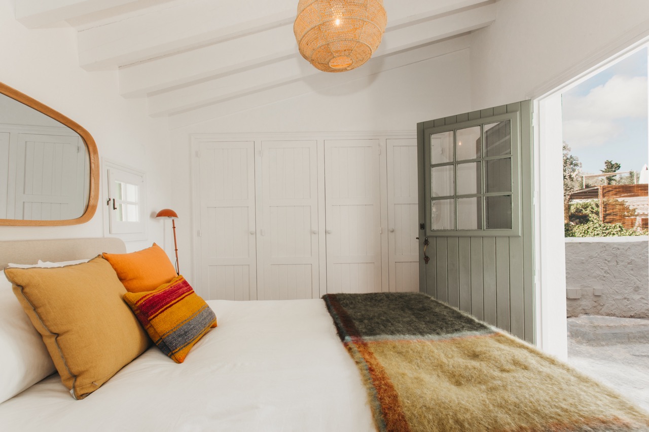 À l’intérieur de la maison principale, se trouvent deux chambres doubles au rez-de-chaussée et une troisième chambre double à l’étage. Cette chambre du haut possède une terrasse privée avec vue sur Mahón et la nature environnante, aménagée avec des lits de repos et un espace détente extérieur. Elle est également reliée à un escalier menant directement à la piscine.