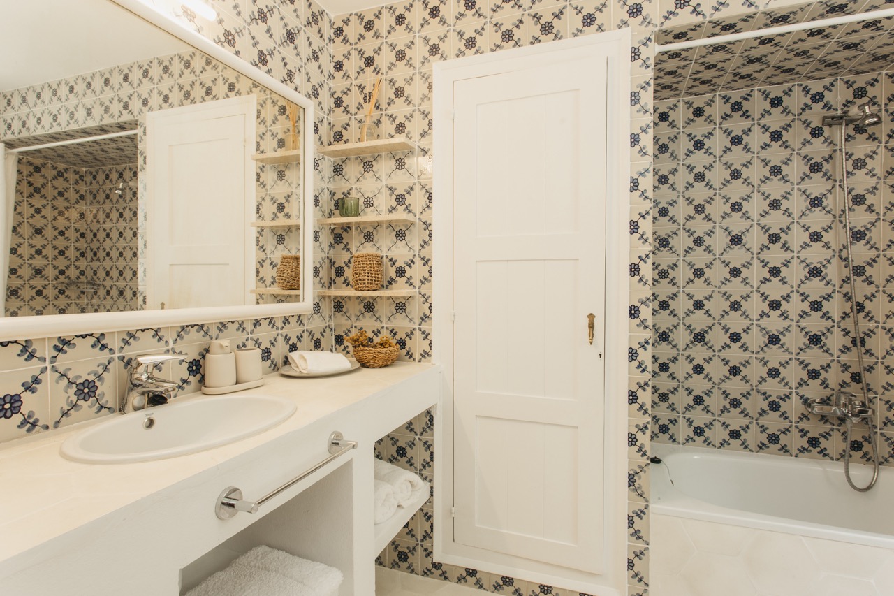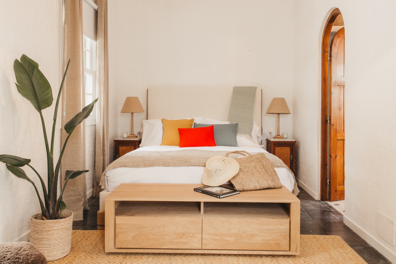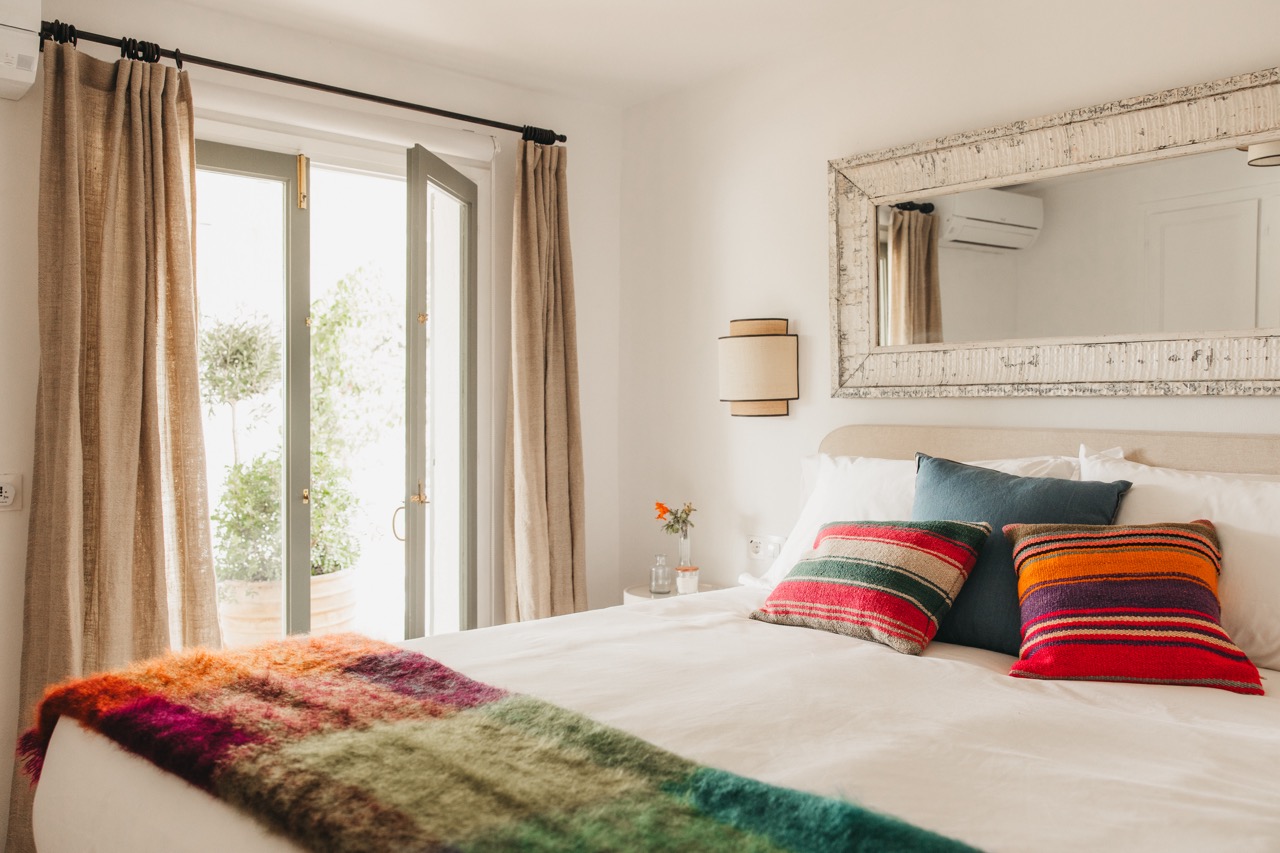 À l’intérieur de la maison principale, se trouvent deux chambres doubles au rez-de-chaussée et une troisième chambre double à l’étage. Cette chambre du haut possède une terrasse privée avec vue sur Mahón et la nature environnante, aménagée avec des lits de repos et un espace détente extérieur. Elle est également reliée à un escalier menant directement à la piscine.