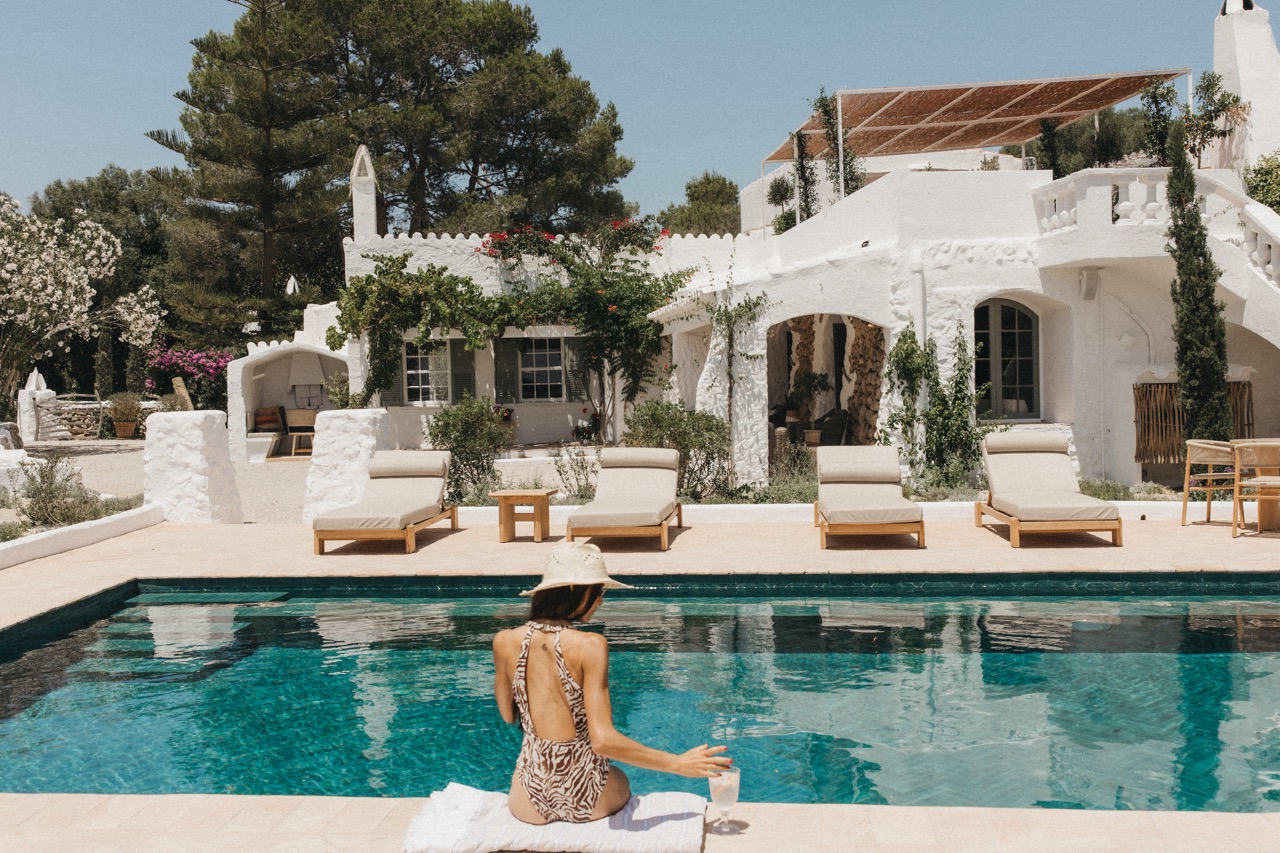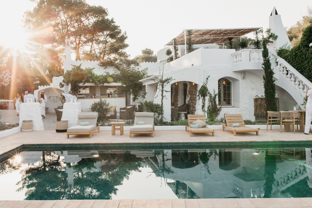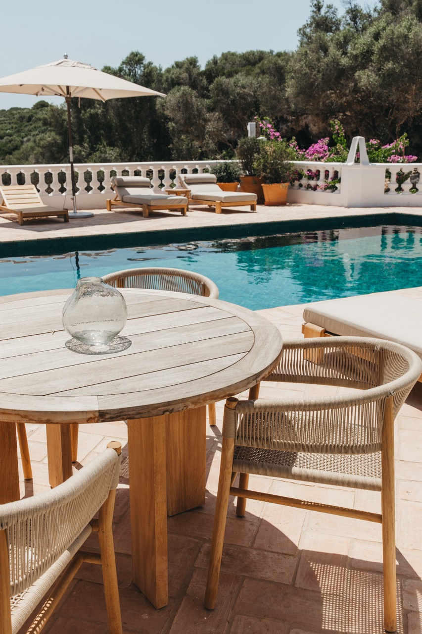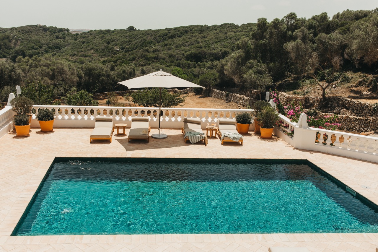 En sortant de la cuisine, un chemin bordé d’arbustes mène à la piscine : une piscine d’eau salée moderne, élégante et récemment rénovée, avec vue sur la campagne et Mahón.