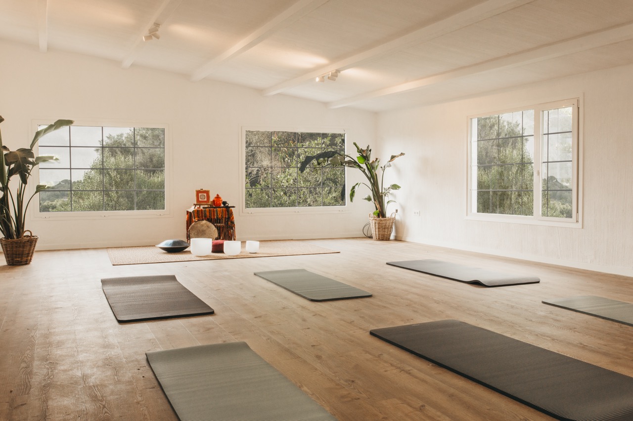En entrant sur le domaine, le parking se trouve sur la droite et le studio de yoga/gym sur la gauche.