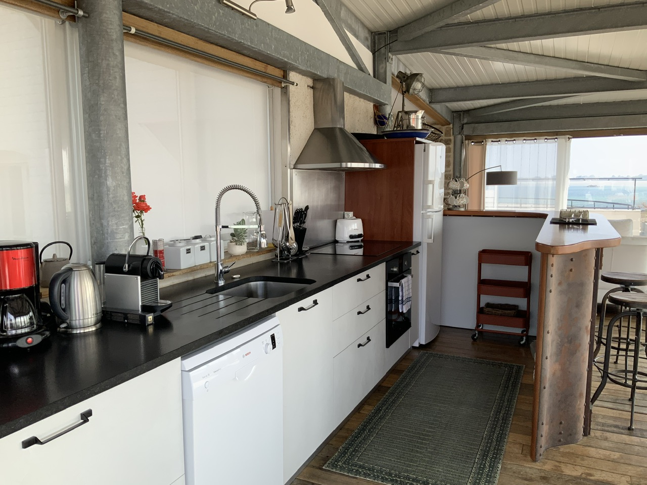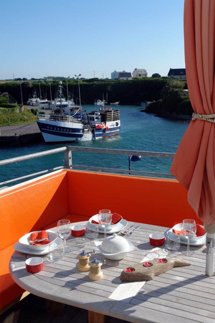 Salon - salle à manger avec chaine hifi, home cinema, télévision, lecteur dvd, internet, cheminée, vue mer et Cuisine ouverte avec congélateur, réfrigérateur, lave linge, sèche linge, lave vaisselle, four électrique, machine à expresso, four micro ondes et Terrasse aménagée en bois avec vue sur le port