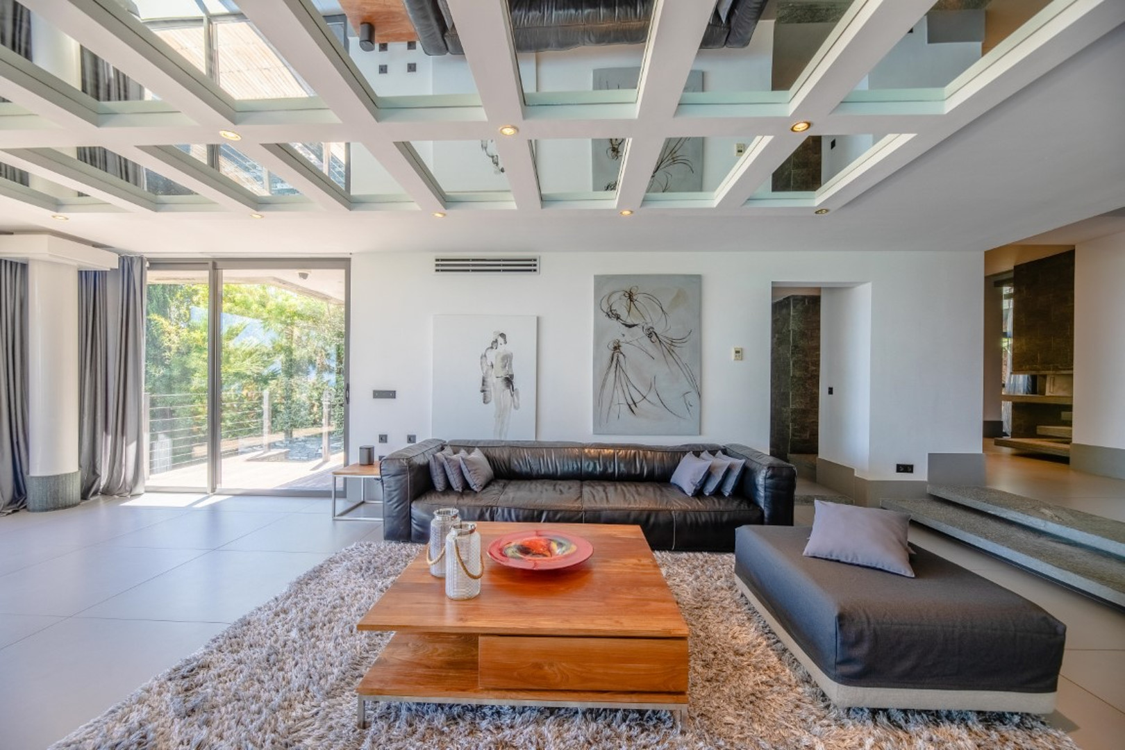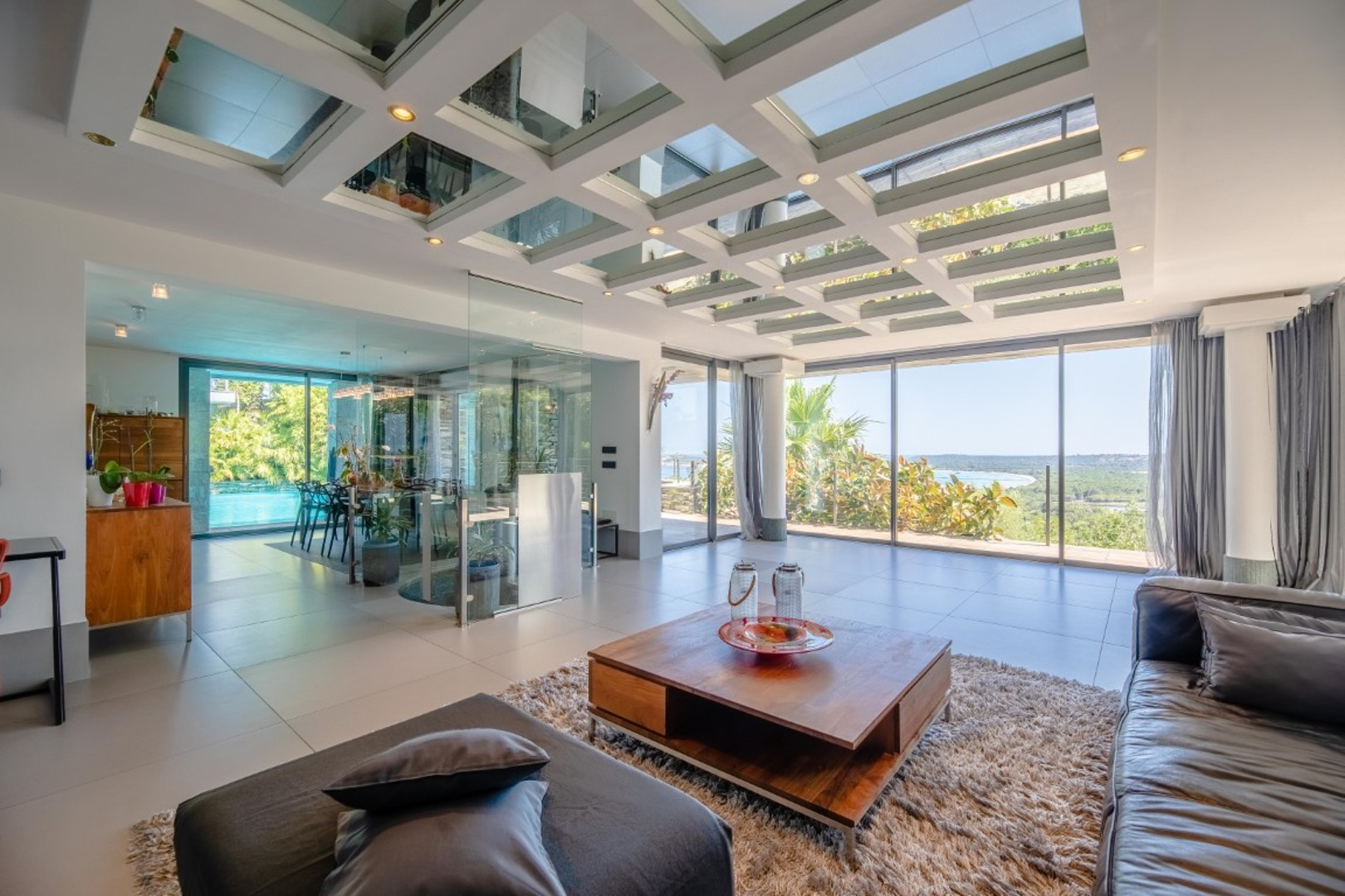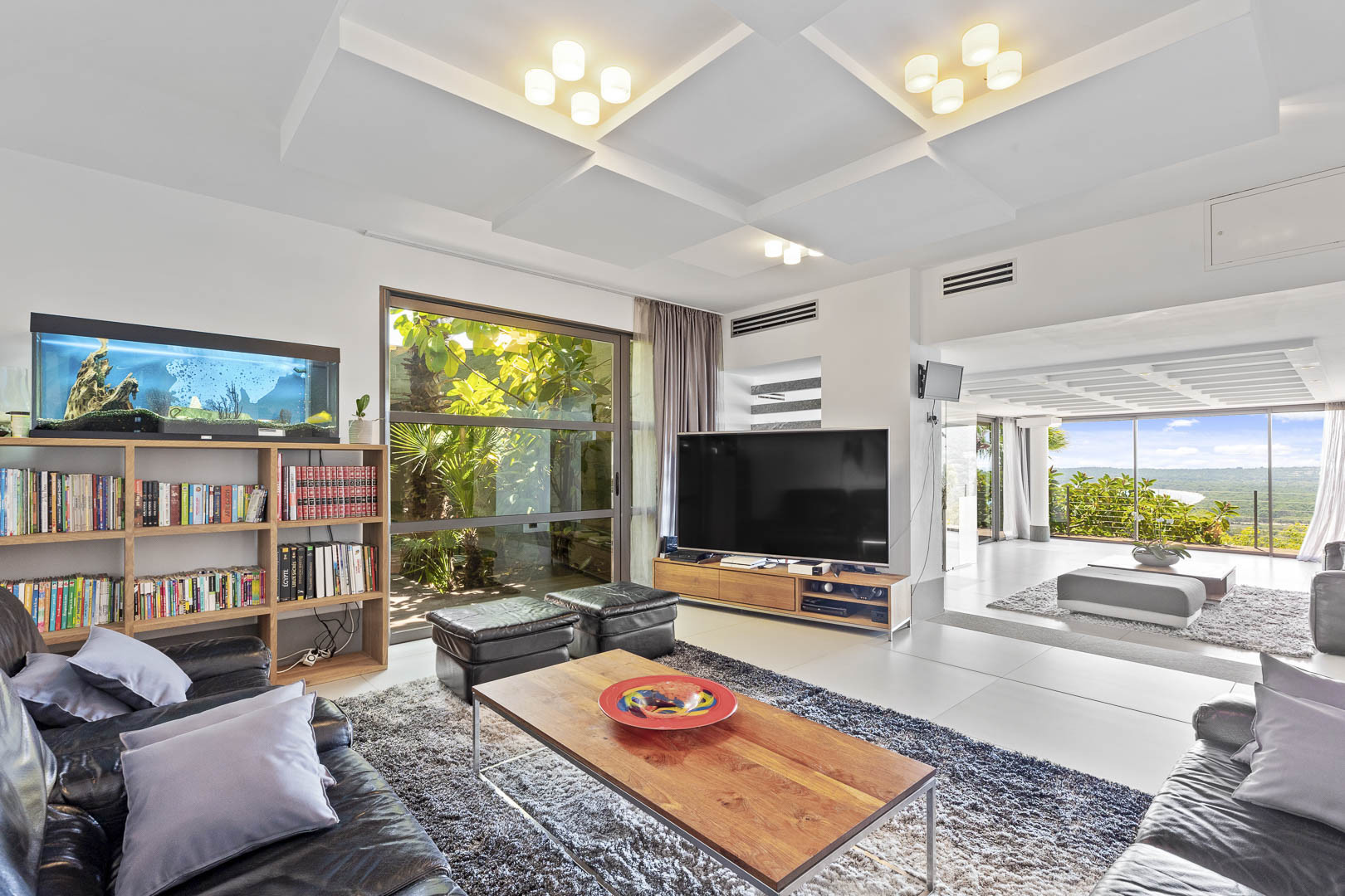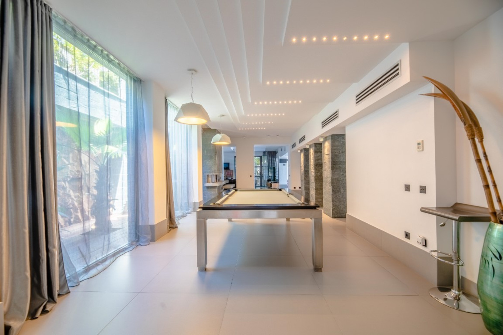 Salon - salle à manger : un grand séjour lumineux, de 150 m2 (avec espace repas pour 12-14 personnes, salle TV, salle de billard, et petit espace bureau) avec accès terrasse, climatisation, vue mer, vue jardin, billard, télévision plasma, cable
