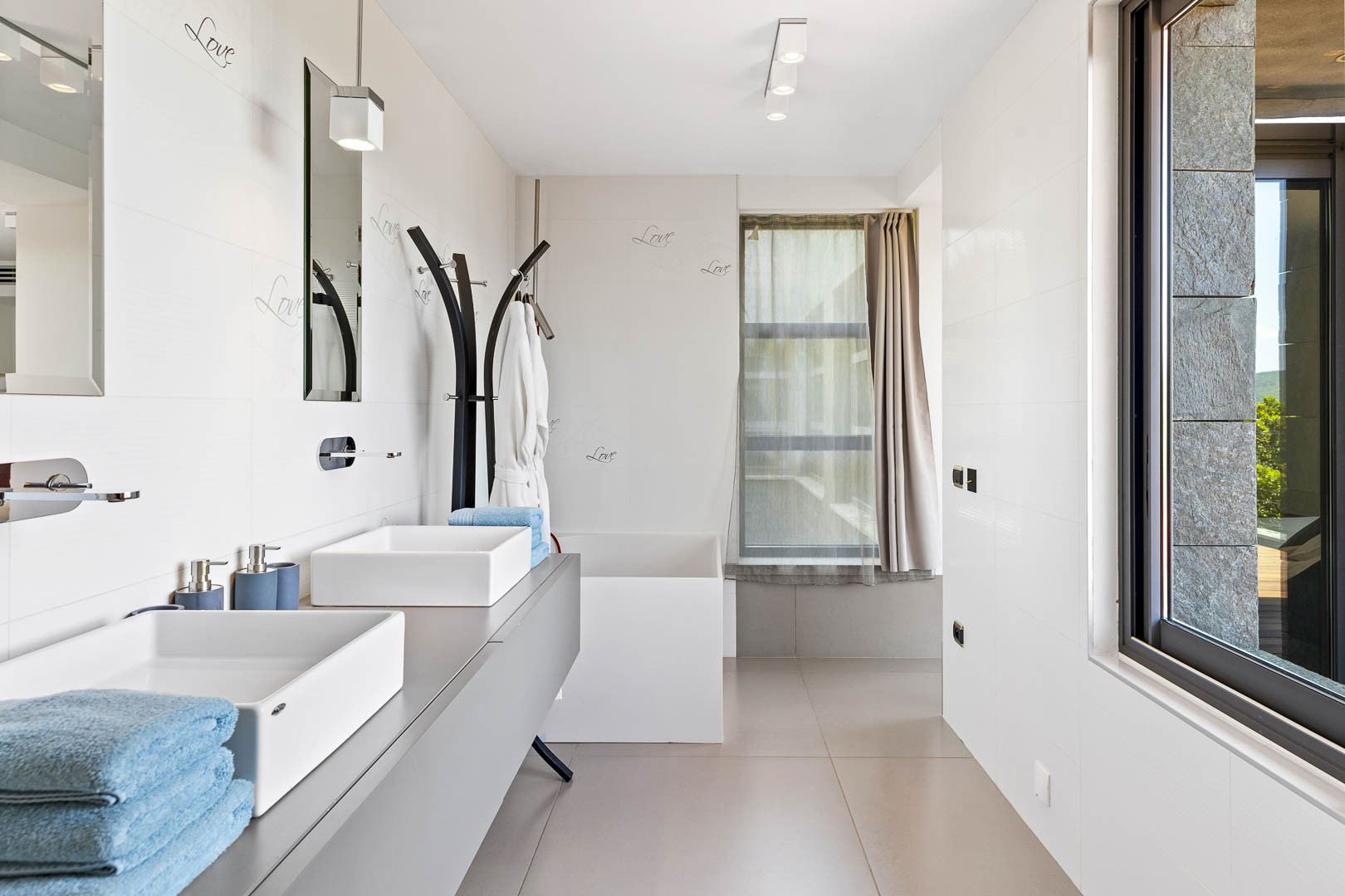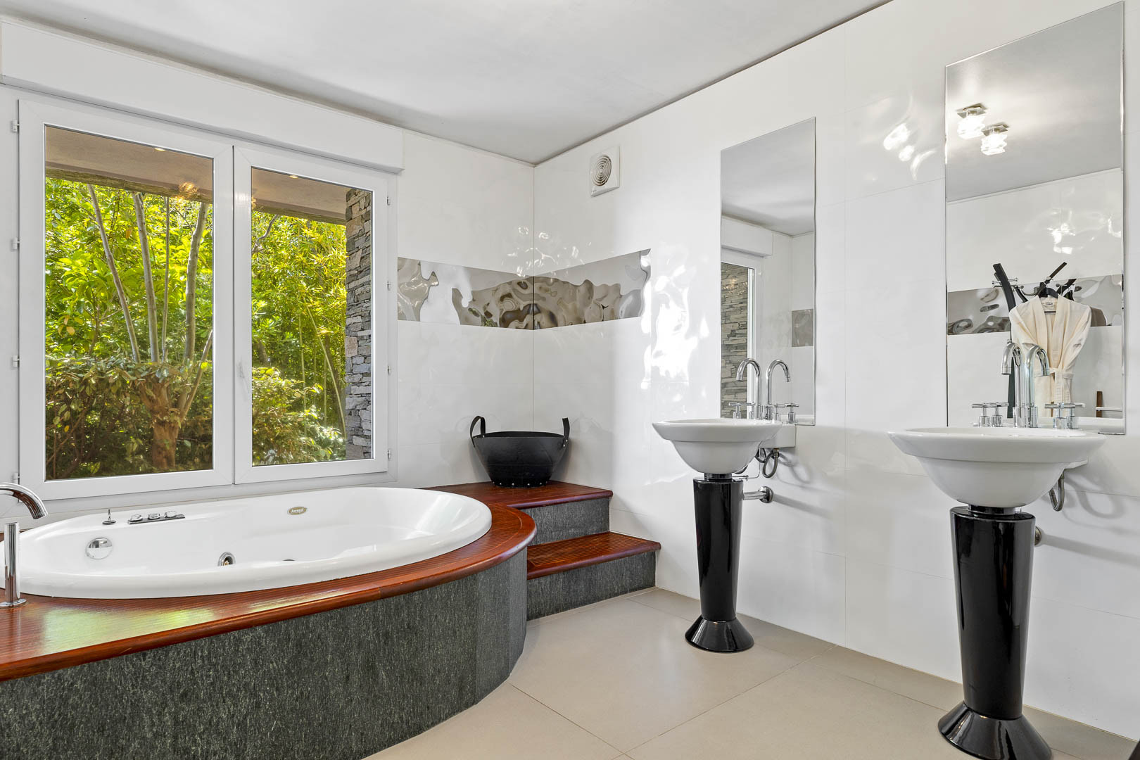 Chambre double 20 m2 avec vue mer, accès terrasse, lit 160 et Salle de bain en suite avec baignoire, lavabo double, wc