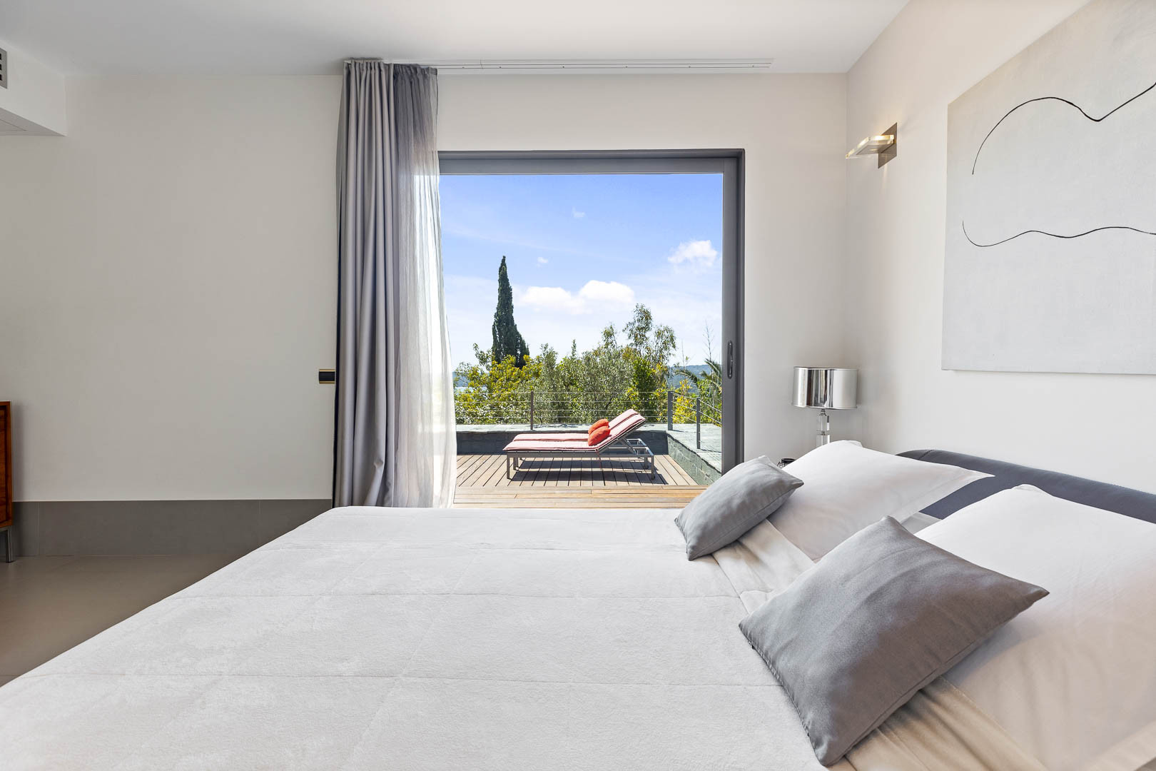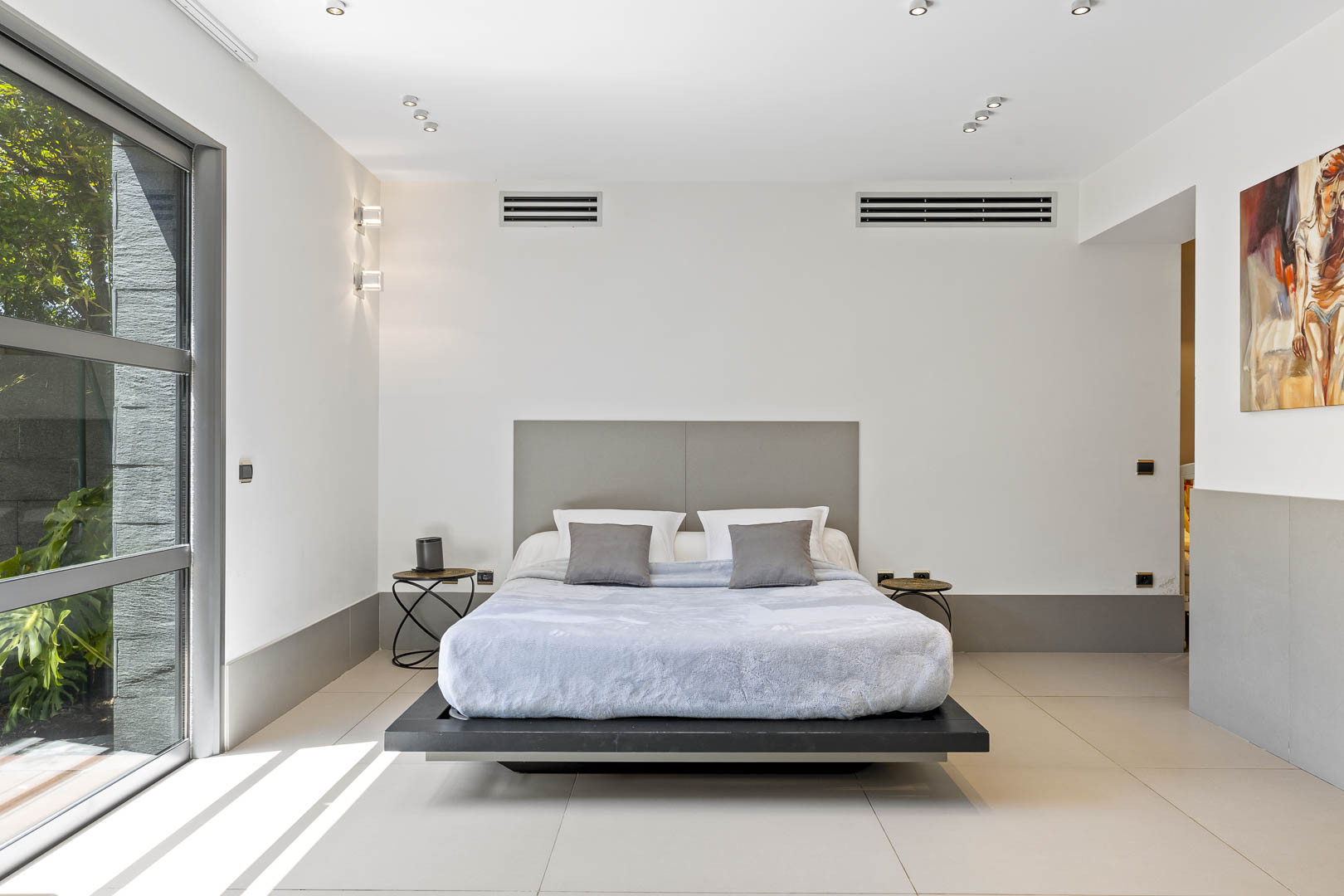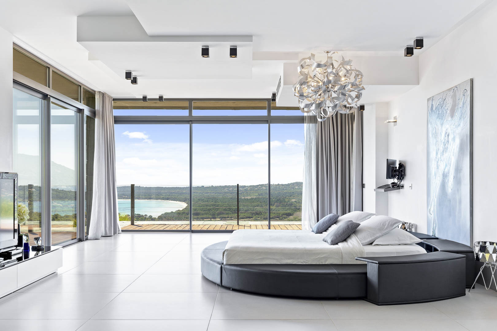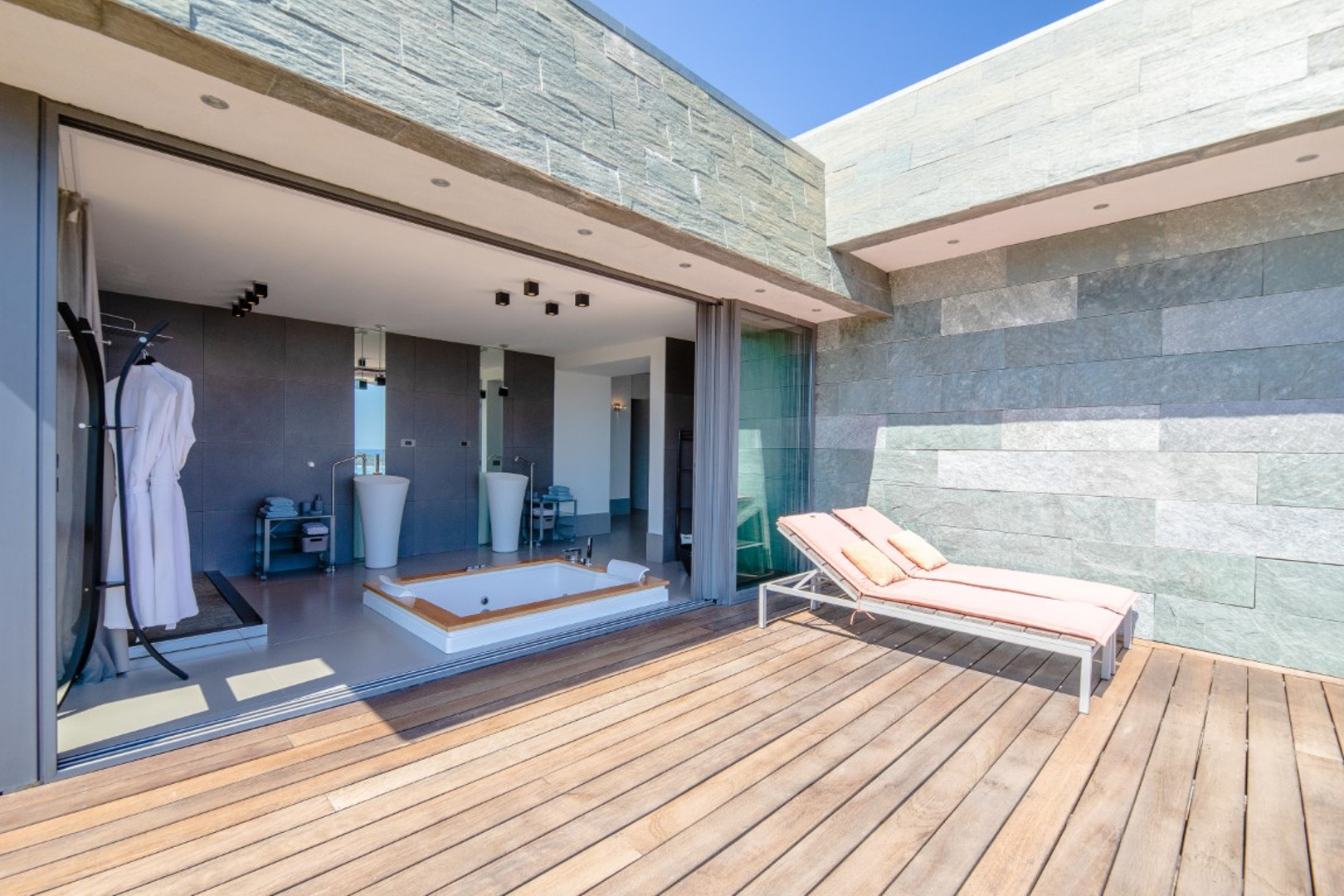 Chambre de Maître 70 m2 avec deux poufs convertible en lit avec lit 160, dressing, accès terrasse, vue mer, télévision et Salle de bain en suite avec baignoire, hydro massage, lavabo double, douche et Terrasse en teck avec mobilier de jardin, éclairée la nuit, mais aussi solarium sur le toit avec lit bas et vue à 360° sur la mer