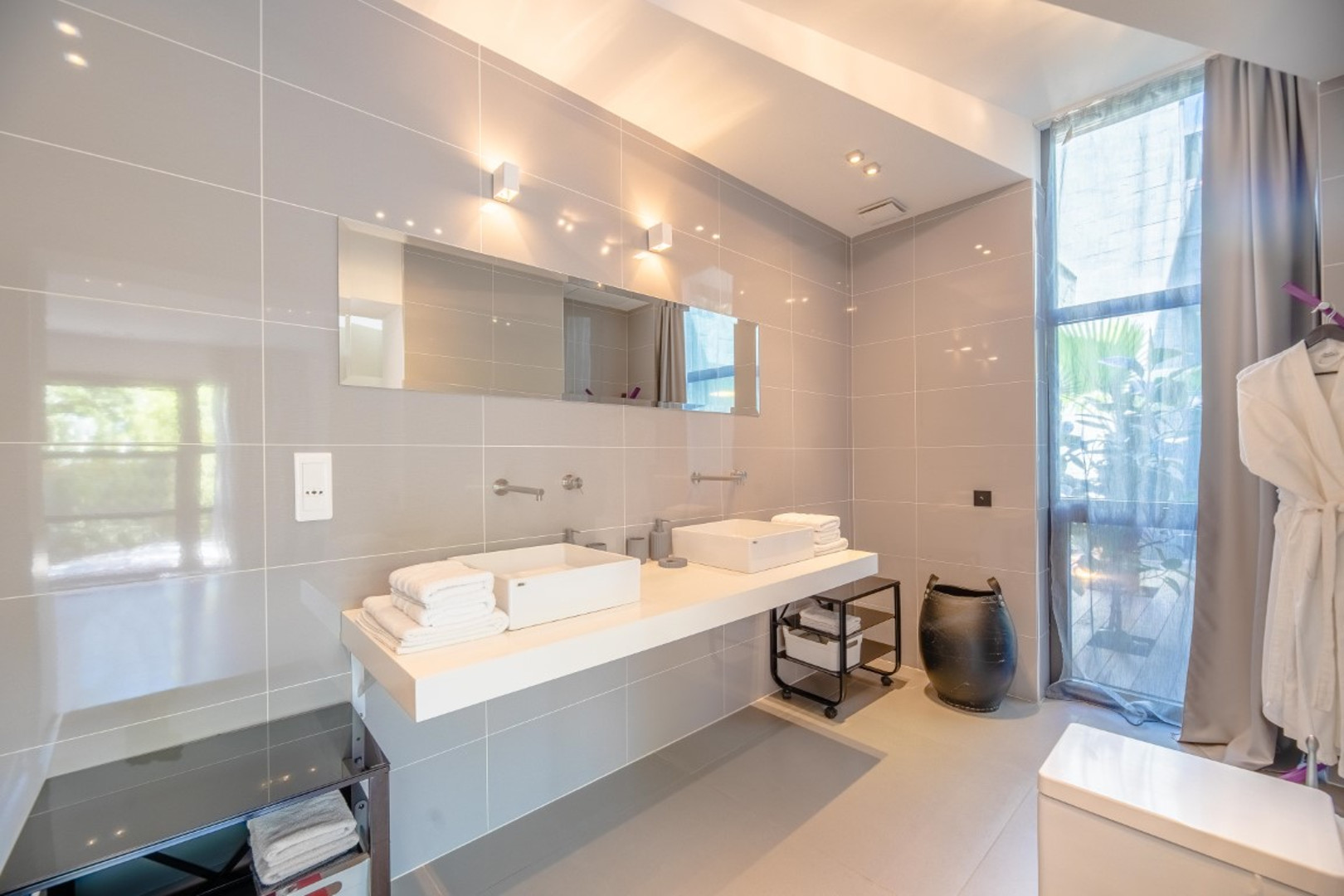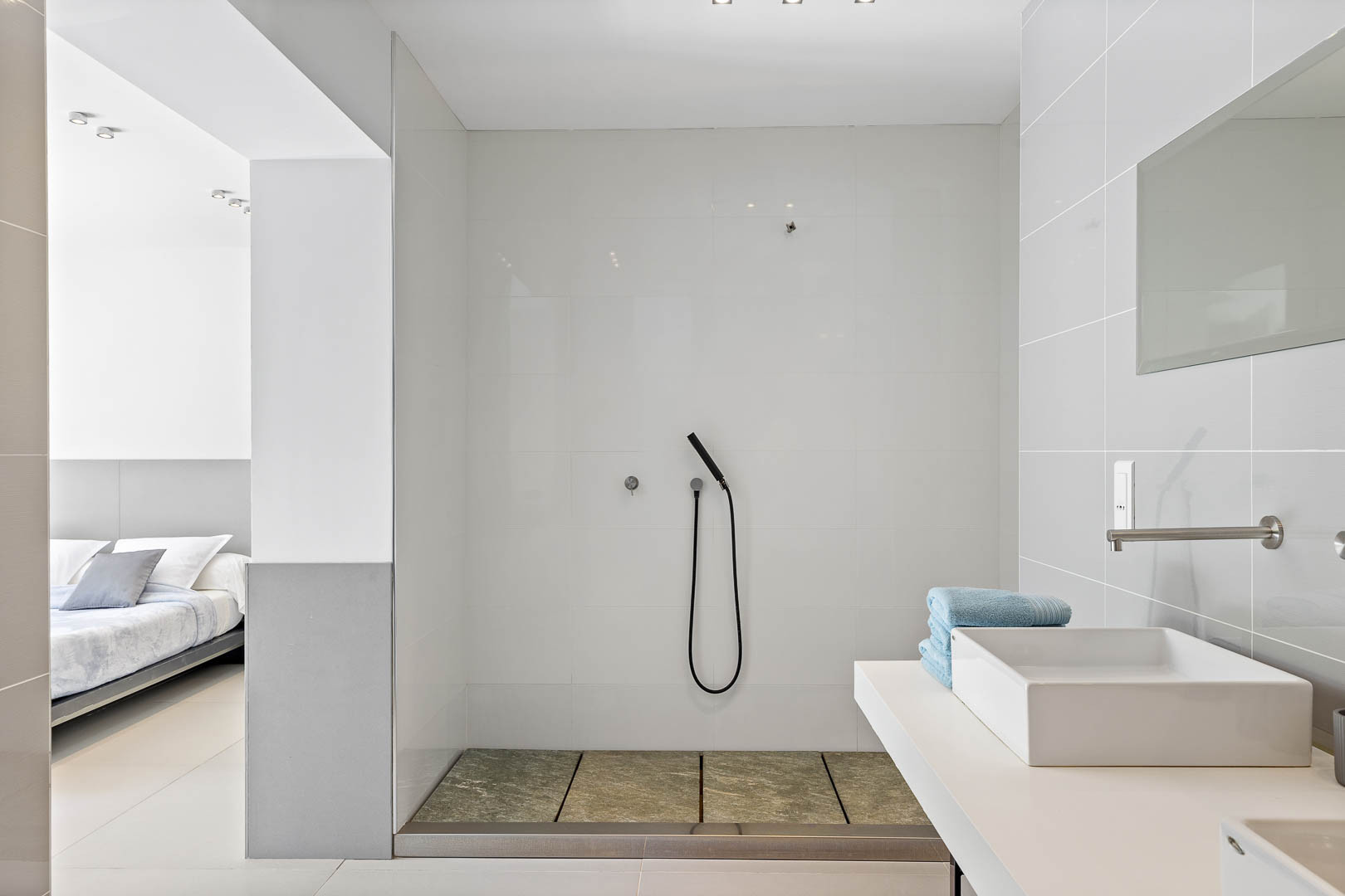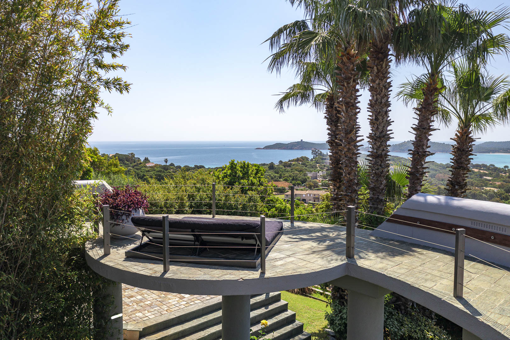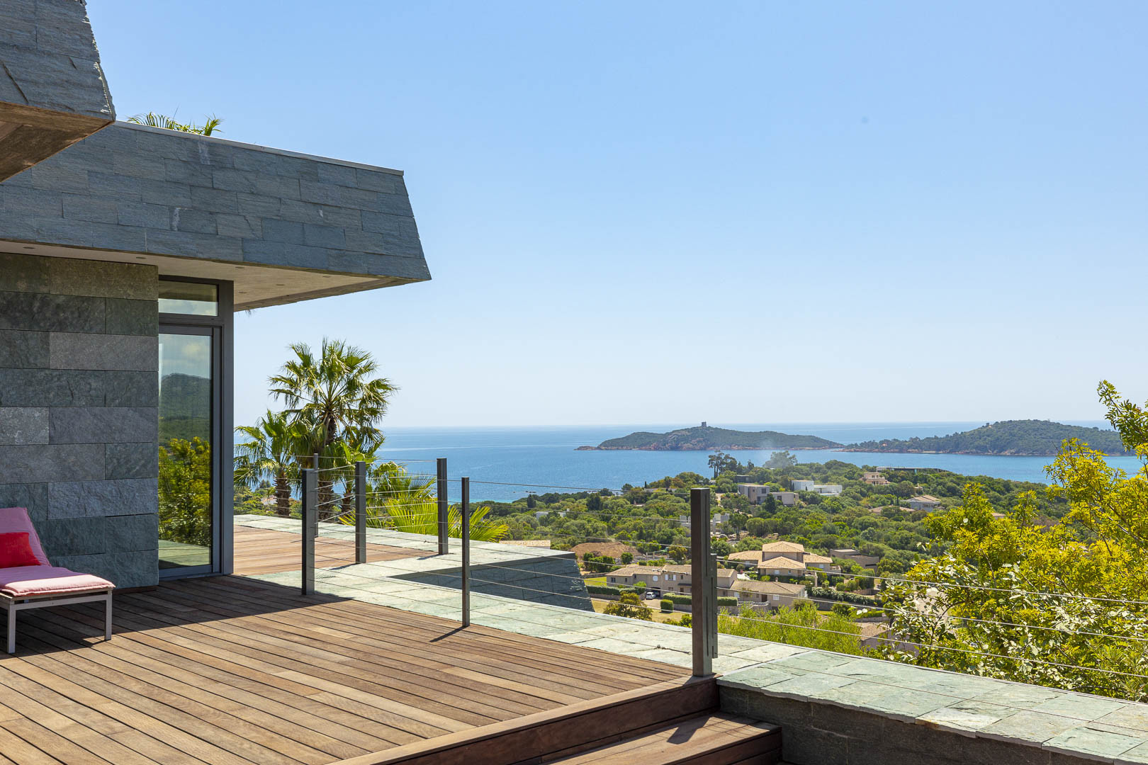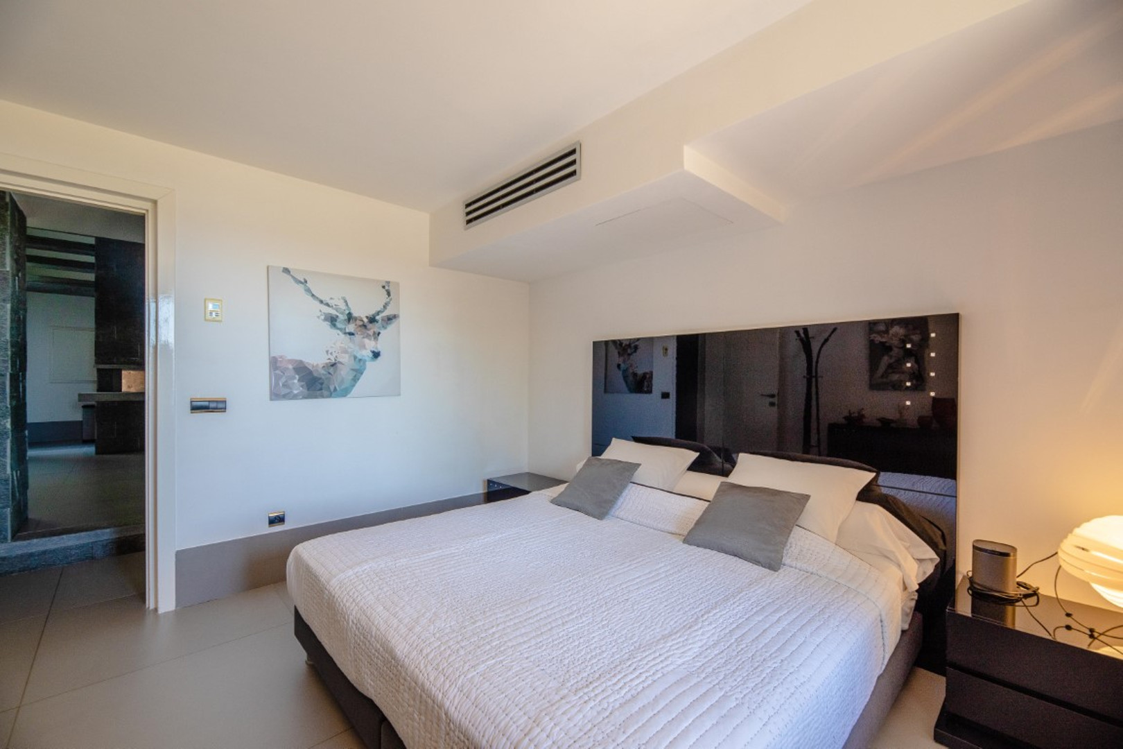 Chambre de Maître 70 m2 avec deux poufs convertible en lit avec lit 160, dressing, accès terrasse, vue mer, télévision et Salle de bain en suite avec baignoire, hydro massage, lavabo double, douche et Terrasse en teck avec mobilier de jardin, éclairée la nuit, mais aussi solarium sur le toit avec lit bas et vue à 360° sur la mer
