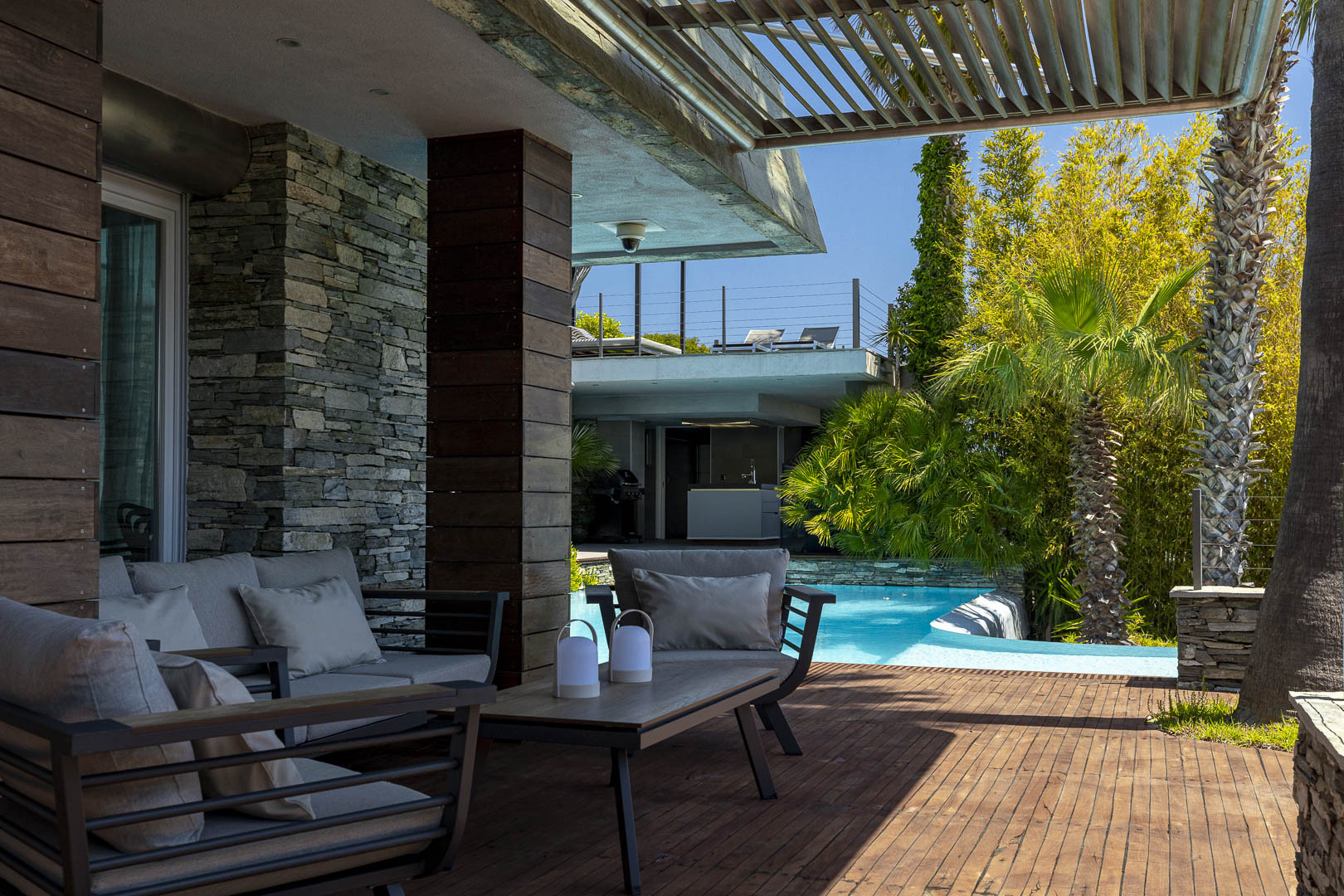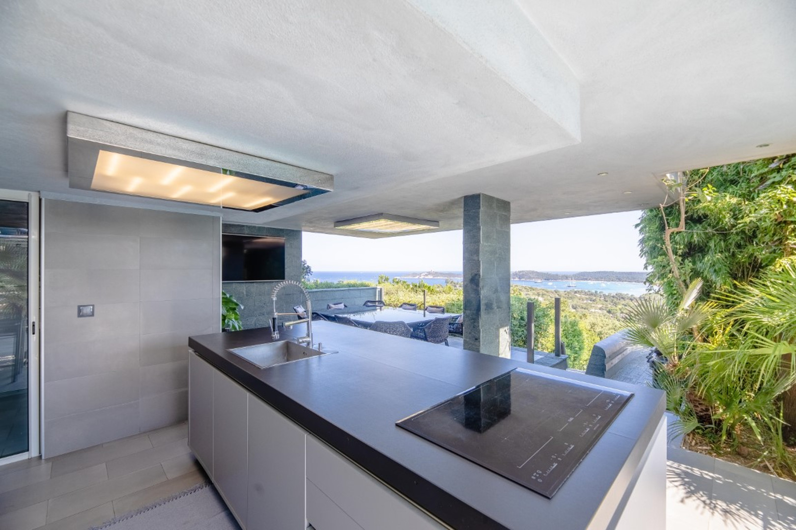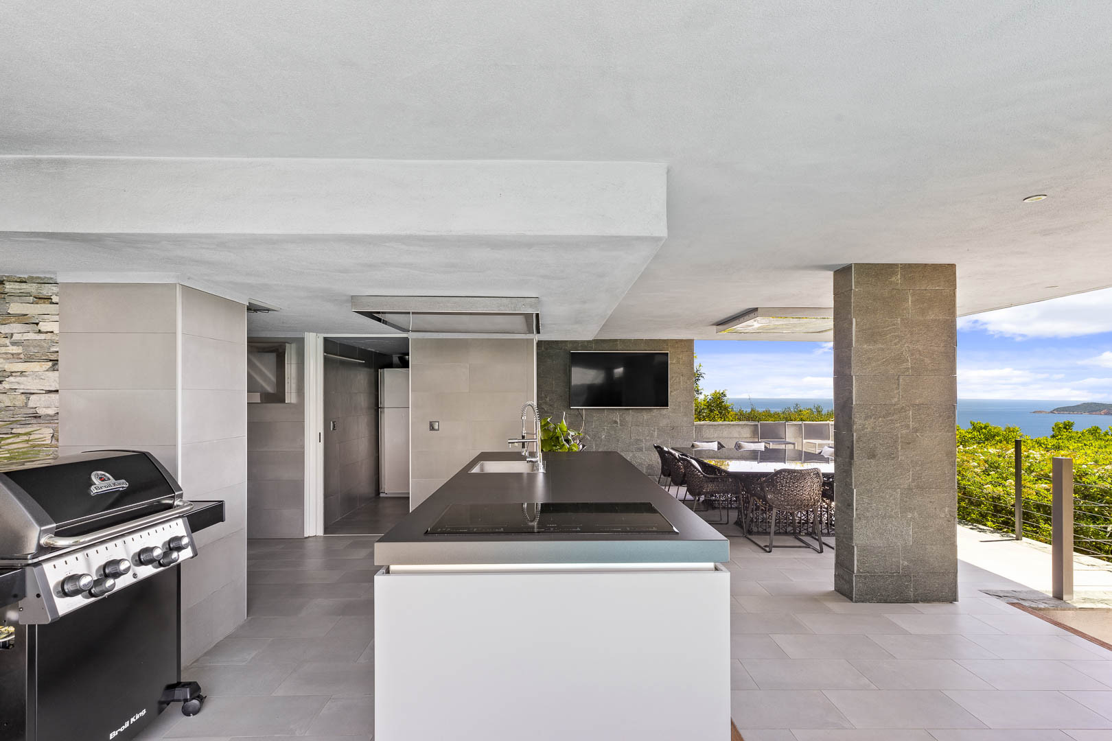 Cuisine d’été avec coin détente avec cafetière nespresso, congélateur, four électrique, réfrigérateur, grille pain, lave vaisselle, four micro ondes, machine à expresso, machine à glacons, barbecue, lave vaisselle, plaques à induction